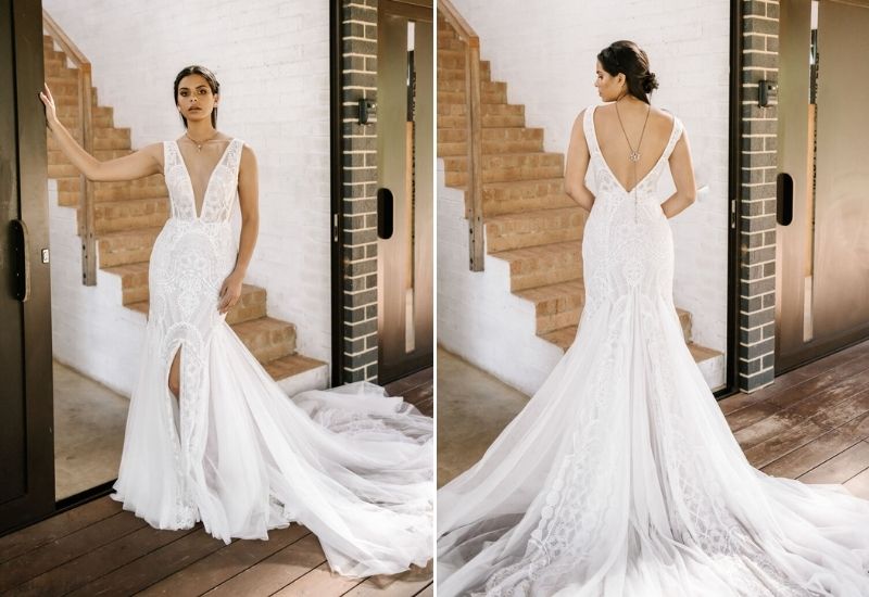 Além de destacar a sensualidade da mulher, o decote cria uma linha vertical que alonga a silhueta, dando um caimento perfeito para noivas com diversos formatos de corpo.