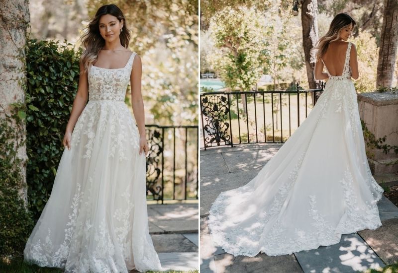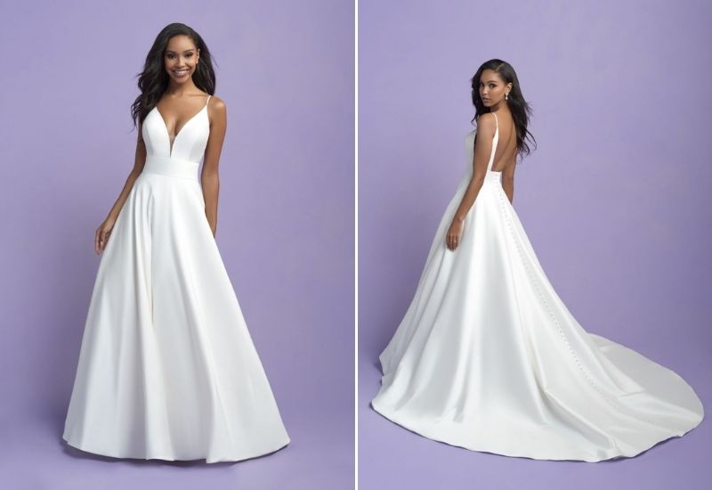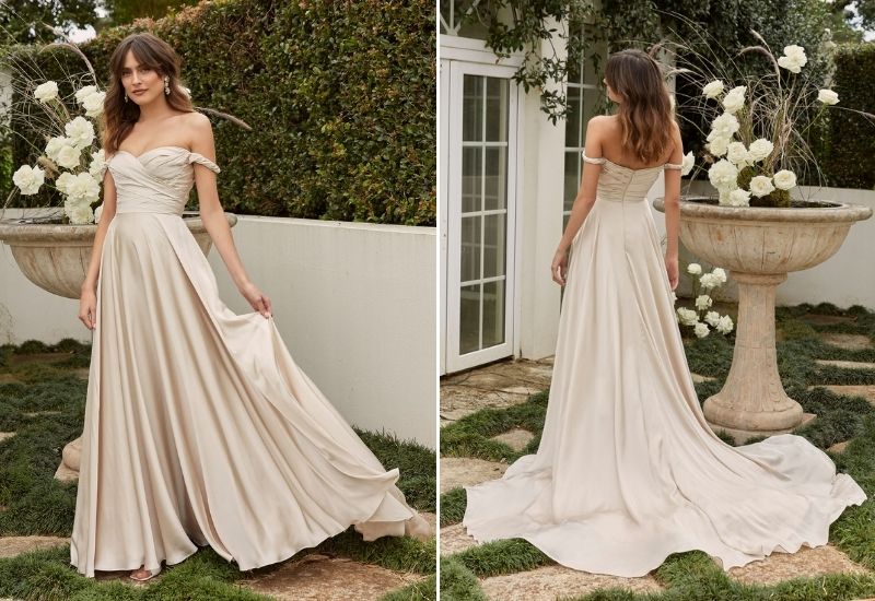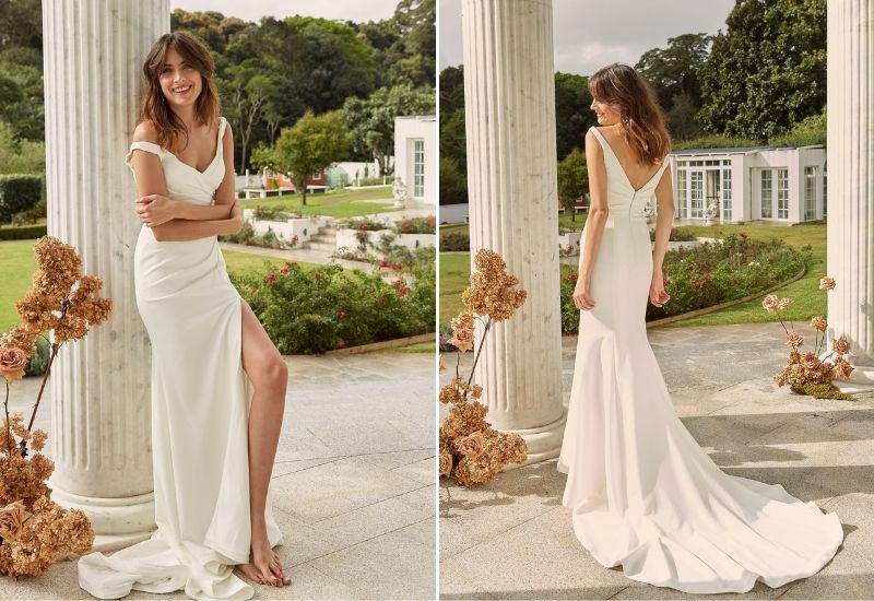 Para quem busca um vestido mais clean, o evasê também é uma excelente escolha. Aliás, de forma resumida, o evasê é o corte preferido das noivas, com ele não tem erro!