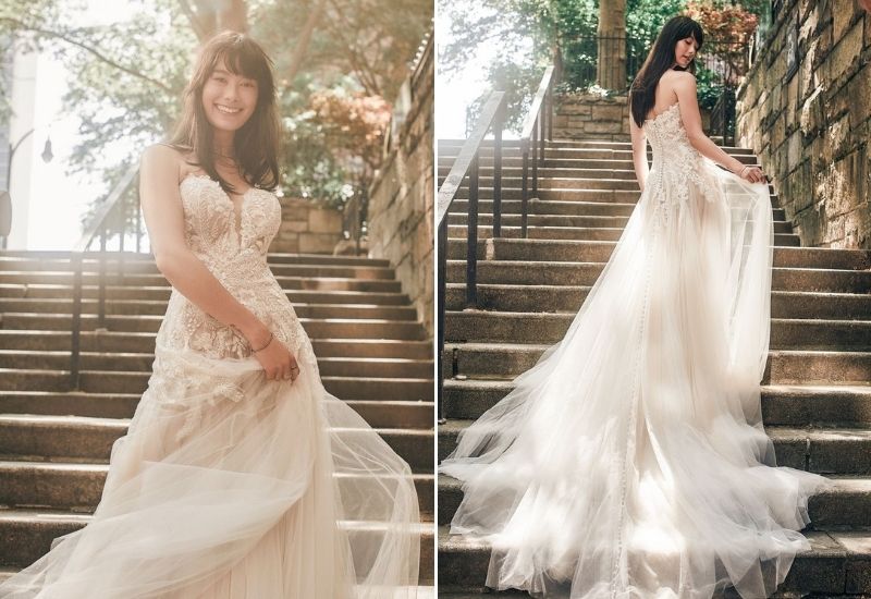 O decote dessa peça fica ainda mais deslumbrante com essa saia um pouco mais longa na parte de trás do vestido.