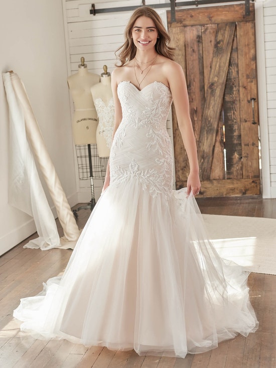 Nas novas coleções, a maioria dos vestidos de noiva evasê é confeccionado com tecidos fluidos, que dão menos volume às saias.