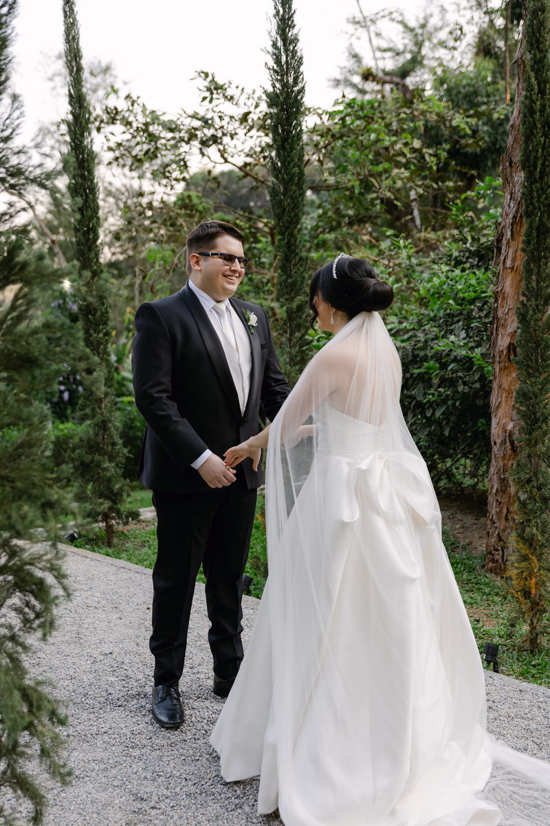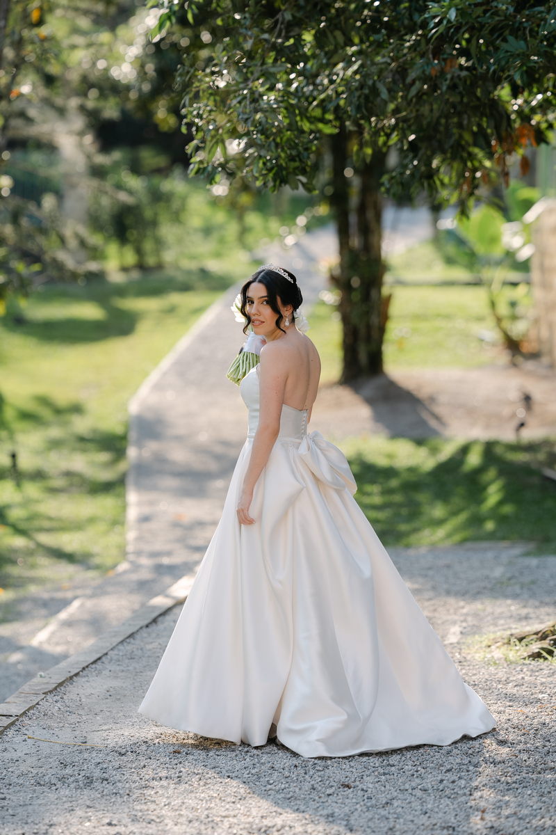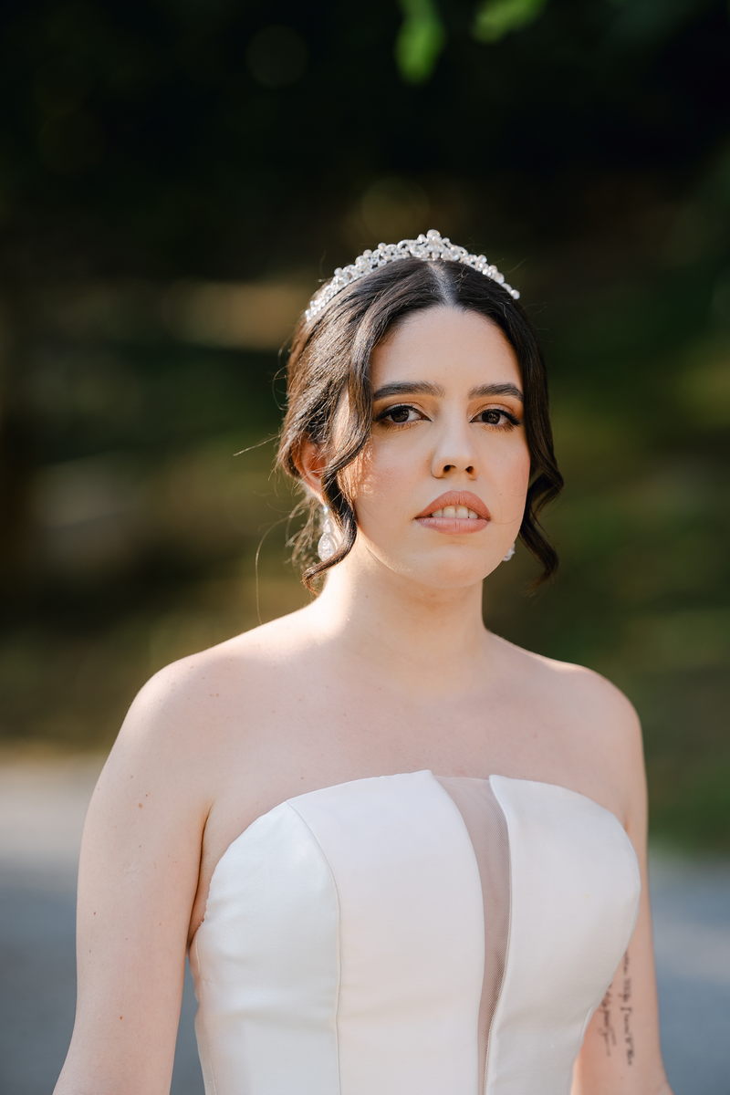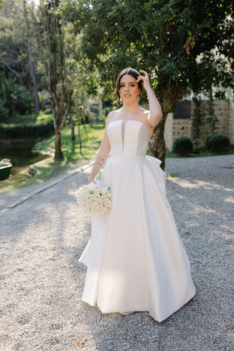 A noiva, Mariana, estava radiante em seu vestido de noiva de tirar o fôlego da loja La Modelista. O modelo estilo princesa tomara que caia, contava com belíssimo detalhe transparente na frente que dava um toque moderno e diferenciado. A saia, uma verdadeira obra de arte: ampla e volumosa, fez Mariana parecer uma princesa de contos de fada. O laço grande nas costas complementou o visual, adicionando um toque de romance e elegância. O cabelo preso e a maquiagem suave, feitos pela talentosa @manurangelmakeup, realçaram a sua beleza natural, de forma encantadora!