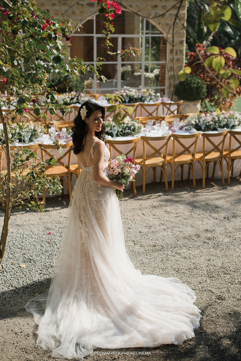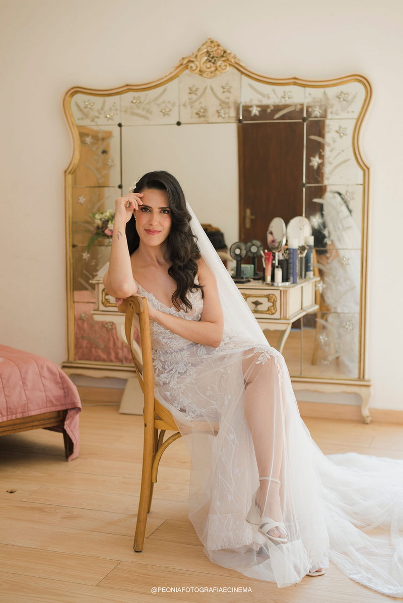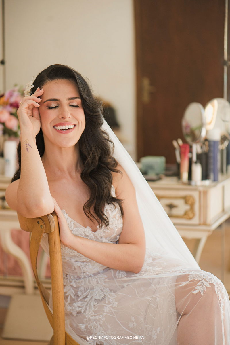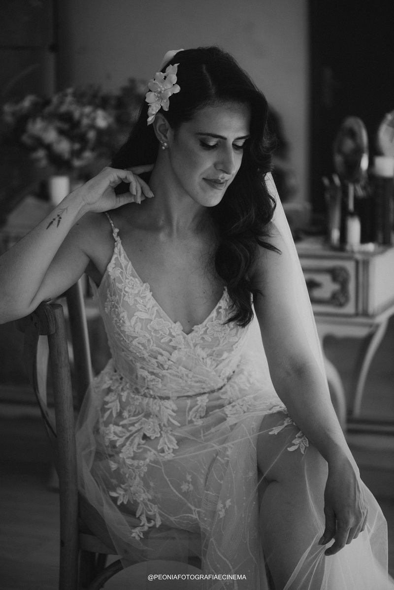 A noiva Israella, deslumbrou em seu elegante vestido de noiva da La Modelista. O modelo, com alças delicadas e um decote lindo nas costas, encantava com o belíssimo trabalho em renda no busto que se prolongavam em detalhes na saia. Este vestido equilibrava perfeitamente elementos tradicionais e modernos, refletindo o estilo único e refinado da noiva. Um detalhe interessante foi a decisão da Israella de fazer sua própria maquiagem. Como maquiadora profissional (@maquiadora.israellagabrig), ela criou um look que realçou sua beleza natural, complementando perfeitamente o penteado elegante realizado por @marianacsantosmakeup.