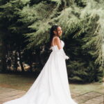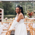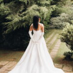 Ileana irradiava uma beleza genuína e natural. Seu vestido de noiva La Modelista tinha modelagem evasê clássica, com um corpete ajustado ao corpo que valorizava perfeitamente a silhueta antes de se abrir em uma saia mais volumosa. O decote delicado trazia um toque romântico e atemporal. A cauda se estendia com elegância, criando uma imagem digna de conto de fadas ao se espalhar pelo caminho. Ileana completou o look com luvas longas que iam até os cotovelos, trazendo um toque de glamour vintage e sofisticação.