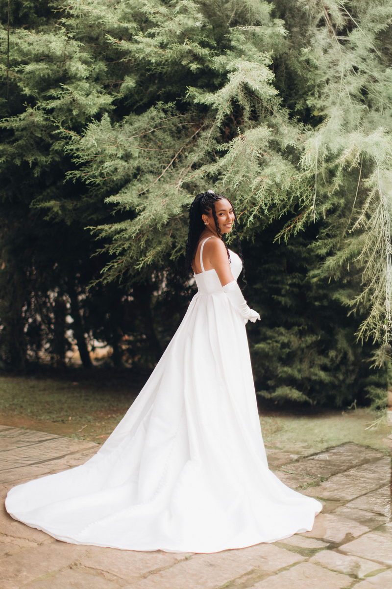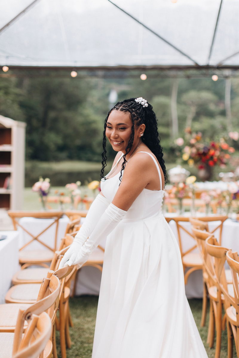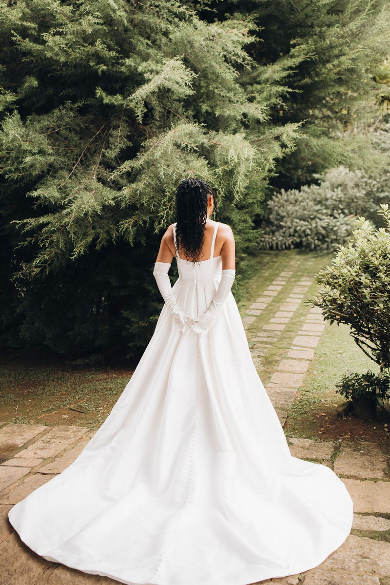 Ileana irradiava uma beleza genuína e natural. Seu vestido de noiva La Modelista tinha modelagem evasê clássica, com um corpete ajustado ao corpo que valorizava perfeitamente a silhueta antes de se abrir em uma saia mais volumosa. O decote delicado trazia um toque romântico e atemporal. A cauda se estendia com elegância, criando uma imagem digna de conto de fadas ao se espalhar pelo caminho. Ileana completou o look com luvas longas que iam até os cotovelos, trazendo um toque de glamour vintage e sofisticação.