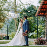 O destaque do casamento foi, sem dúvida, a noiva de Julia. Ela optou por um vestido de noiva perfeito da renomada loja La Modelista. O modelo era um exemplo de elegância clássica com um toque moderno, ideal para noivas que buscam um visual atemporal e sofisticado. Com um estilo clássico e minimalista, seu decote assimétrico com um ombro só, adornado por um laço volumoso, conferiu romantismo e modernidade ao visual. A maquiagem e o cabelo da noiva foram obra da talentosa @carlarodriguesmake, que conseguiu realçar ainda mais a sua beleza natural. A escolha de ondas suaves no cabelo semi preso e uma maquiagem delicada complementou perfeitamente o estilo romântico e sofisticado do vestido, fazendo com que a noiva se sentisse e parecesse uma verdadeira princesa em seu grande dia.