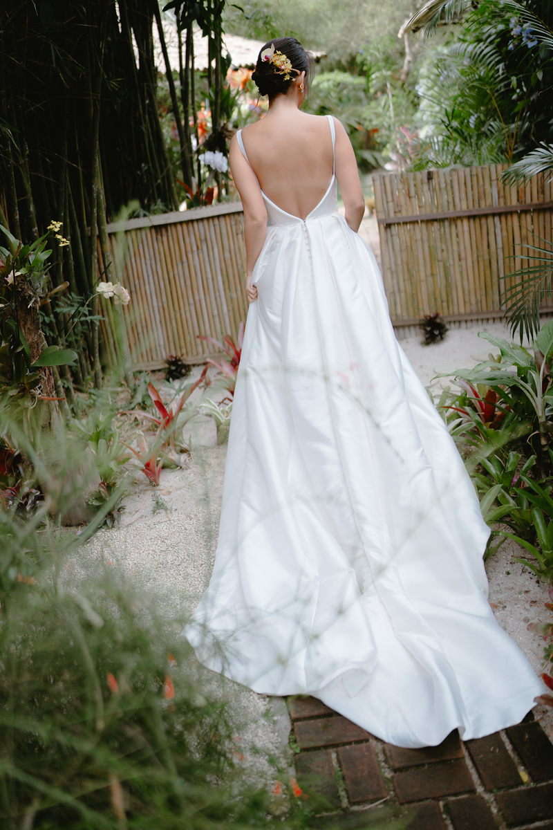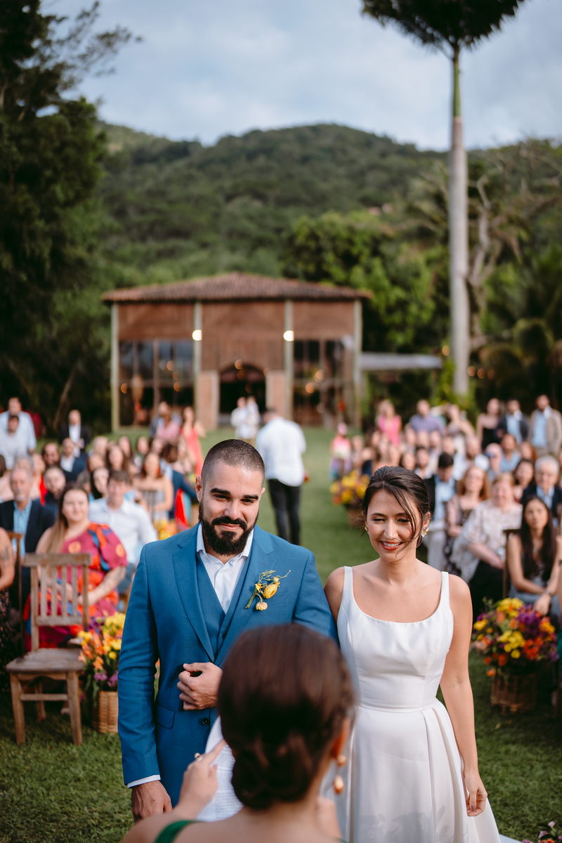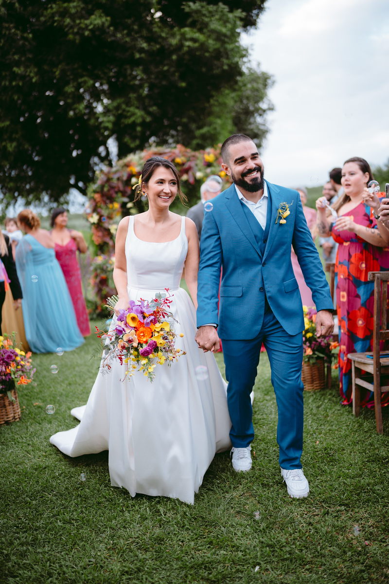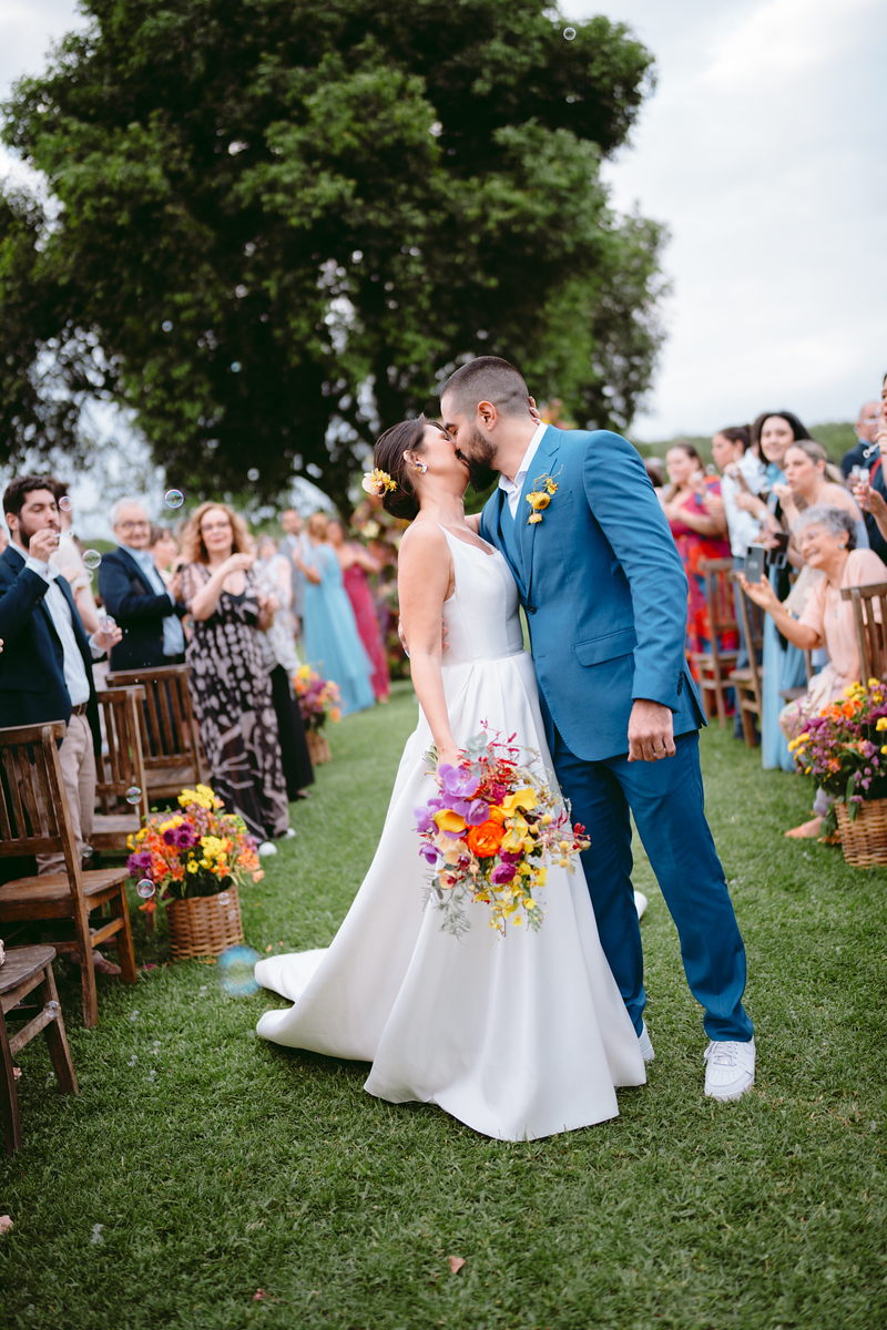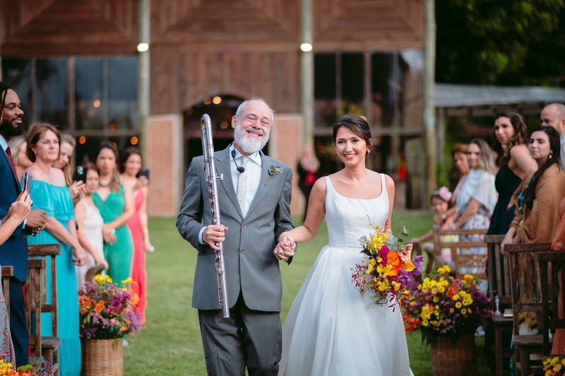 A Noiva Marcela optou por um vestido minimalista estilo princesa, da renomada loja de noivas La Modelista. O modelo sofisticado conquistou a todos, com sua elegância e uma belíssima cauda que adicionou um toque de conto de fadas à cerimônia. A sua beleza foi acentuada pela habilidade extraordinária do Gustavo Macedo, responsável pelo impecável penteado e maquiagem da noiva. Marcela deu seus passos rumo ao altar emanando beleza e graciosidade com o seu belíssimo vestido de noiva.