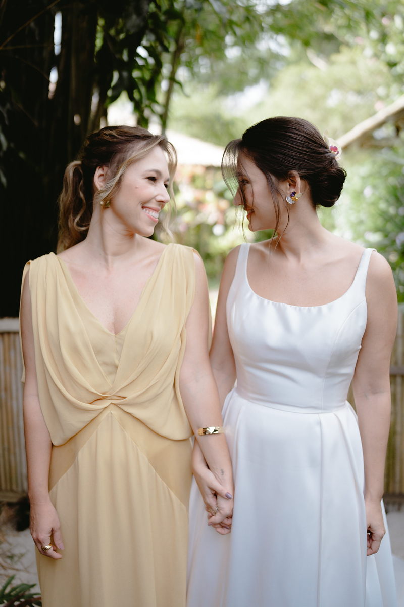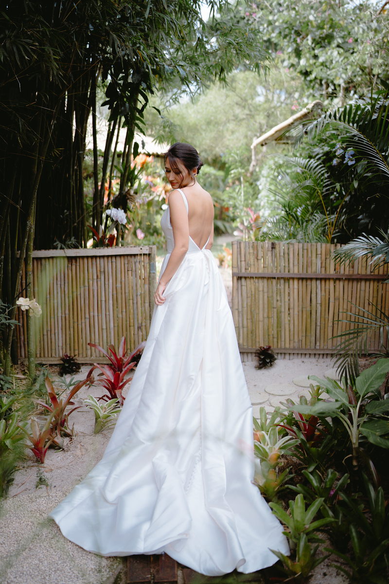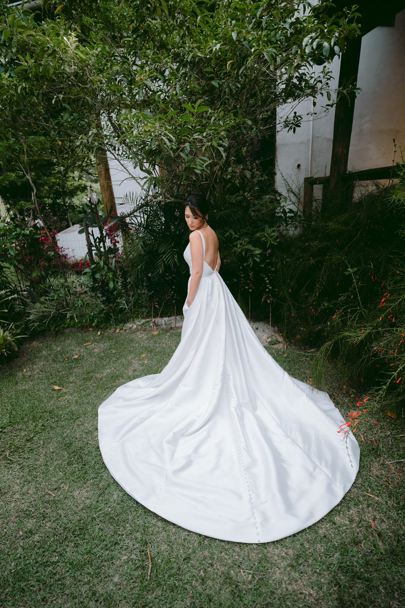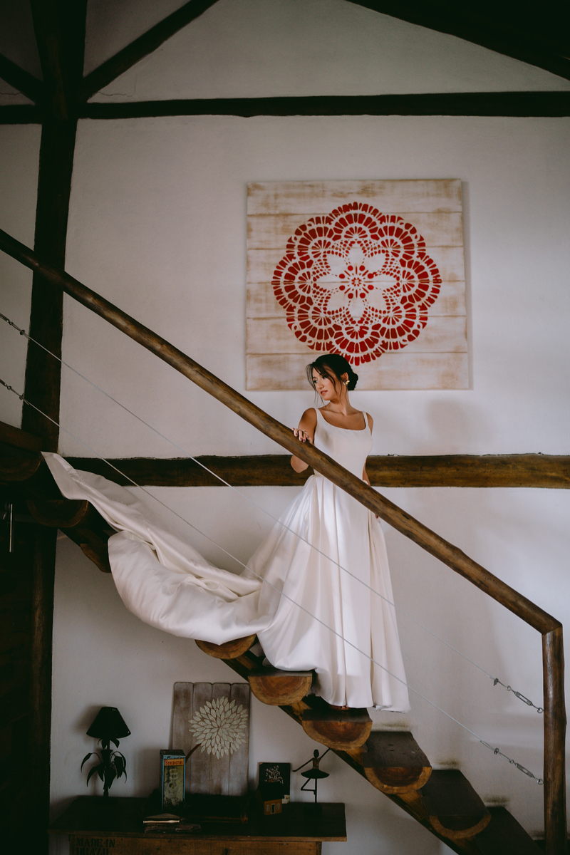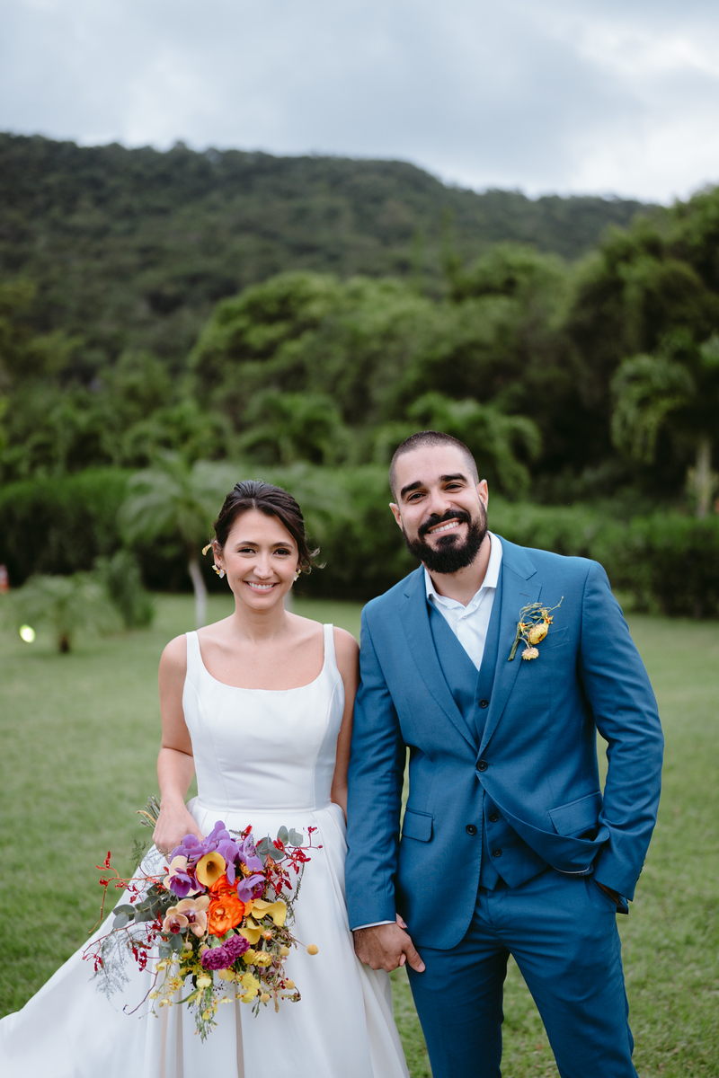 A Noiva Marcela optou por um vestido minimalista estilo princesa, da renomada loja de noivas La Modelista. O modelo sofisticado conquistou a todos, com sua elegância e uma belíssima cauda que adicionou um toque de conto de fadas à cerimônia. A sua beleza foi acentuada pela habilidade extraordinária do Gustavo Macedo, responsável pelo impecável penteado e maquiagem da noiva. Marcela deu seus passos rumo ao altar emanando beleza e graciosidade com o seu belíssimo vestido de noiva.