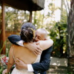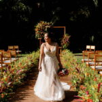 A noiva, Fê, deslumbrou a todos com um vestido de noiva da La Modelista. O modelo, todo rendado, exibiu um trabalho diferenciado e belíssimo, com uma fenda discreta que acrescentou um toque de modernidade ao look. A escolha do vestido não poderia ter sido mais acertada, complementando perfeitamente a atmosfera mágica da cerimônia.