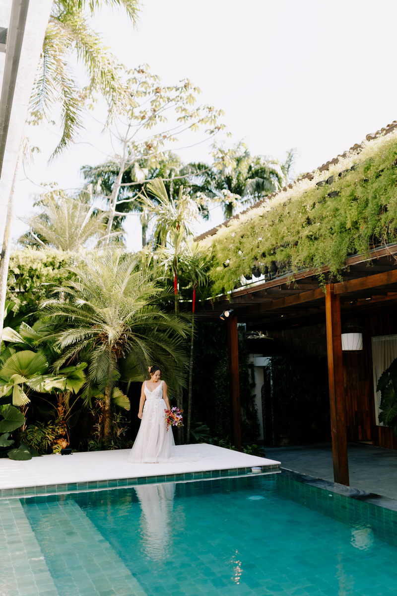 A maquiagem e o penteado adicionaram um charme extra ao seu look encantador. Cada detalhe foi pensado para realçar a sua beleza natural, resultando em uma noiva deslumbrante que irradiava felicidade.