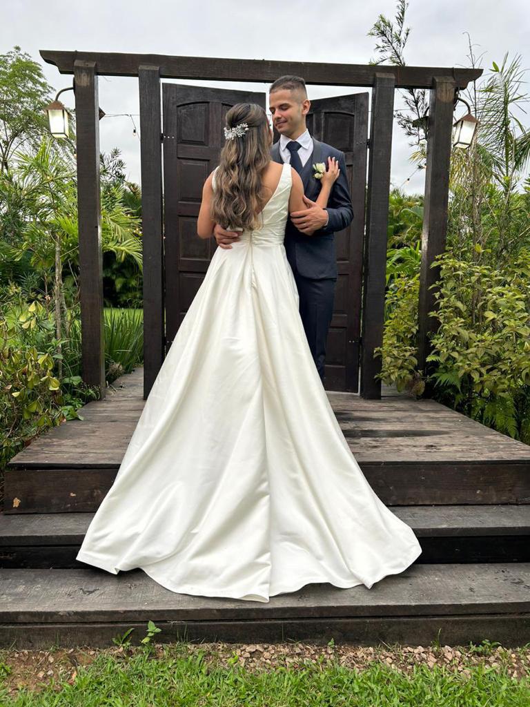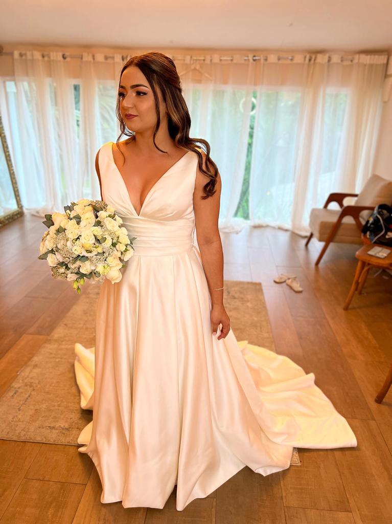 A Dhayane encantou todos os convidados em seu vestido de noiva minimalista da La Modelista. O modelo estilo princesa era uma perfeita combinação de elegância e graciosidade, destacando a beleza natural da noiva de forma encantadora. A maquiagem e o cabelo belíssimos, assinados pela talentosa @josilinsbridespecialist, contribuiu com delicadeza para a sua aparência deslumbrante.