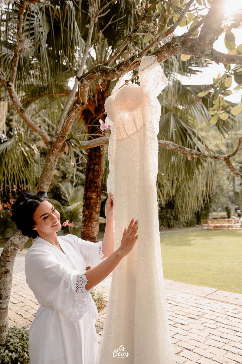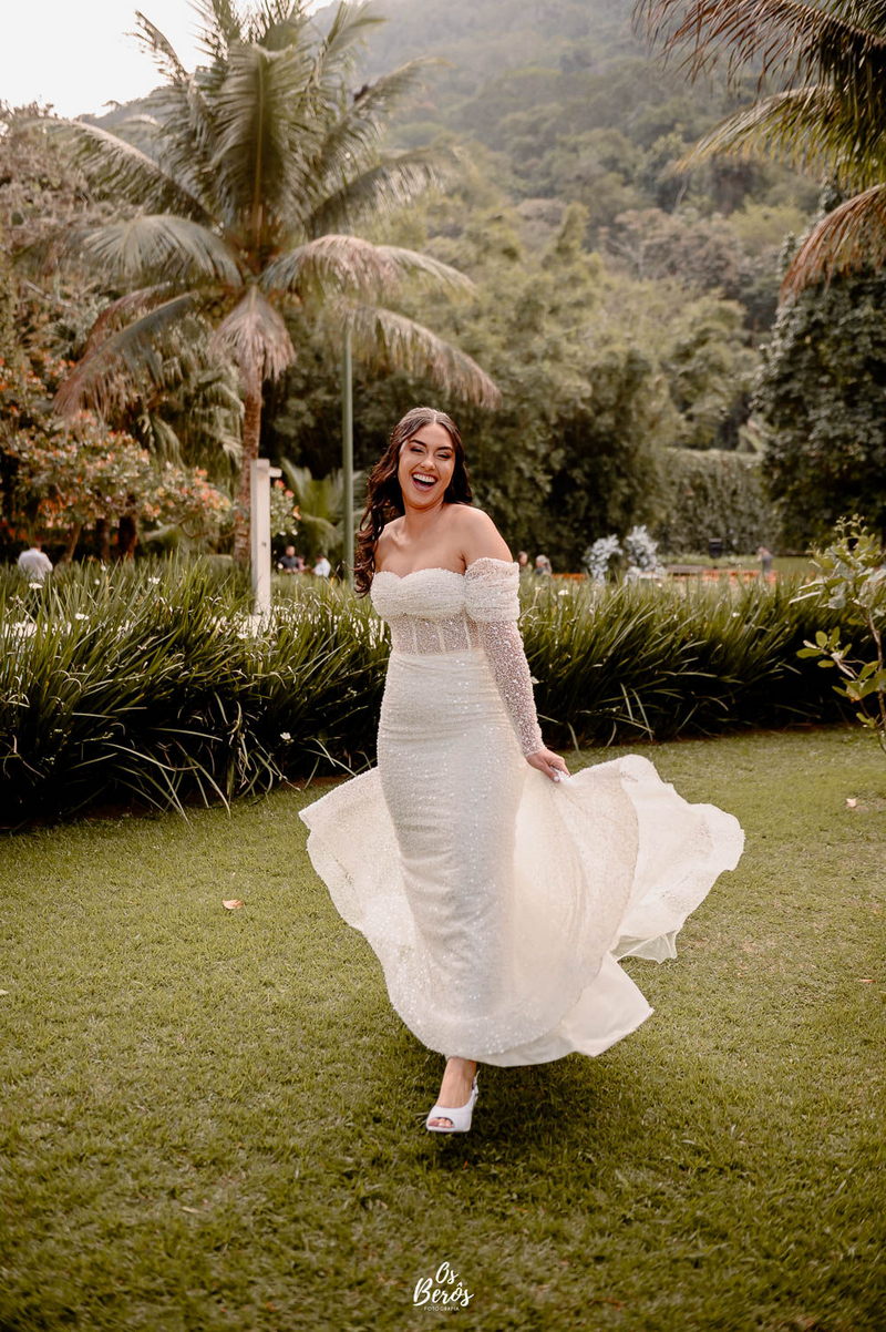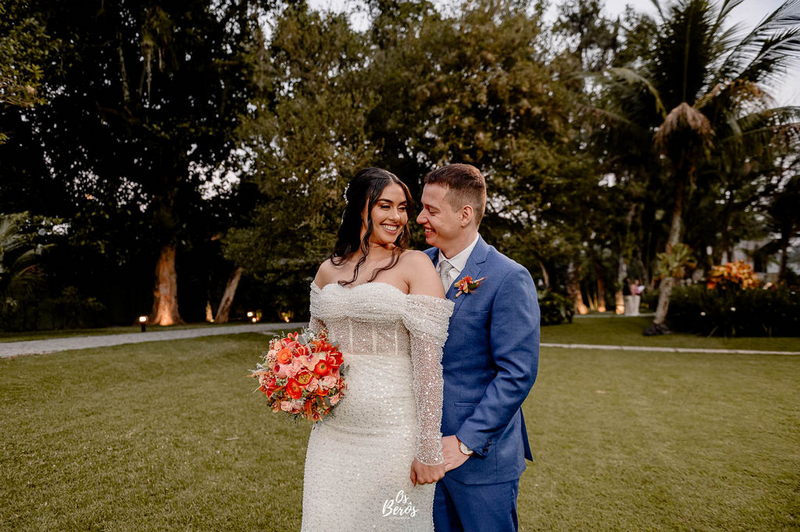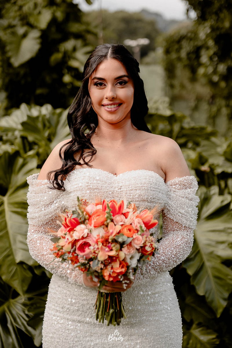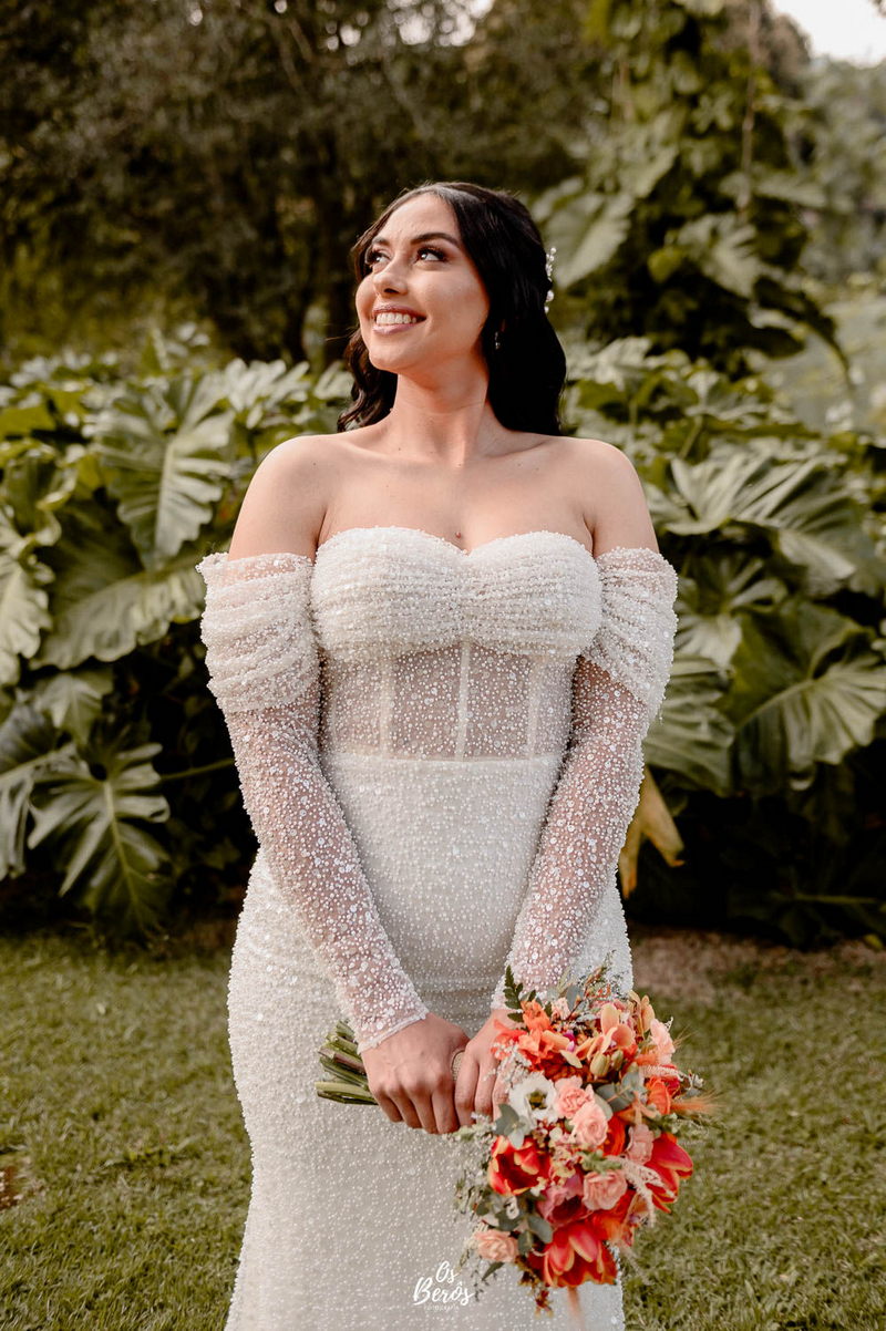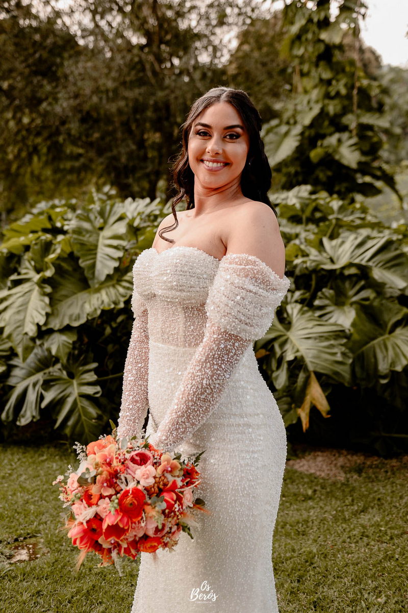 A Rayanne estava irresistível em seu vestido de noiva La Modelista. Com um design ombro a ombro que destacou o busto, o modelo apresentava mangas longas e adornadas com detalhes em pedraria que brilhavam de forma sutil sob a luz do sol. O corte estilo sereia realçou perfeitamente a silhueta da noiva, enquanto o tecido diferenciado adicionou um toque sofisticado ao visual, criando uma combinação de elegância e modernidade. A beleza da noiva foi complementada pelo talento da @alinemakeuphair, que cuidou da maquiagem e do cabelo, garantindo que Rayanne estivesse deslumbrante do início ao fim do dia.