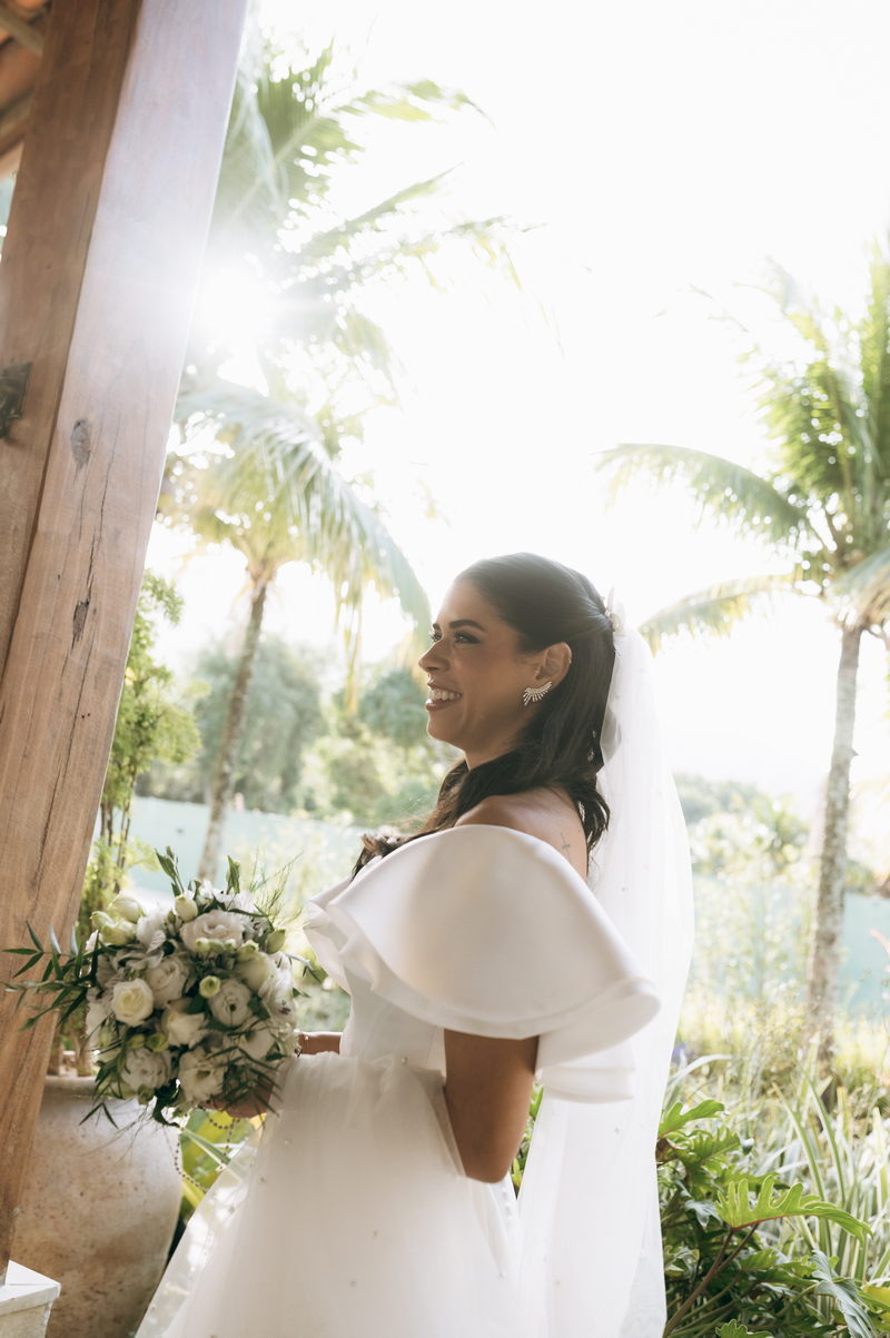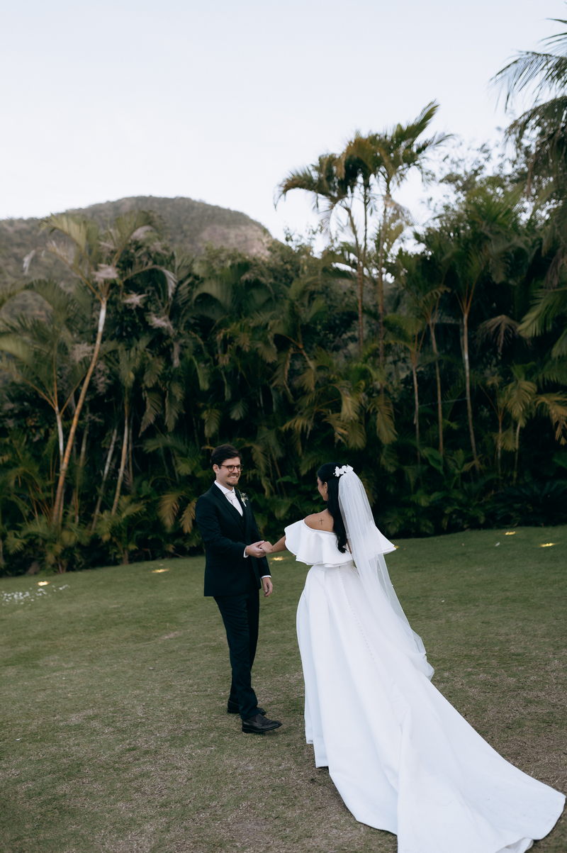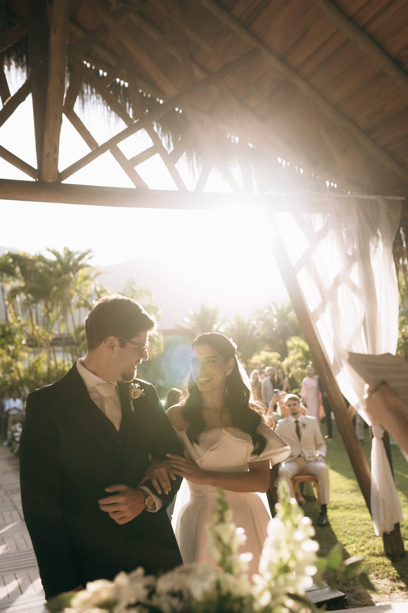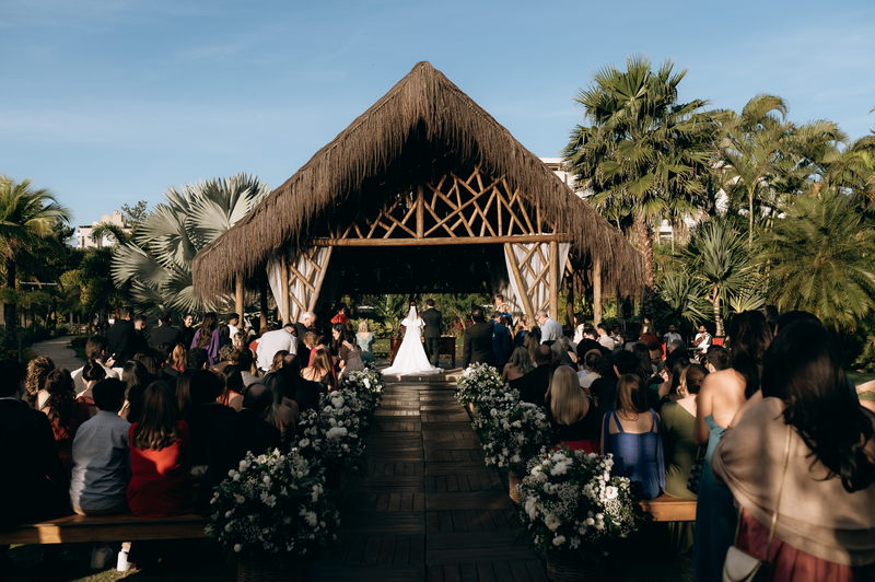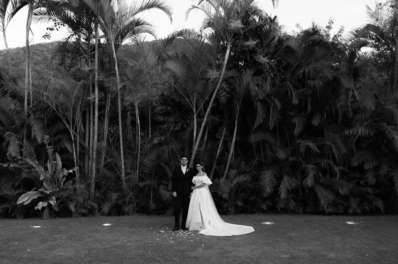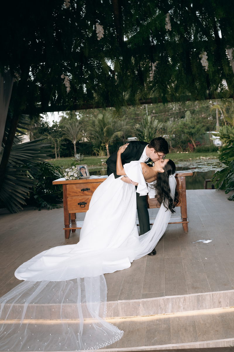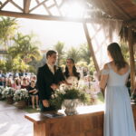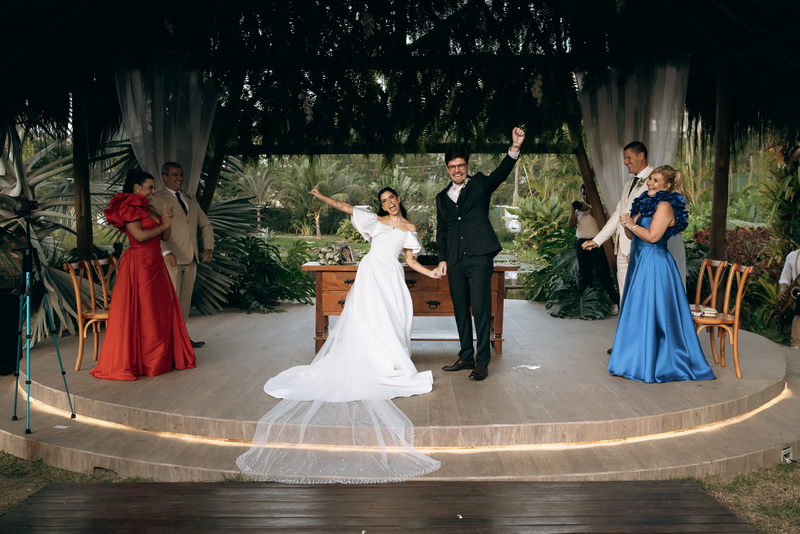 Em um dia de sol abençoado, com o verde exuberante da natureza como cenário, Camila e Mark selaram seu amor em uma cerimônia que transbordava elegância e autenticidade.