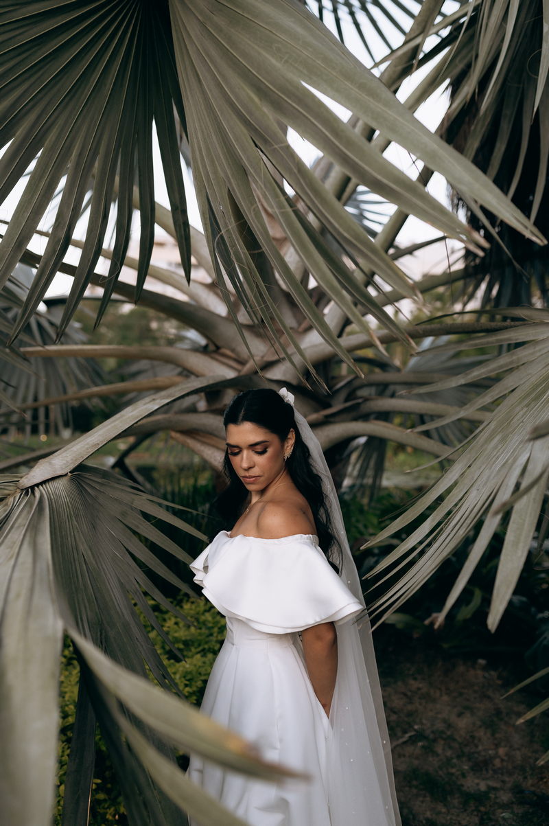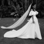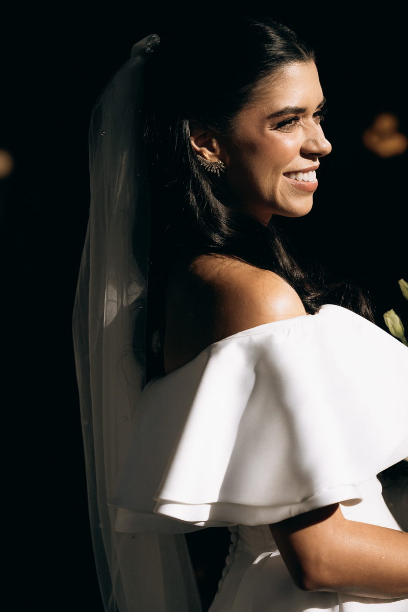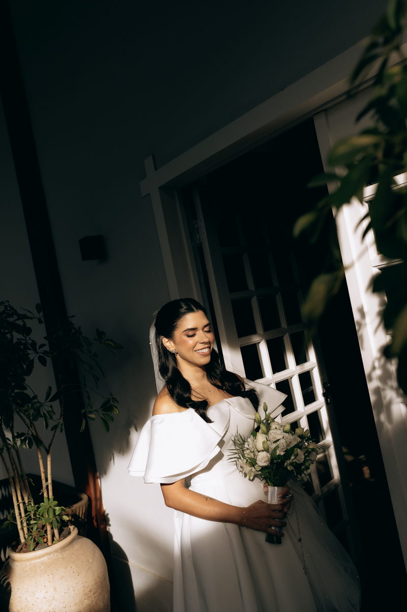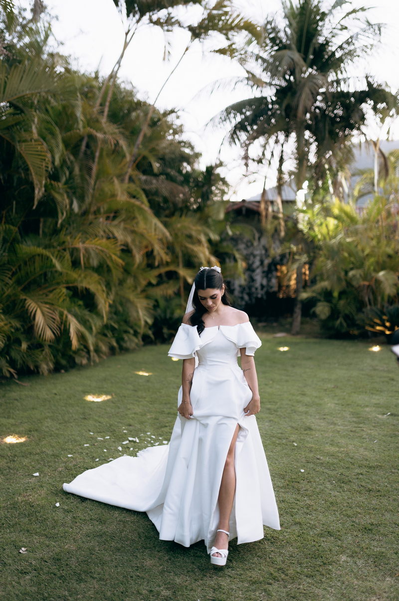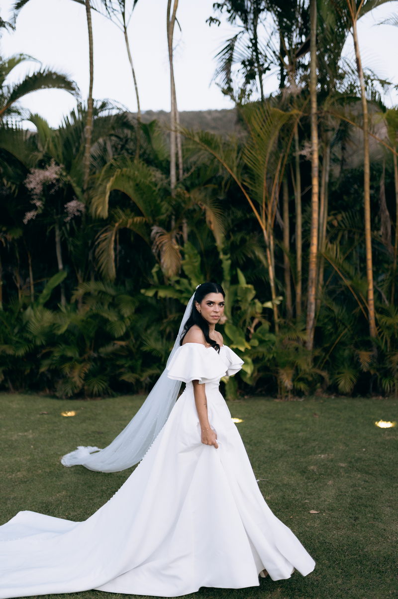 No centro de toda a beleza estava Camila, uma noiva que personificava graça e modernidade. Sua beleza natural foi realçada por seu vestido de noiva da La Modelista, uma verdadeira obra de arte que capturou a essência da sua personalidade. O vestido com caimento impecável e decote ombro a ombro, ganhou um charme extra com as mangas delicadas, um detalhe romântico que remetia à sofisticação atemporal. A fenda na perna esquerda trouxe um elemento de surpresa, adicionando um toque de modernidade. Já a cauda longa, que se estendia majestosamente pelo gramado, criou um contraste deslumbrante com a paisagem natural.