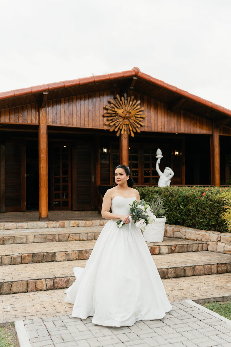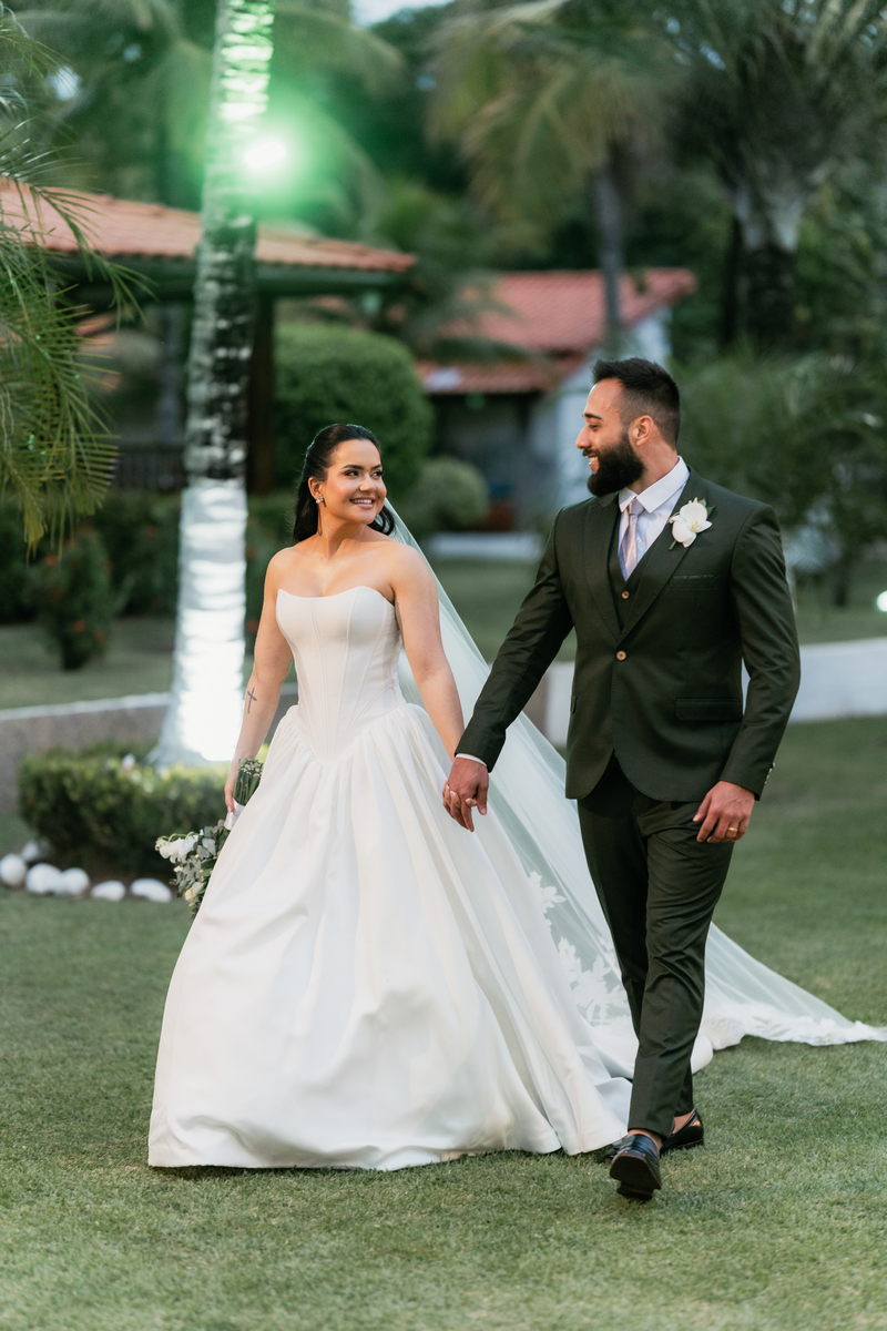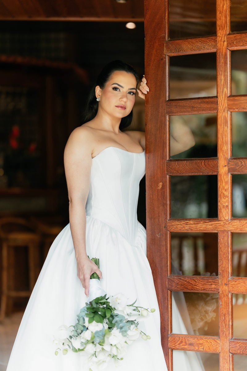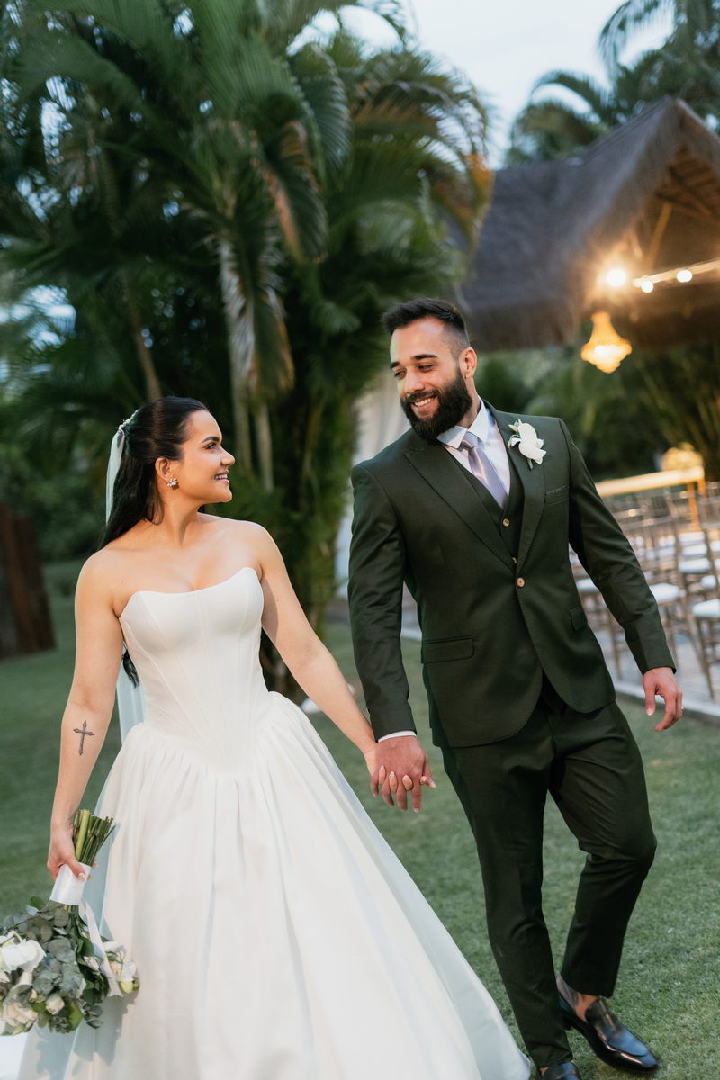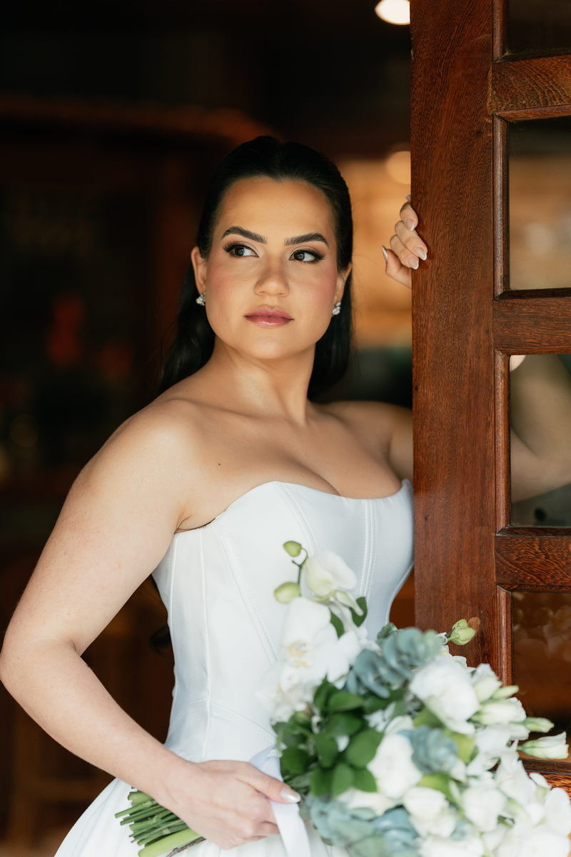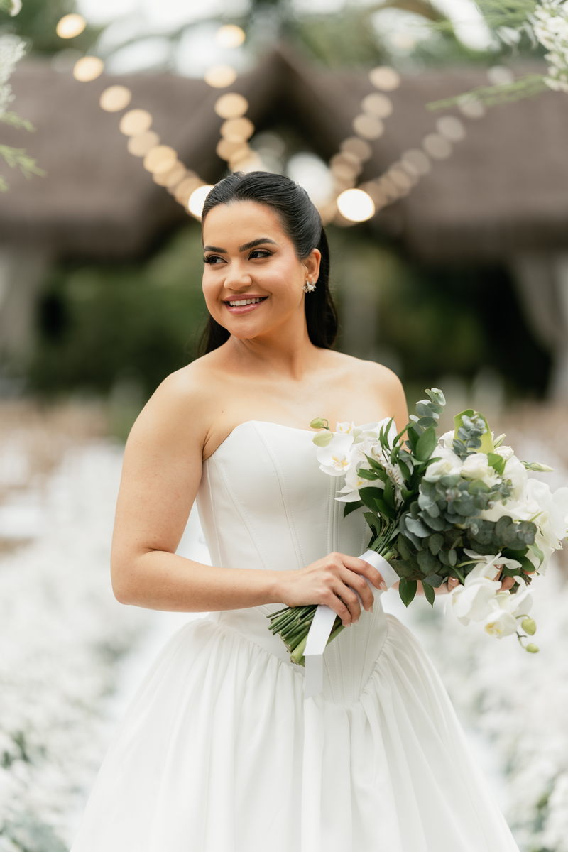 Ana Beatriz estava simplesmente deslumbrante. Com um sorriso sereno que irradiava alegria, ela caminhou em direção ao altar com uma presença marcante e uma elegância natural. O vestido de noiva, assinado pela La Modelista, era uma tradução perfeita de sua personalidade. O grande destaque da peça foi corselet, uma tendência que une estrutura e delicadeza de forma magistral. O tomara-que-caia valorizou seu colo, enquanto o trançado nas costas adicionou um toque de charme e romantismo. A saia, de tecido liso e elegante, trouxe movimento e leveza ao visual completando a imagem de uma noiva moderna e atemporal. Sua beleza foi realçada por uma produção impecável de @flaviaalexandramakeup, que apostou em uma maquiagem leve e penteado que transmitiam sofisticação.