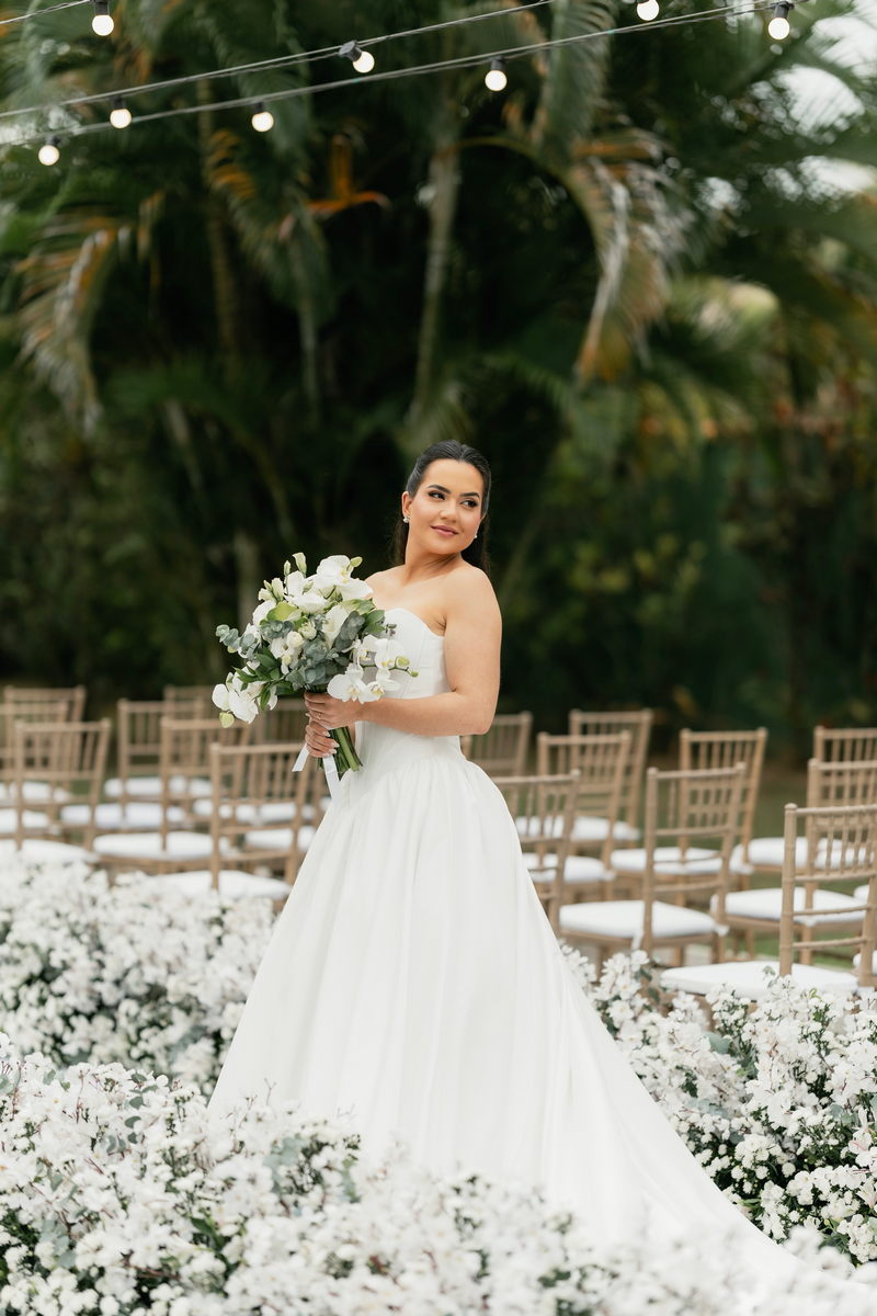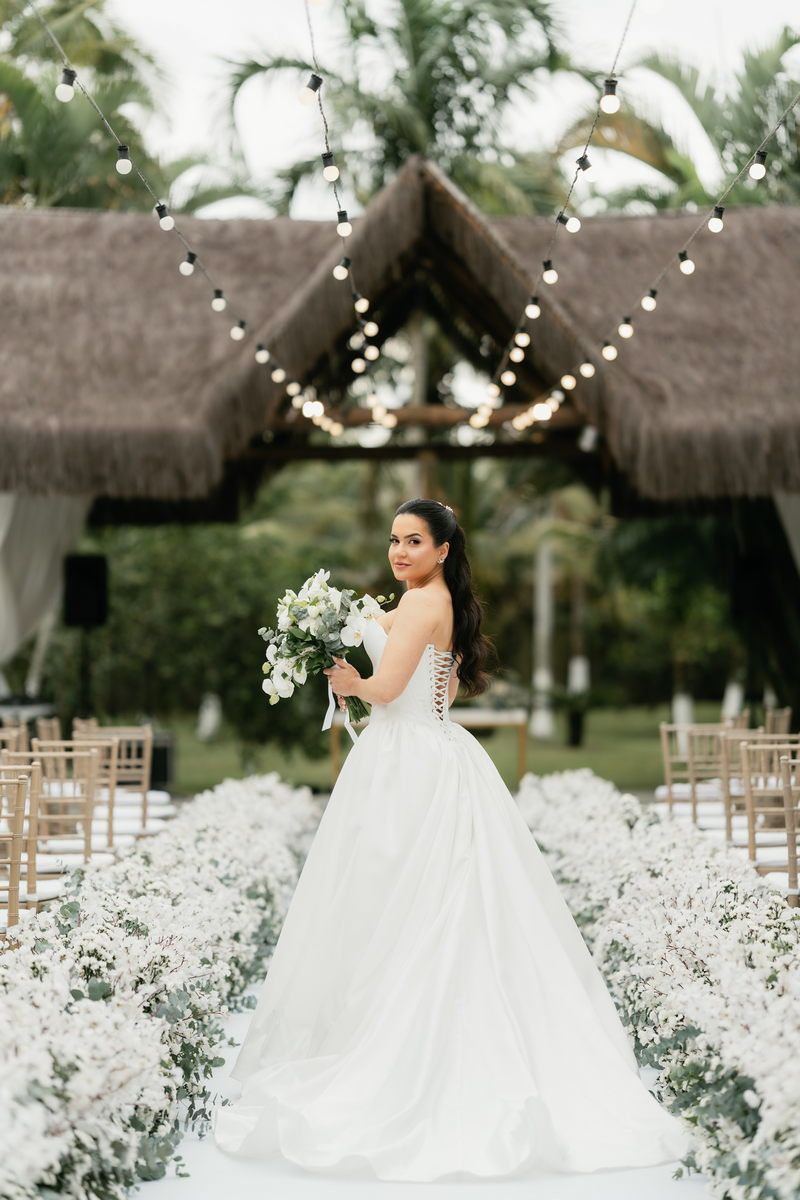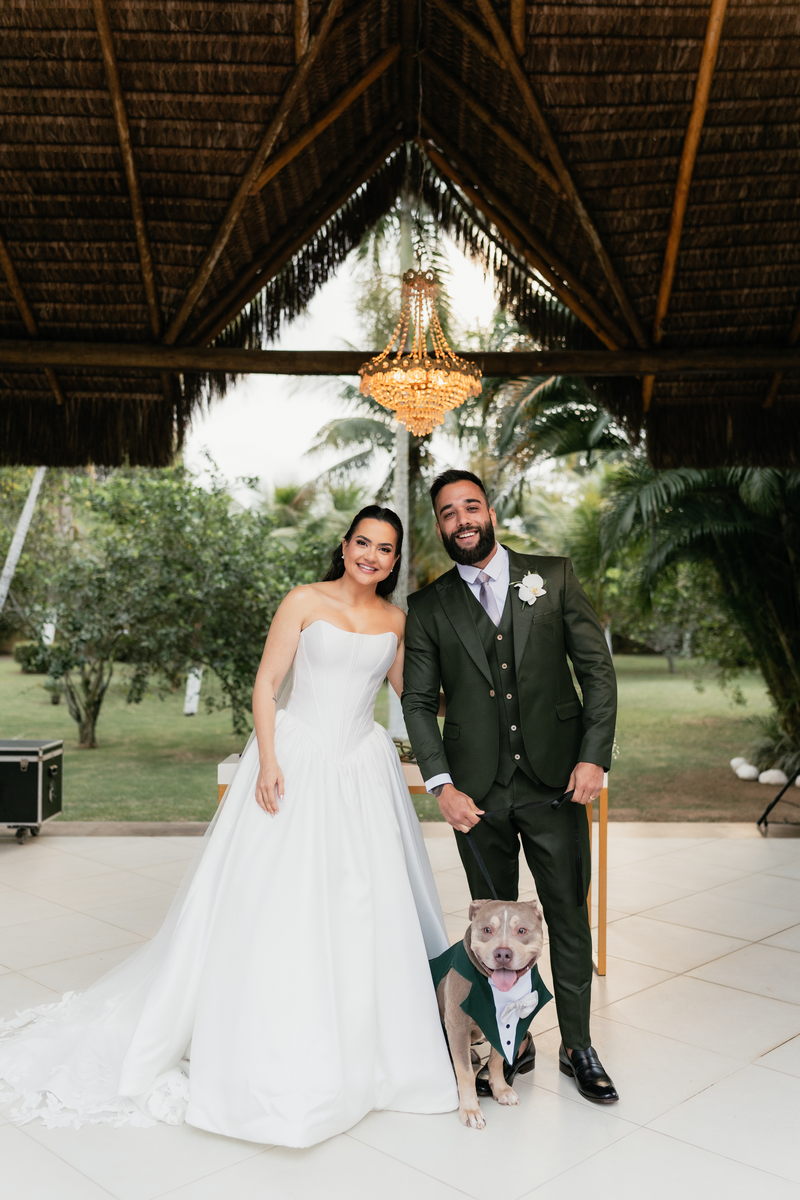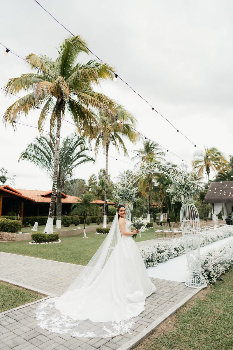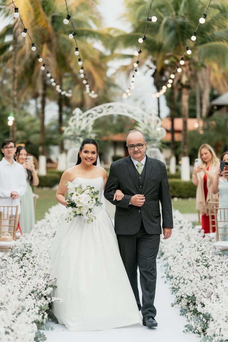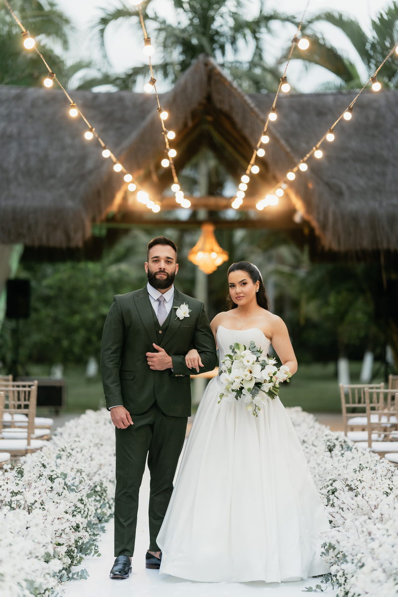 Ana Beatriz estava simplesmente deslumbrante. Com um sorriso sereno que irradiava alegria, ela caminhou em direção ao altar com uma presença marcante e uma elegância natural. O vestido de noiva, assinado pela La Modelista, era uma tradução perfeita de sua personalidade. O grande destaque da peça foi corselet, uma tendência que une estrutura e delicadeza de forma magistral. O tomara-que-caia valorizou seu colo, enquanto o trançado nas costas adicionou um toque de charme e romantismo. A saia, de tecido liso e elegante, trouxe movimento e leveza ao visual completando a imagem de uma noiva moderna e atemporal. Sua beleza foi realçada por uma produção impecável de @flaviaalexandramakeup, que apostou em uma maquiagem leve e penteado que transmitiam sofisticação.
