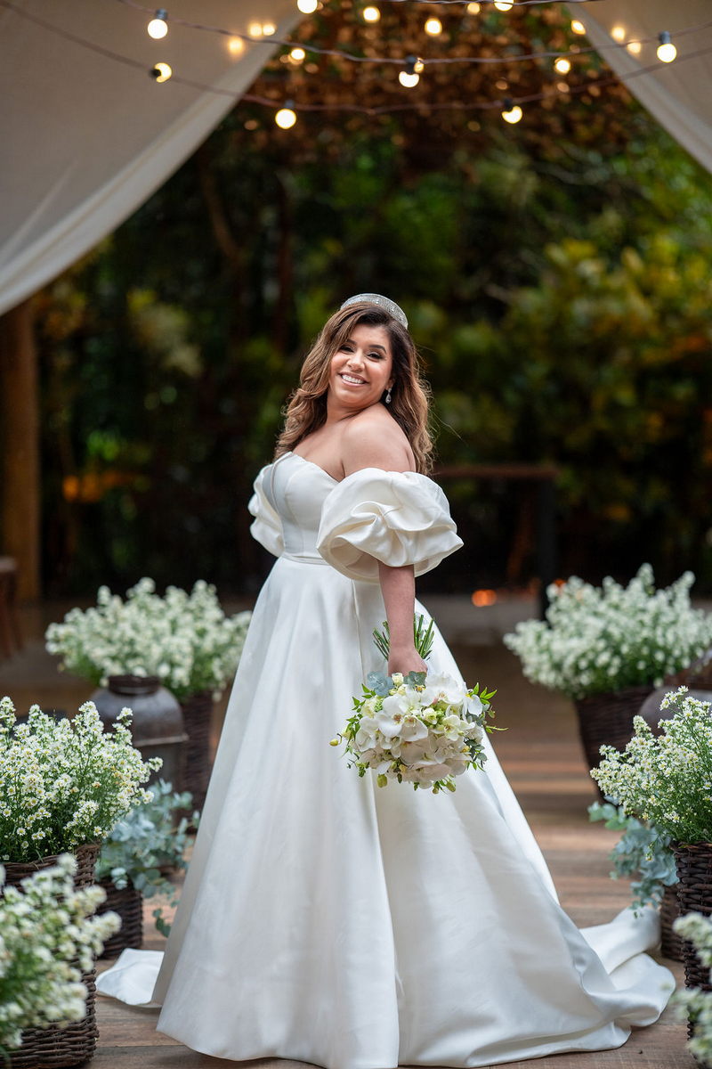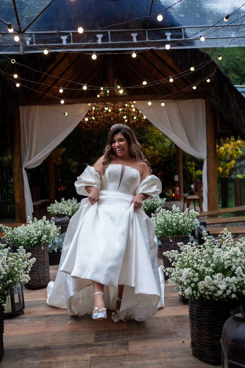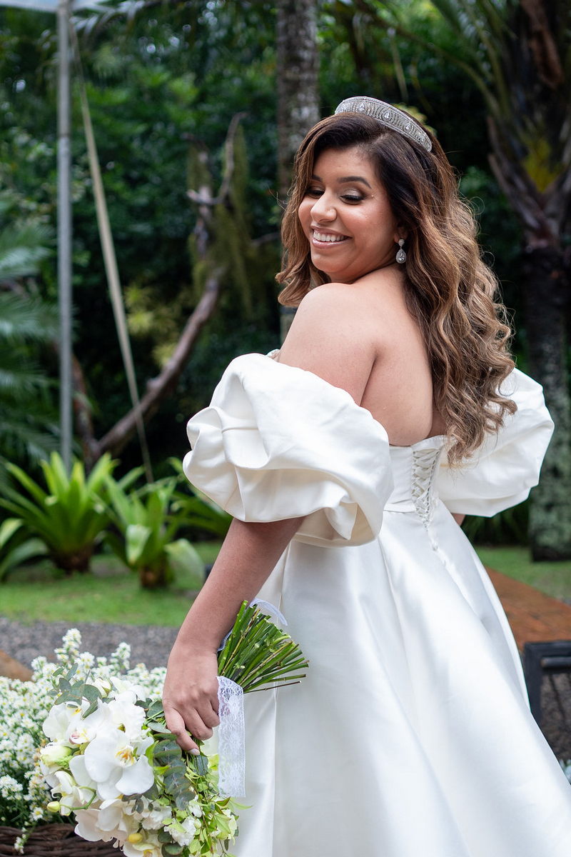 Stella brilhou em seu vestido de noiva deslumbrante da La Modelista, que uniu o clássico ao moderno. O modelo off-shoulder destacou seus ombros de forma delicada, enquanto as mangas bufantes trouxeram um toque contemporâneo e sofisticado. O decote com transparência valorizou o busto, e a abertura frontal da saia conferiu um ar moderno. O tecido de alta qualidade, conferiu o visual de princesa, e os sapatos com laço foram o complemento perfeito para o look. A maquiagem e o penteado, assinados por @flaviaalexandramakeup, foram simplesmente impecáveis. A escolha de um visual natural destacou ainda mais a beleza da noiva, enquanto os cabelos soltos com ondas suaves trouxeram leveza e romantismo ao look.