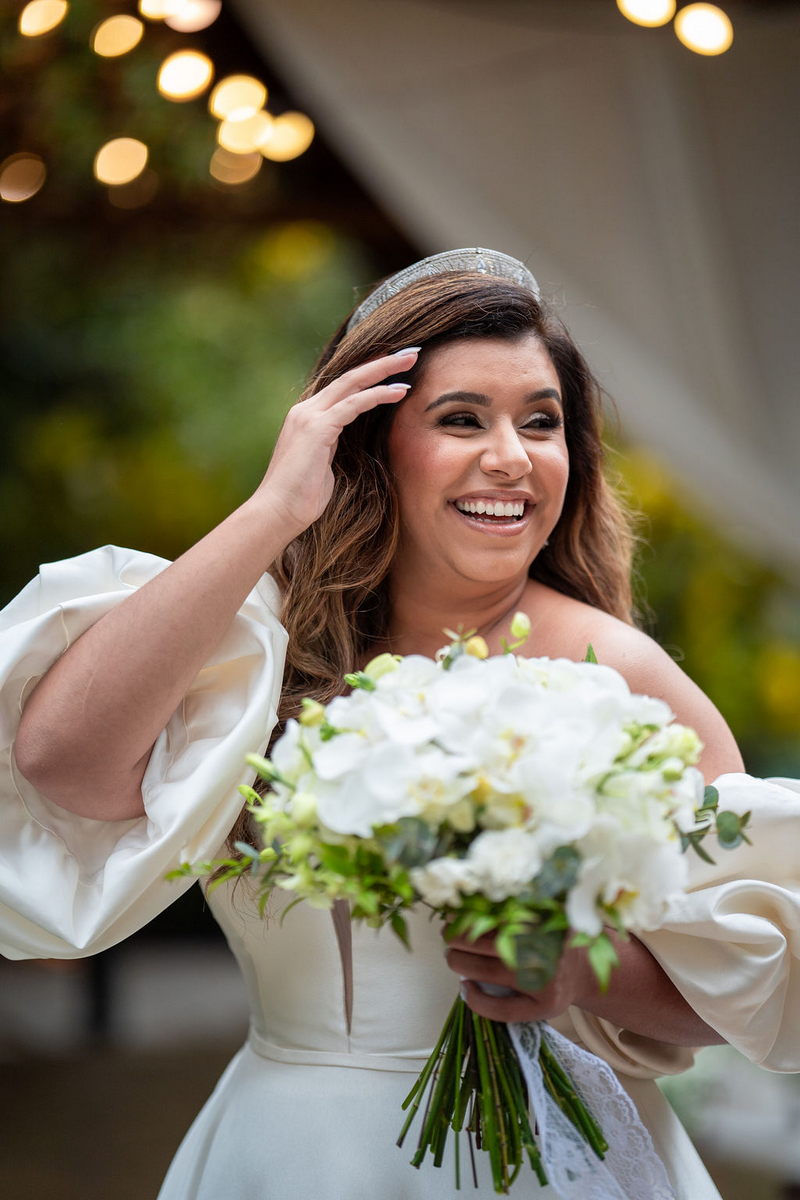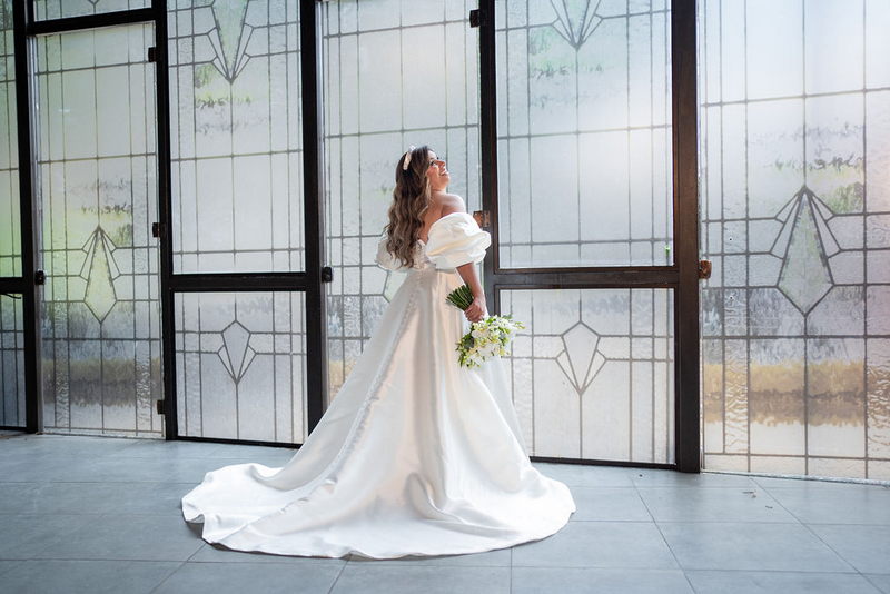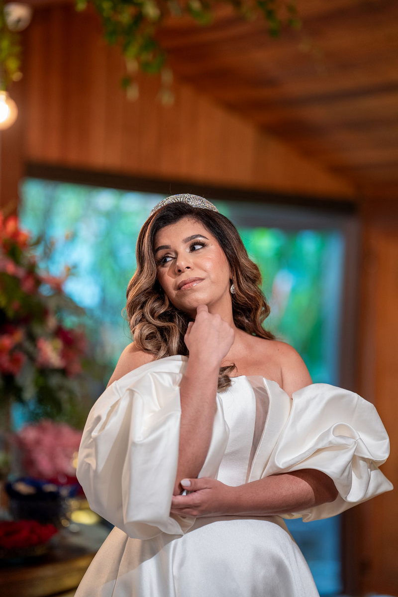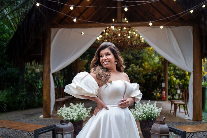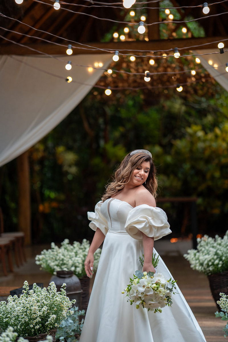 Stella brilhou em seu vestido de noiva deslumbrante da La Modelista, que uniu o clássico ao moderno. O modelo off-shoulder destacou seus ombros de forma delicada, enquanto as mangas bufantes trouxeram um toque contemporâneo e sofisticado. O decote com transparência valorizou o busto, e a abertura frontal da saia conferiu um ar moderno. O tecido de alta qualidade, conferiu o visual de princesa, e os sapatos com laço foram o complemento perfeito para o look. A maquiagem e o penteado, assinados por @flaviaalexandramakeup, foram simplesmente impecáveis. A escolha de um visual natural destacou ainda mais a beleza da noiva, enquanto os cabelos soltos com ondas suaves trouxeram leveza e romantismo ao look.
