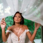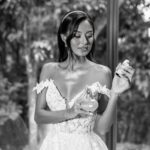 Camile irradiava uma beleza natural e uma presença marcante, com um sorriso que iluminava todo o ambiente. Para o grande dia, a noiva escolheu um deslumbrante vestido de noiva Internovias, um verdadeiro vestido princesa que valorizava sua silhueta de forma impecável. O modelo ombro a ombro apresentava um delicado decote em V e transparência, adicionando um toque de sofisticação. As mangas rendadas, removíveis, complementavam o visual com leveza. A saia, volumosa e composta por múltiplas camadas de tule, criava uma silhueta de princesa completa, com um caimento fluido e natural que acompanhava seus passos.