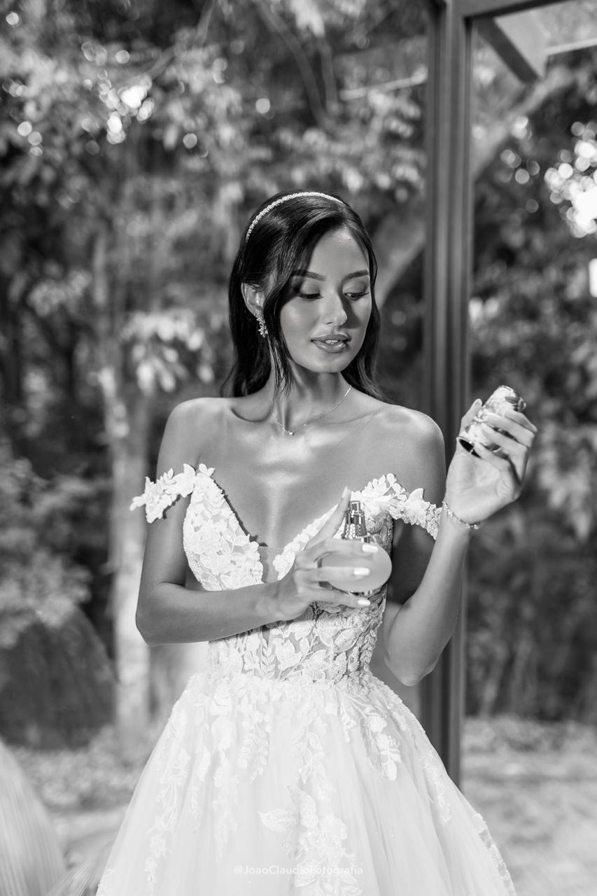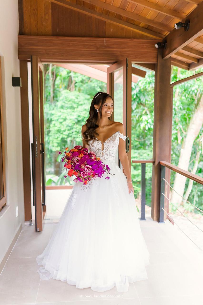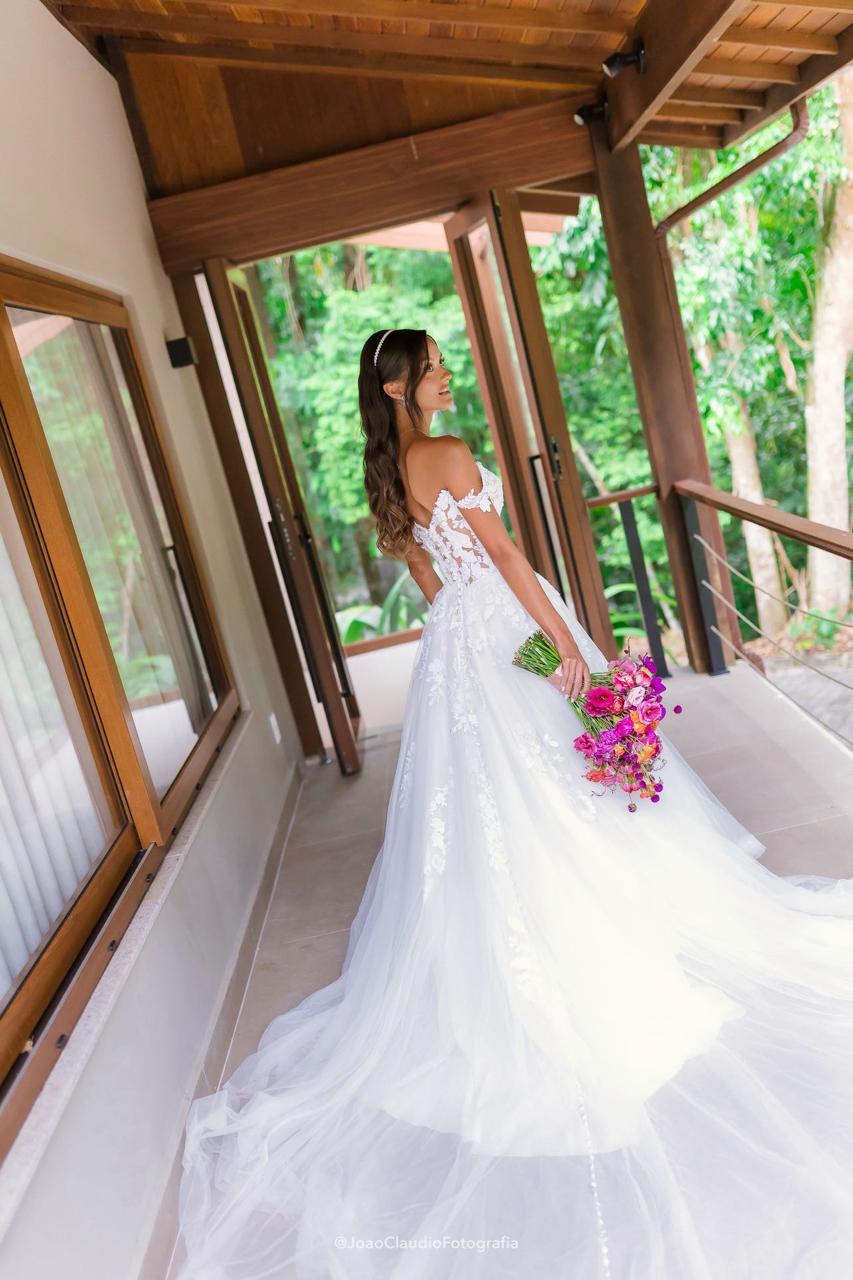 Camile irradiava uma beleza natural e uma presença marcante, com um sorriso que iluminava todo o ambiente. Para o grande dia, a noiva escolheu um deslumbrante vestido de noiva Internovias, um verdadeiro vestido princesa que valorizava sua silhueta de forma impecável. O modelo ombro a ombro apresentava um delicado decote em V e transparência, adicionando um toque de sofisticação. As mangas rendadas, removíveis, complementavam o visual com leveza. A saia, volumosa e composta por múltiplas camadas de tule, criava uma silhueta de princesa completa, com um caimento fluido e natural que acompanhava seus passos.