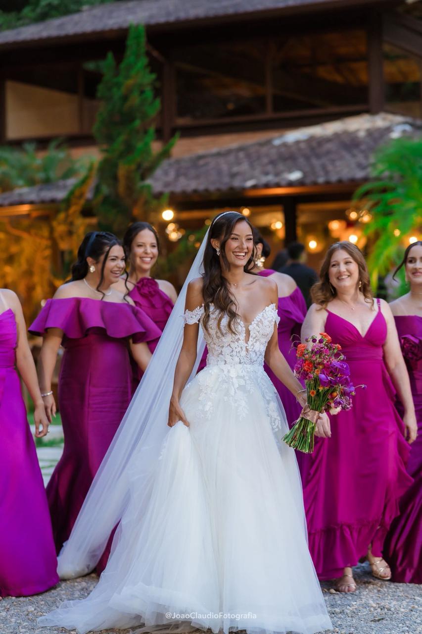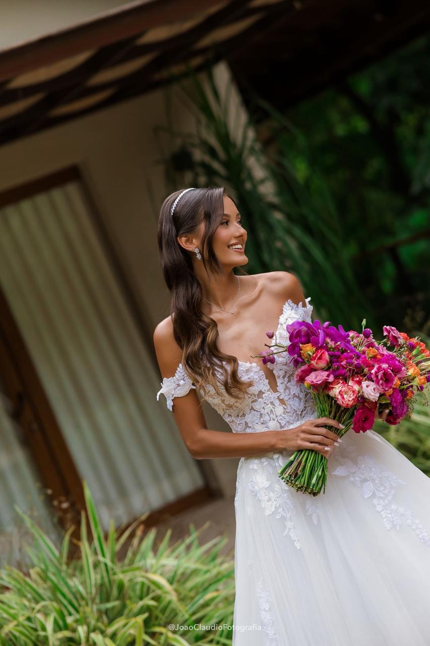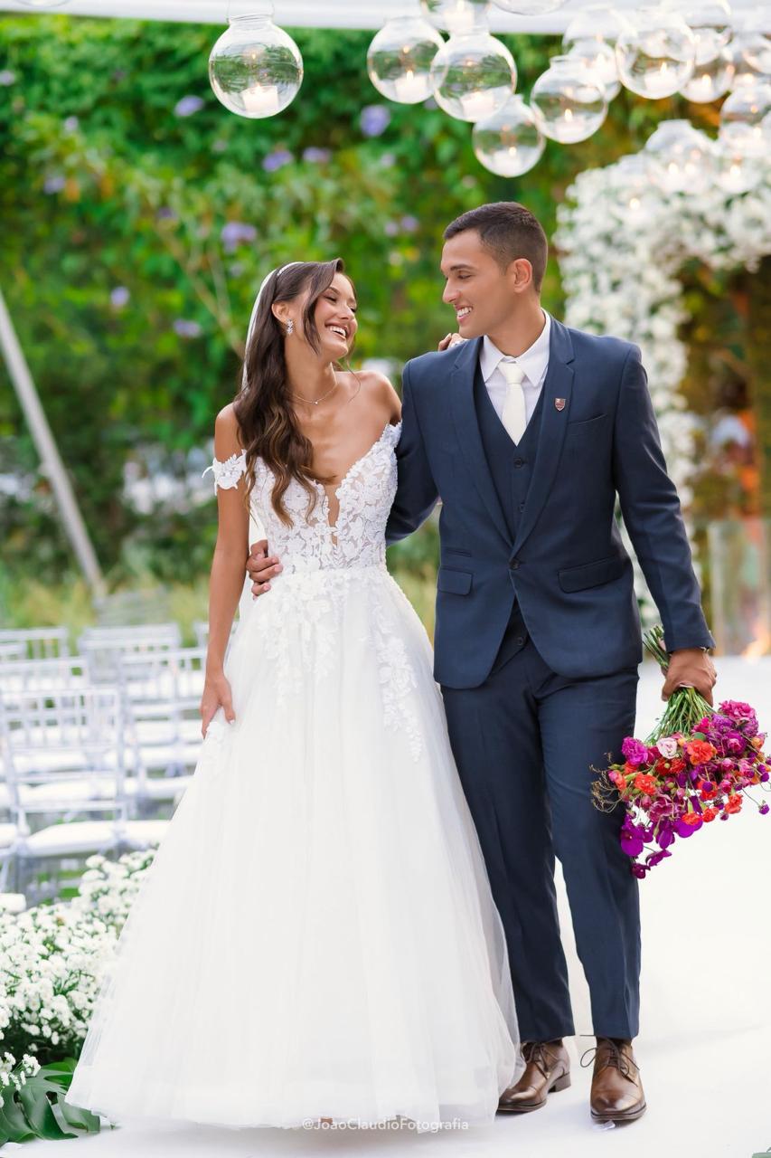 Camile irradiava uma beleza natural e uma presença marcante, com um sorriso que iluminava todo o ambiente. Para o grande dia, a noiva escolheu um deslumbrante vestido de noiva Internovias, um verdadeiro vestido princesa que valorizava sua silhueta de forma impecável. O modelo ombro a ombro apresentava um delicado decote em V e transparência, adicionando um toque de sofisticação. As mangas rendadas, removíveis, complementavam o visual com leveza. A saia, volumosa e composta por múltiplas camadas de tule, criava uma silhueta de princesa completa, com um caimento fluido e natural que acompanhava seus passos.