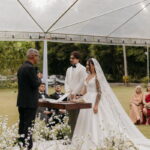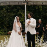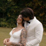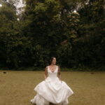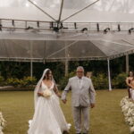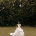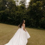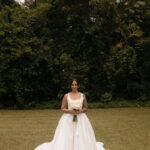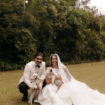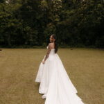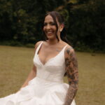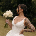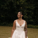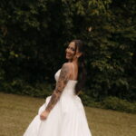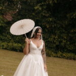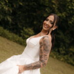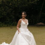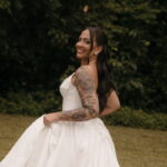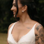 Fernanda é dessas noivas que iluminam qualquer espaço, ficamos encantada com a sua beleza! Seu vestido de noiva La Modelista estilo princesa surpreendeu com a saia volumosa que se abria no chão com caimento impecável, e a cauda comprida deslizava pelo gramado com leveza surpreendente. O decote V estruturado, com acabamento em renda delicada na beira do decote, trouxe feminilidade sem exagero. Nas costas, o corselet revelou um detalhe sensual e sofisticado, perfeito para finalizar o look com personalidade.