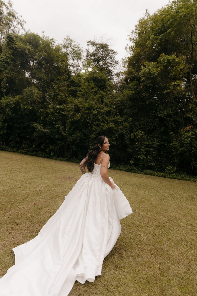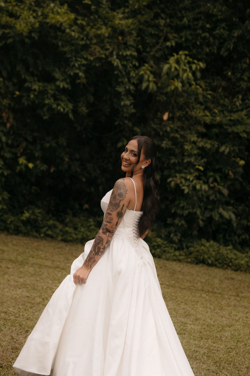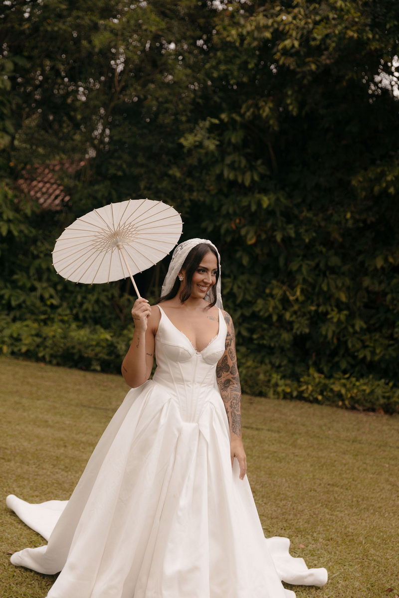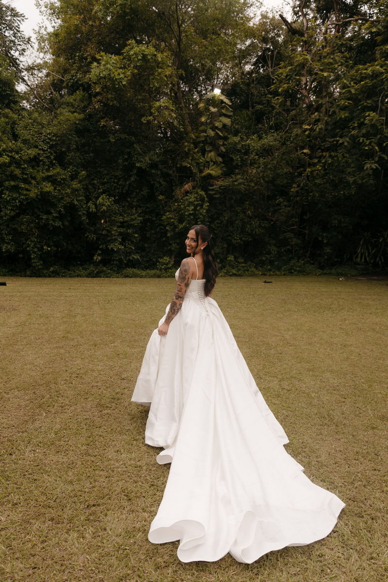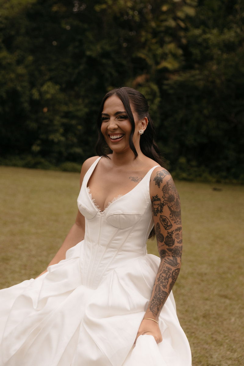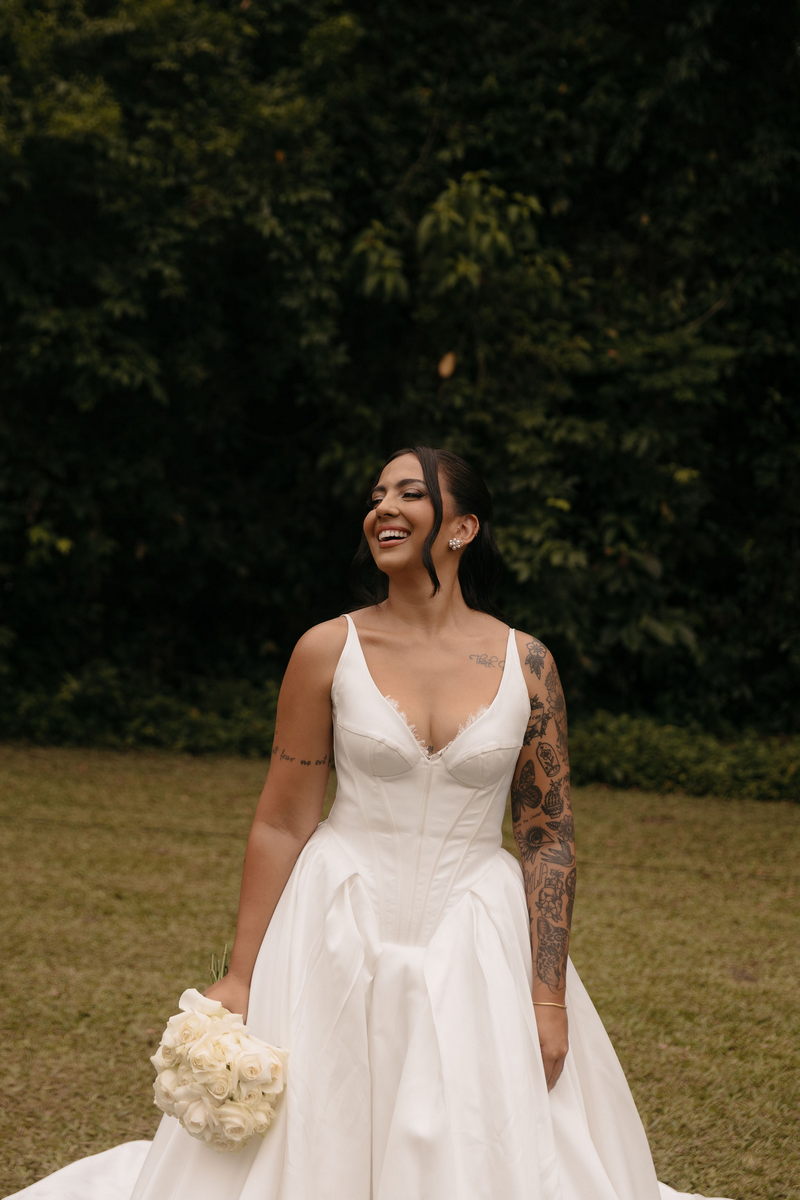 Fernanda é dessas noivas que iluminam qualquer espaço, ficamos encantada com a sua beleza! Seu vestido de noiva La Modelista estilo princesa surpreendeu com a saia volumosa que se abria no chão com caimento impecável, e a cauda comprida deslizava pelo gramado com leveza surpreendente. O decote V estruturado, com acabamento em renda delicada na beira do decote, trouxe feminilidade sem exagero. Nas costas, o corselet revelou um detalhe sensual e sofisticado, perfeito para finalizar o look com personalidade.