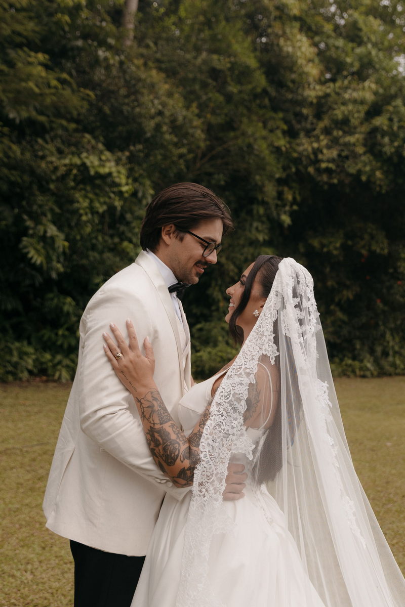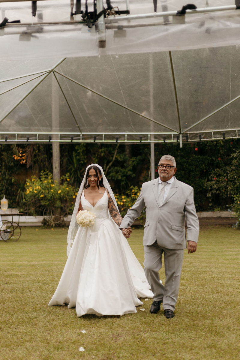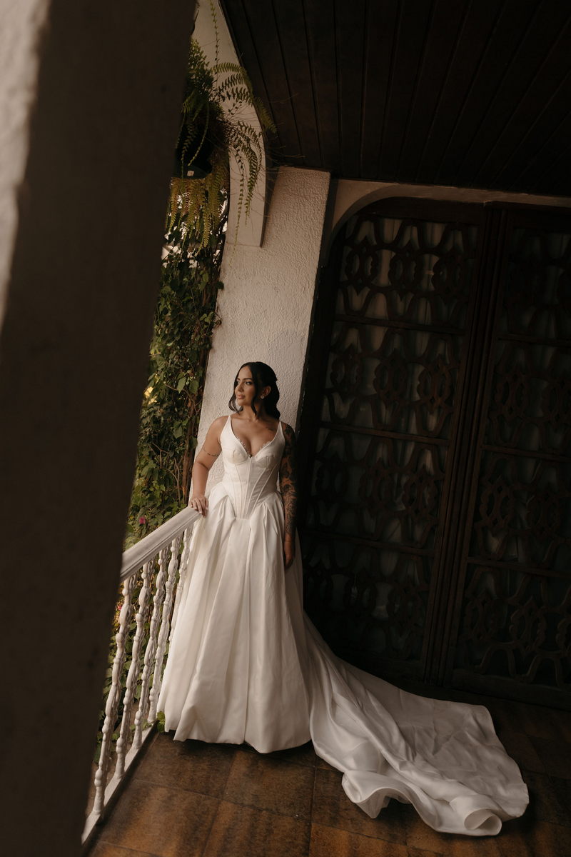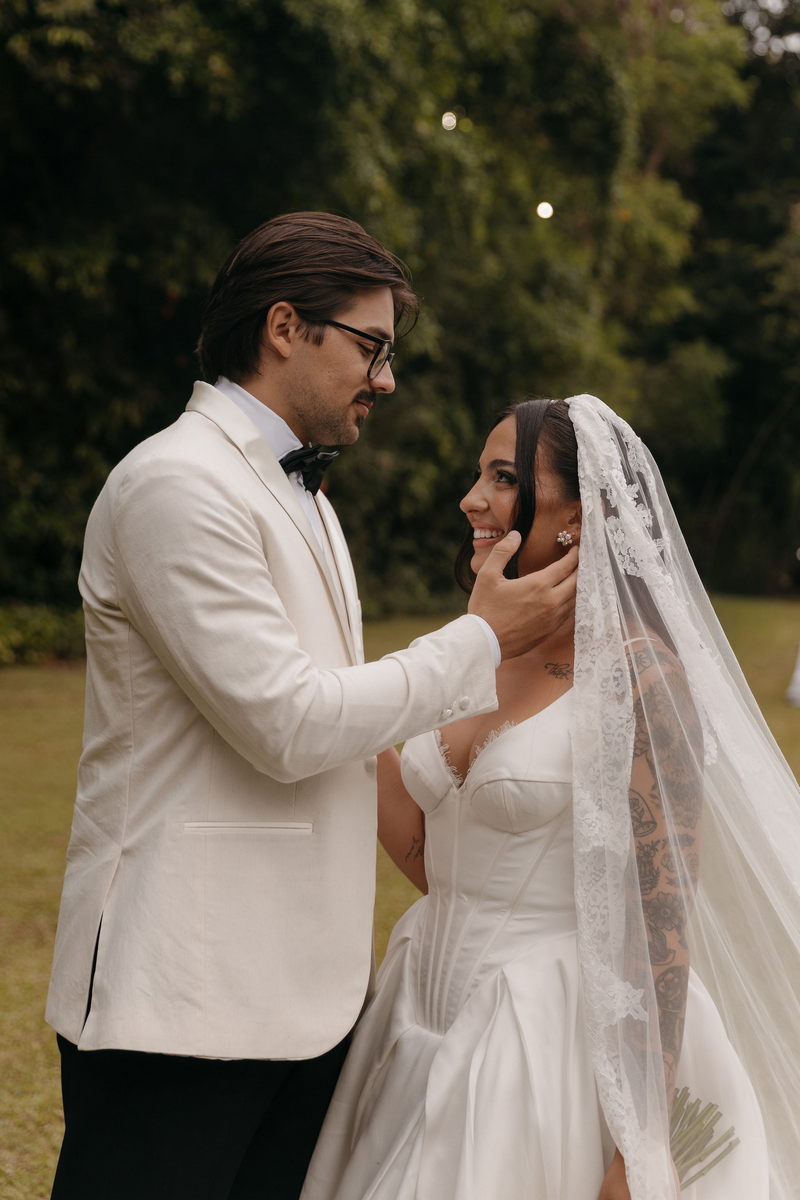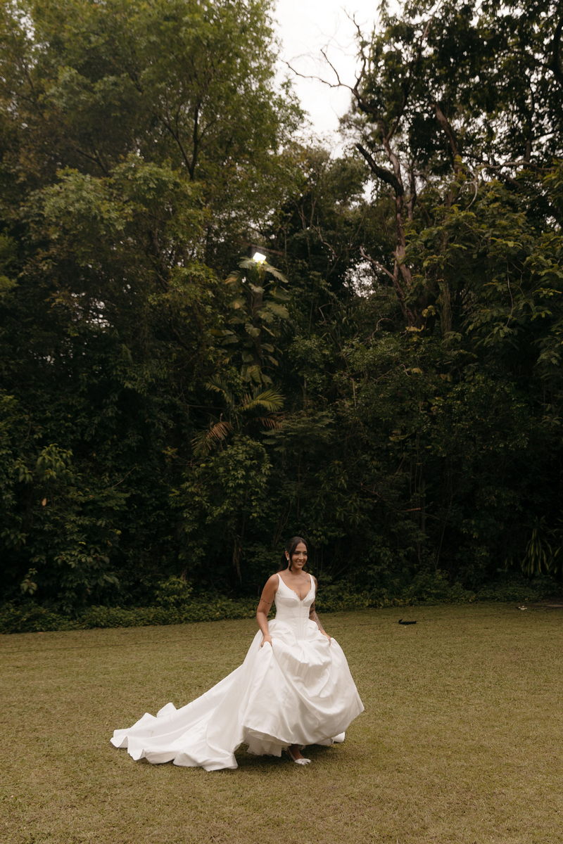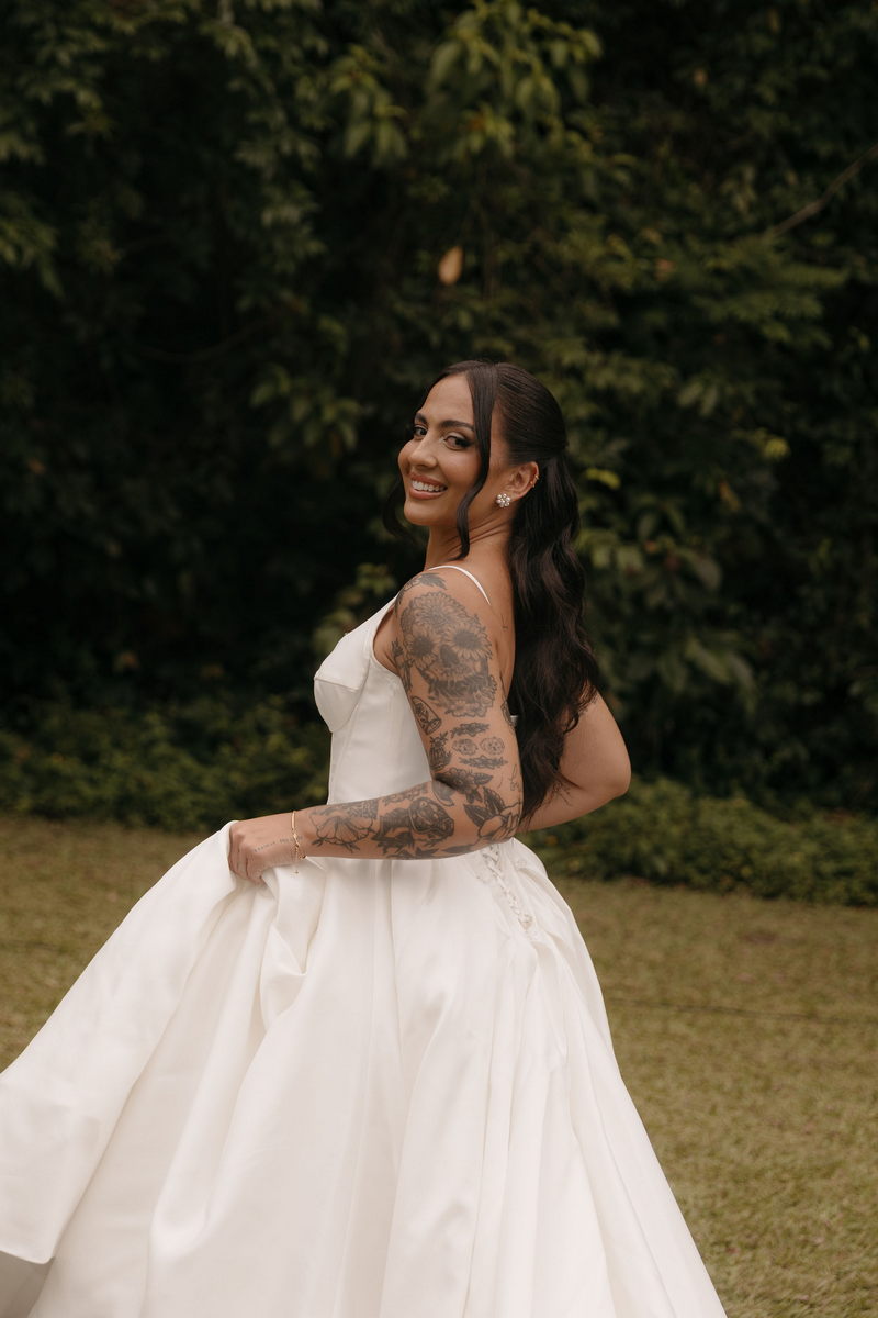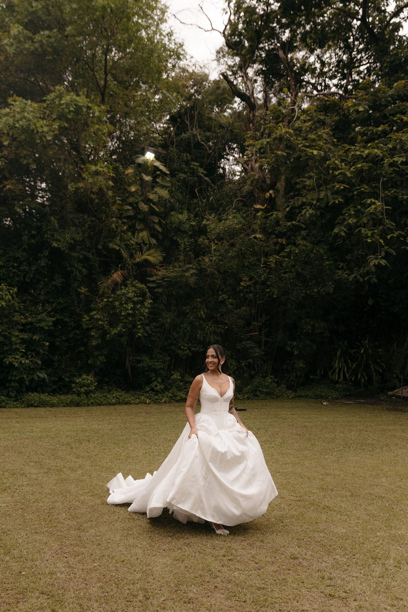 Fernanda é dessas noivas que iluminam qualquer espaço, ficamos encantada com a sua beleza! Seu vestido de noiva La Modelista estilo princesa surpreendeu com a saia volumosa que se abria no chão com caimento impecável, e a cauda comprida deslizava pelo gramado com leveza surpreendente. O decote V estruturado, com acabamento em renda delicada na beira do decote, trouxe feminilidade sem exagero. Nas costas, o corselet revelou um detalhe sensual e sofisticado, perfeito para finalizar o look com personalidade.