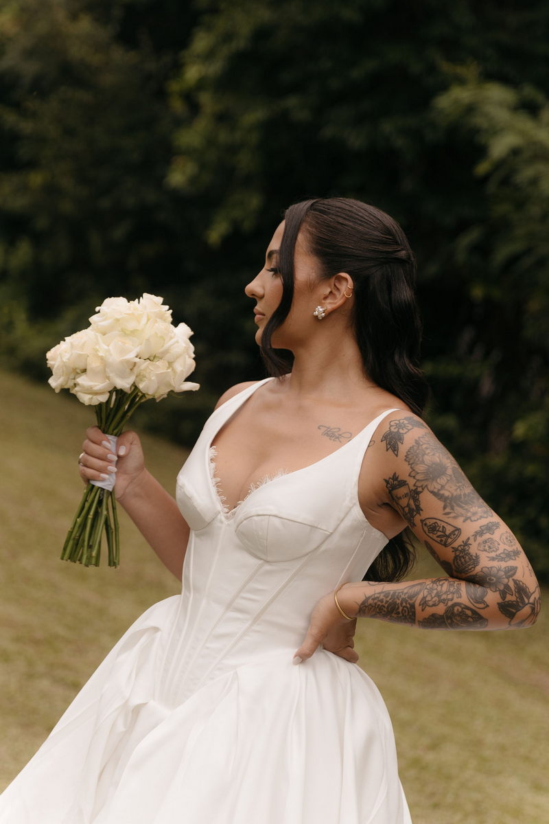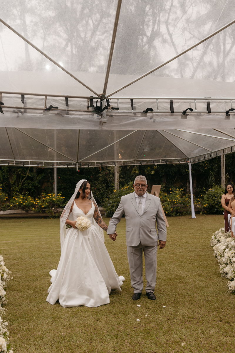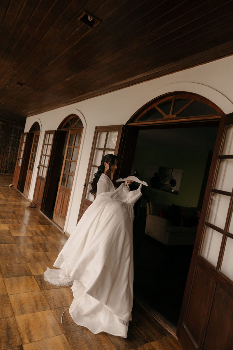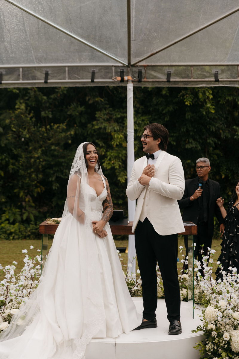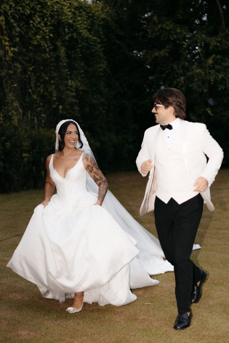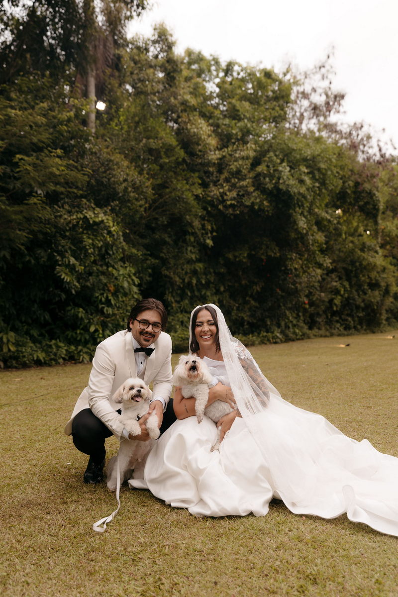 Fernanda é dessas noivas que iluminam qualquer espaço, ficamos encantada com a sua beleza! Seu vestido de noiva La Modelista estilo princesa surpreendeu com a saia volumosa que se abria no chão com caimento impecável, e a cauda comprida deslizava pelo gramado com leveza surpreendente. O decote V estruturado, com acabamento em renda delicada na beira do decote, trouxe feminilidade sem exagero. Nas costas, o corselet revelou um detalhe sensual e sofisticado, perfeito para finalizar o look com personalidade.