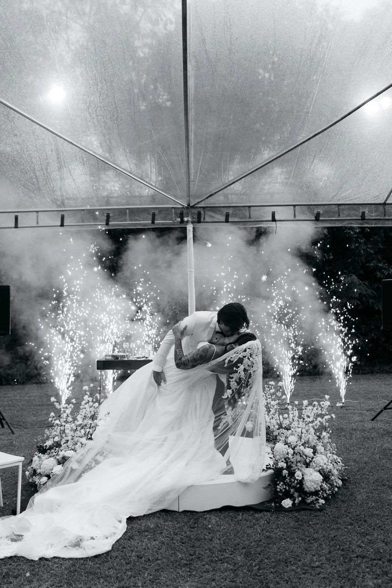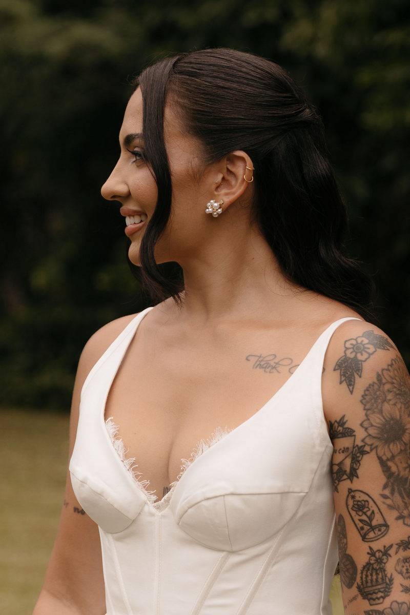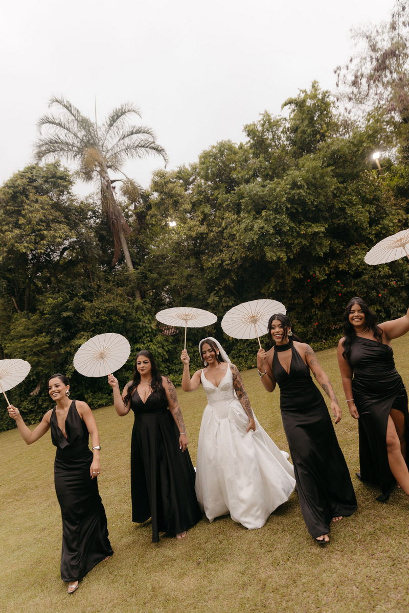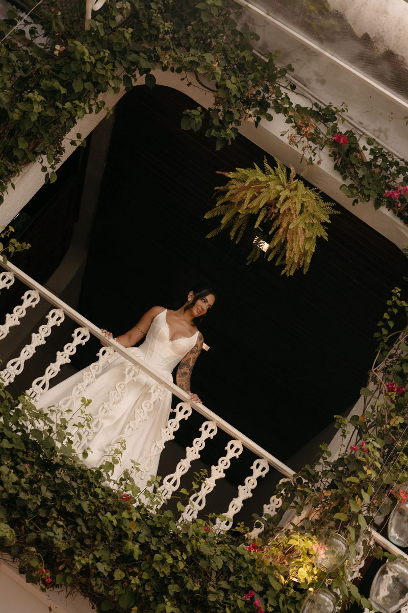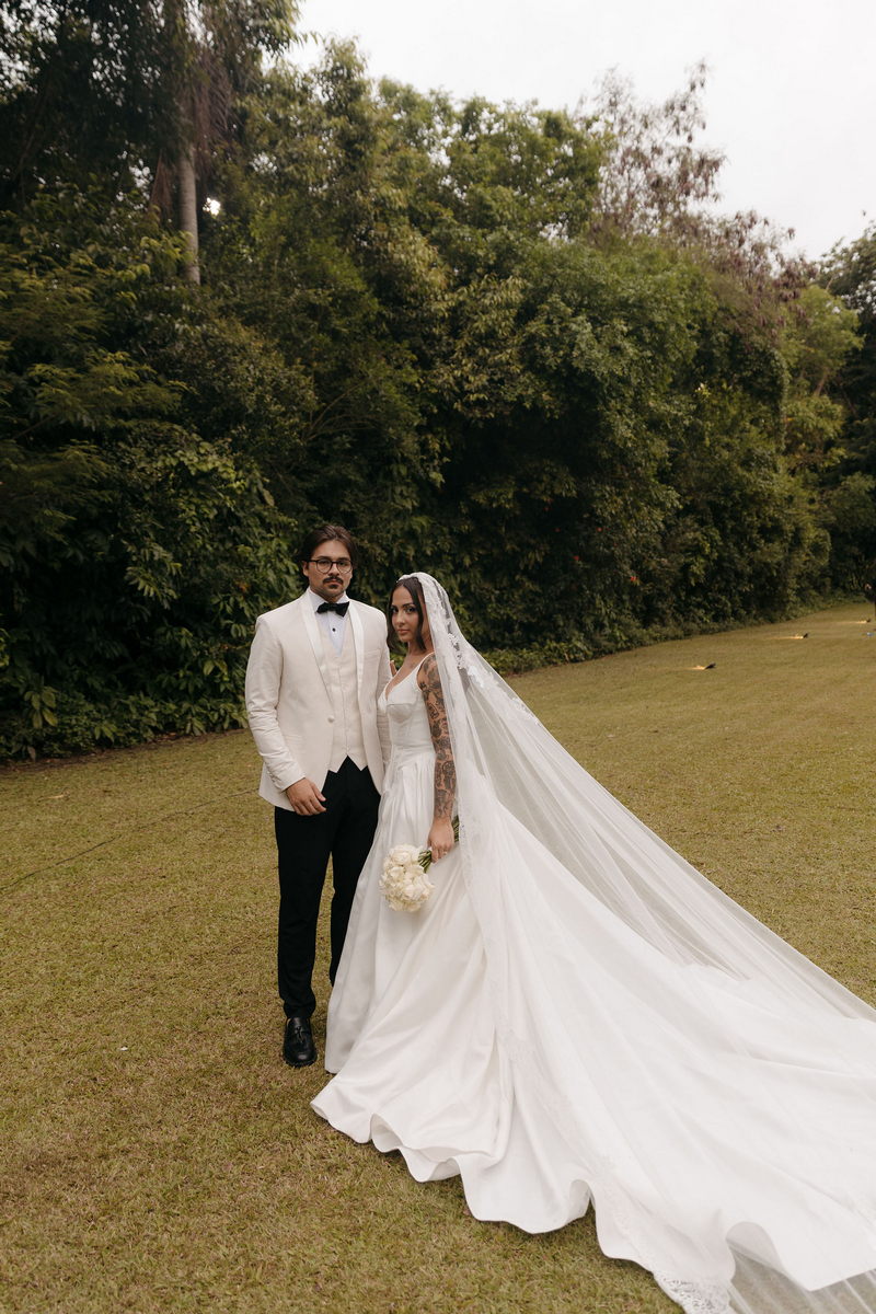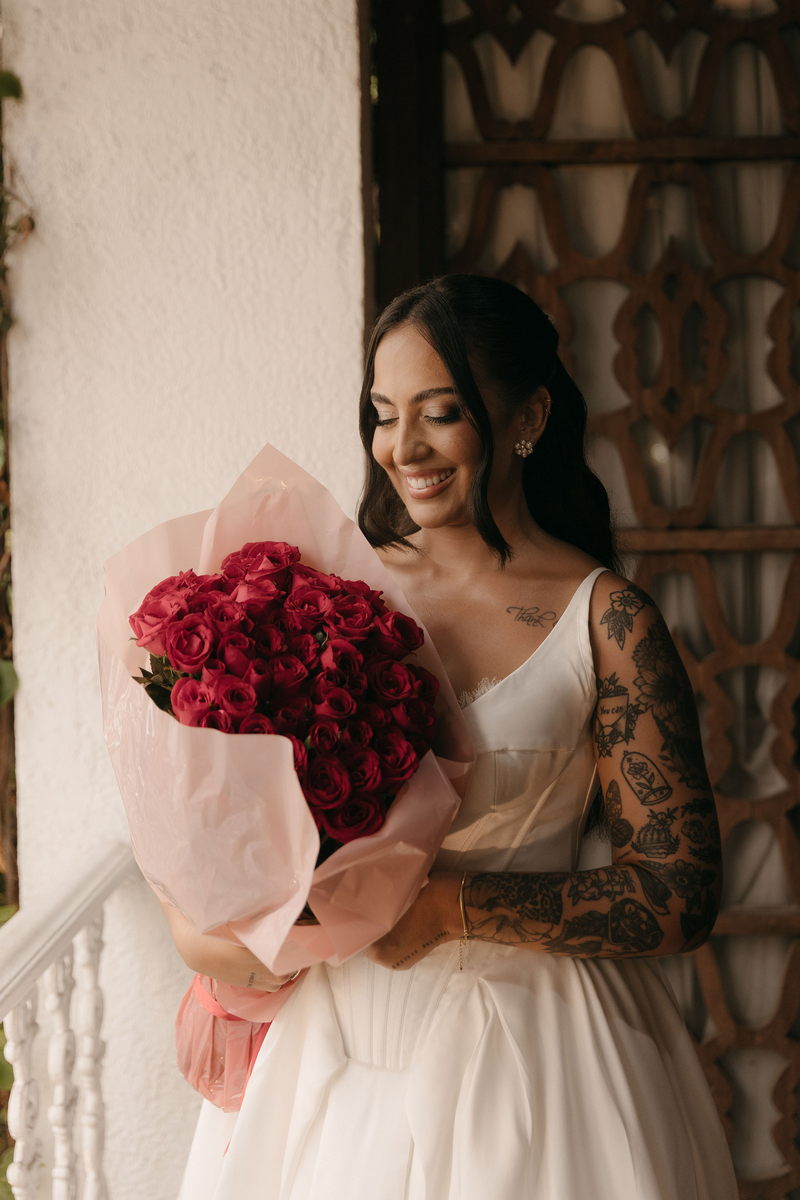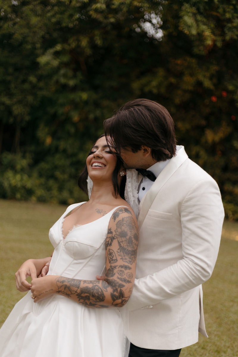 Fernanda é dessas noivas que iluminam qualquer espaço, ficamos encantada com a sua beleza! Seu vestido de noiva La Modelista estilo princesa surpreendeu com a saia volumosa que se abria no chão com caimento impecável, e a cauda comprida deslizava pelo gramado com leveza surpreendente. O decote V estruturado, com acabamento em renda delicada na beira do decote, trouxe feminilidade sem exagero. Nas costas, o corselet revelou um detalhe sensual e sofisticado, perfeito para finalizar o look com personalidade.