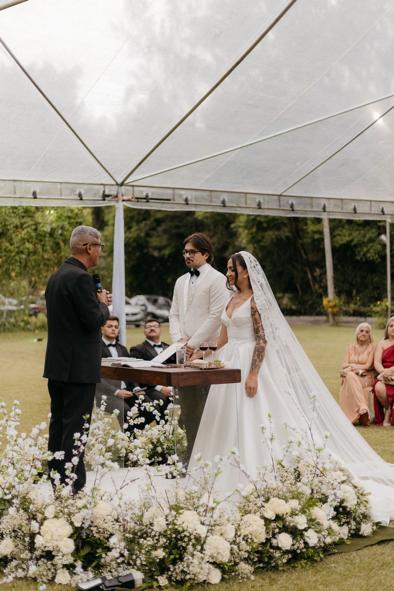 Para um casamento assim, cada profissional contribuiu com sua melhor entrega. A beleza de Fernanda ganhou equilíbrio e destaque nas mãos de @nathmatosmakeup, que optou por uma maquiagem que realçava os traços da noiva sem ofuscar sua naturalidade. A cerimônia e a recepção fluíram perfeitamente graças ao trabalho sensível e preciso de @camicerimonialista, que orquestrou cada momento para que os dois pudessem estar presentes no dia sem se preocupar com nada além do que sentiam.