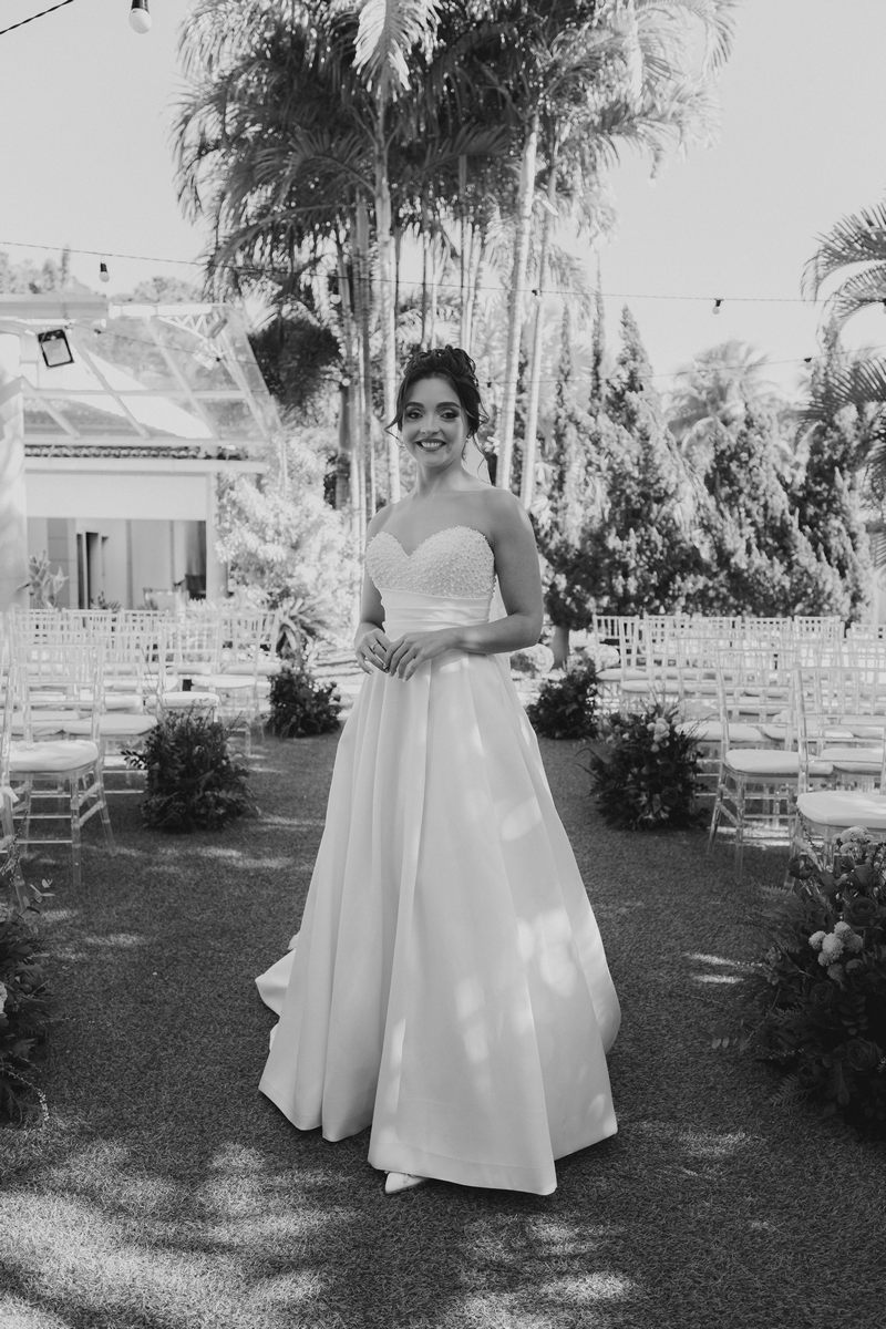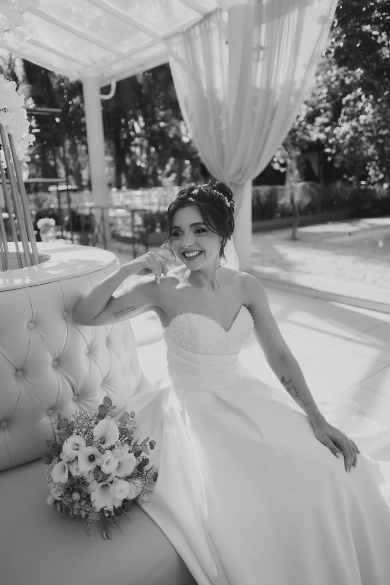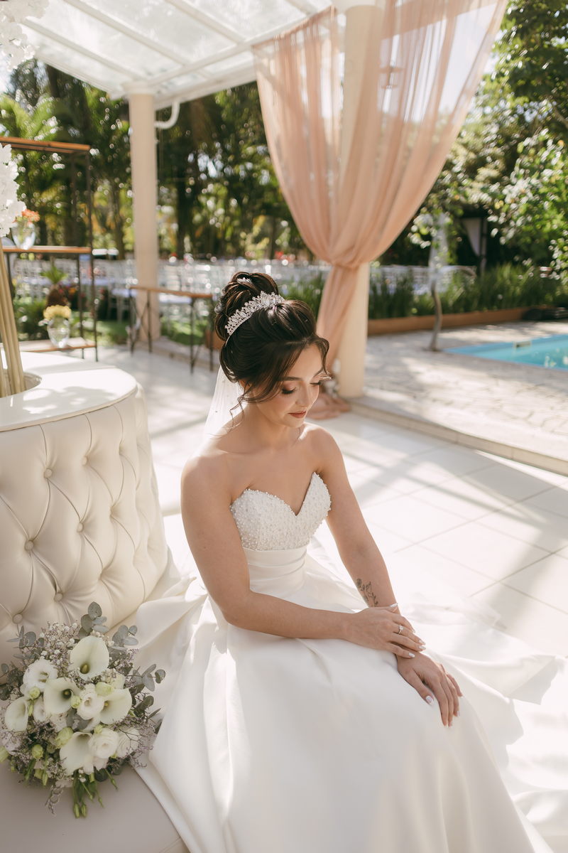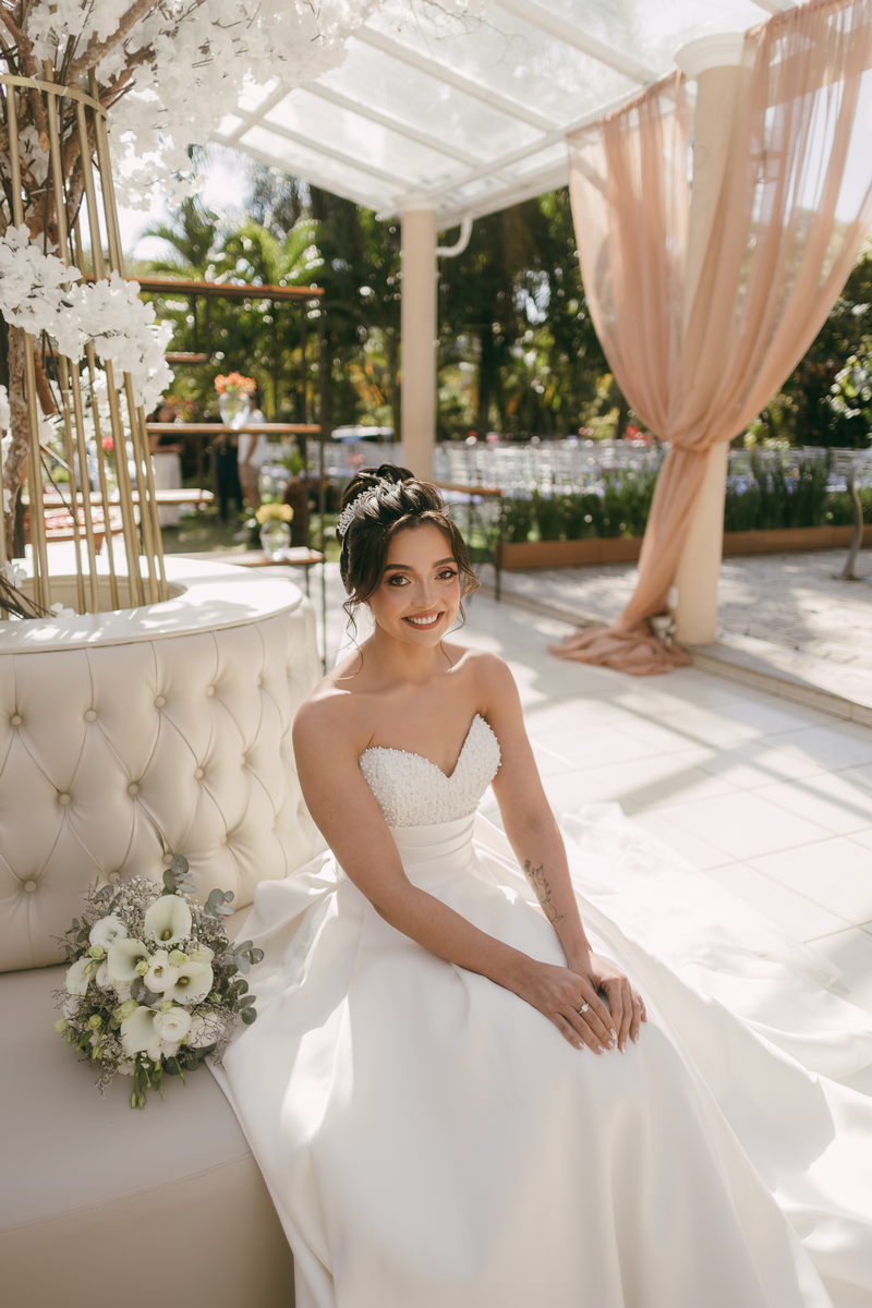 A Letícia estava belíssima de noiva! Ela escolheu um vestido de noiva La Modelista modelo evasê tomara que caia, com uma cauda maravilhosa. A peça se destacava pelo seu corpete estruturado com detalhes delicados em pérolas, que complementavam o minimalismo do vestido de forma romântica e sofisticada. A produção da noiva ficou por conta da talentosa @atelierbrunaguimaraes, que criou um visual natural e luminoso, realçando a beleza única da Letícia.