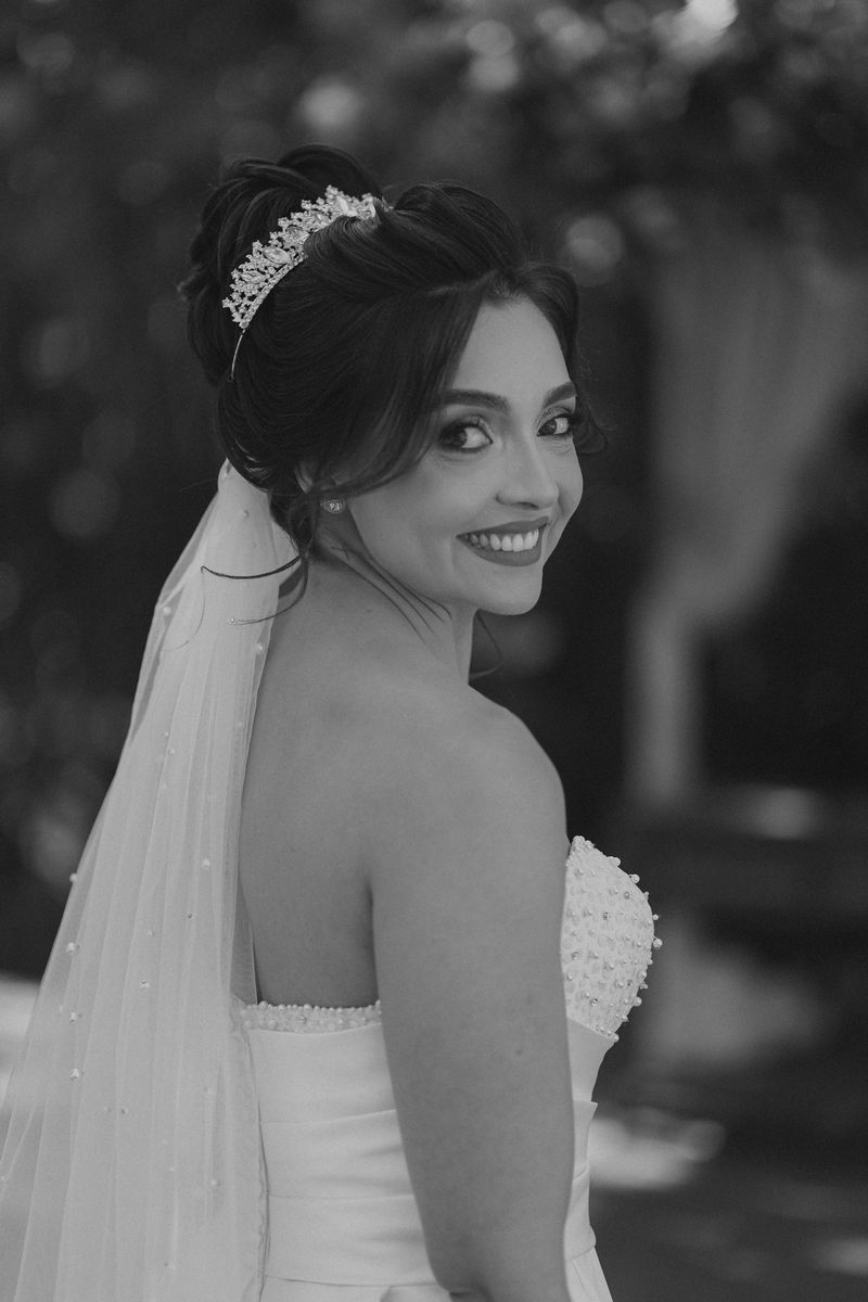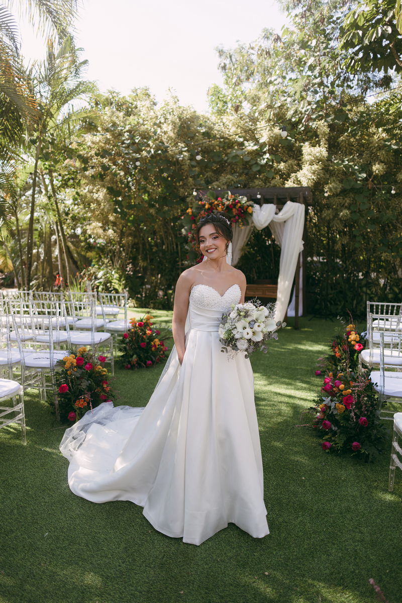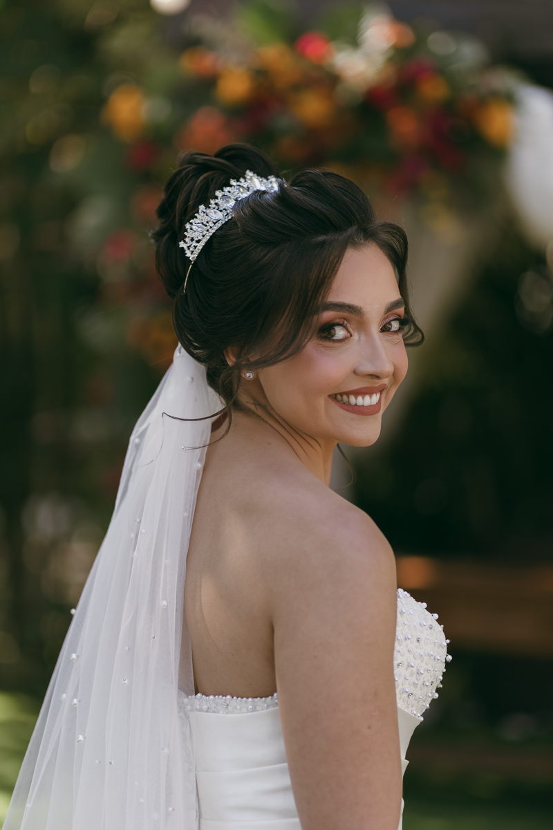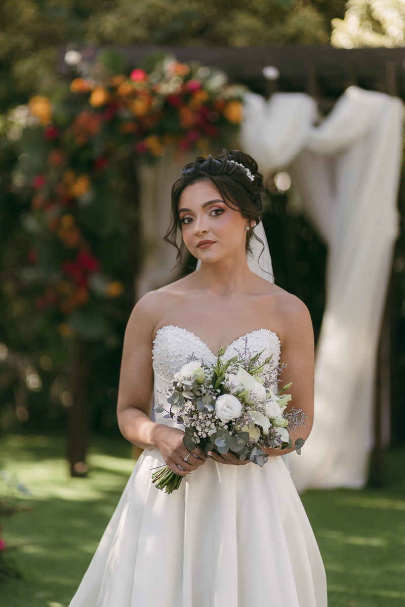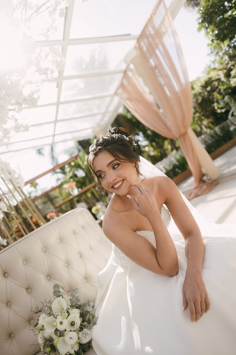 A Letícia estava belíssima de noiva! Ela escolheu um vestido de noiva La Modelista modelo evasê tomara que caia, com uma cauda maravilhosa. A peça se destacava pelo seu corpete estruturado com detalhes delicados em pérolas, que complementavam o minimalismo do vestido de forma romântica e sofisticada. A produção da noiva ficou por conta da talentosa @atelierbrunaguimaraes, que criou um visual natural e luminoso, realçando a beleza única da Letícia.