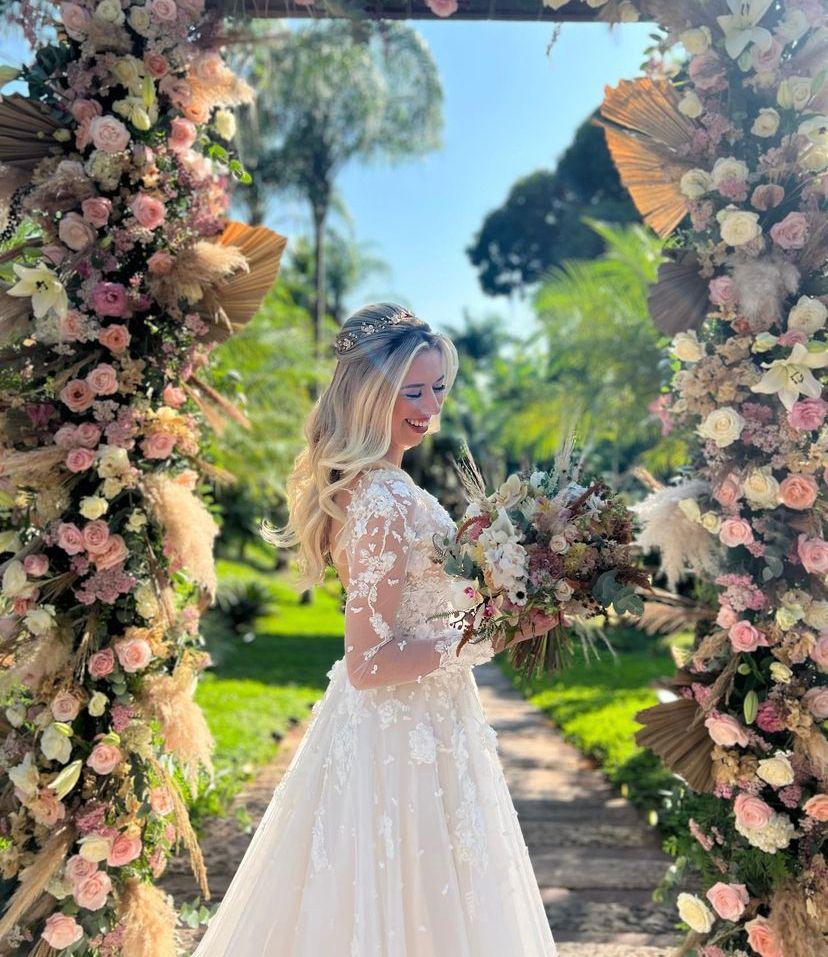 Carol estava maravilhosa de noiva, como uma linda princesa. Ela optou por um vestido de noiva La Modelista estilo princesa, super romântico, com belíssimo trabalho em renda e transparência, deixando-a ainda mais bela.
