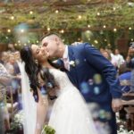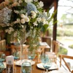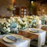 A atmosfera do casamento foi cuidadosamente pensada, com uma paleta de cores verde e branco, enriquecida por detalhes em azul claro. A decoração, que parecia ter saído de um conto de fadas, proporcionou aos convidados uma experiência de aconchego e beleza, que foi complementada pela natureza do Vale dos Sonhos.