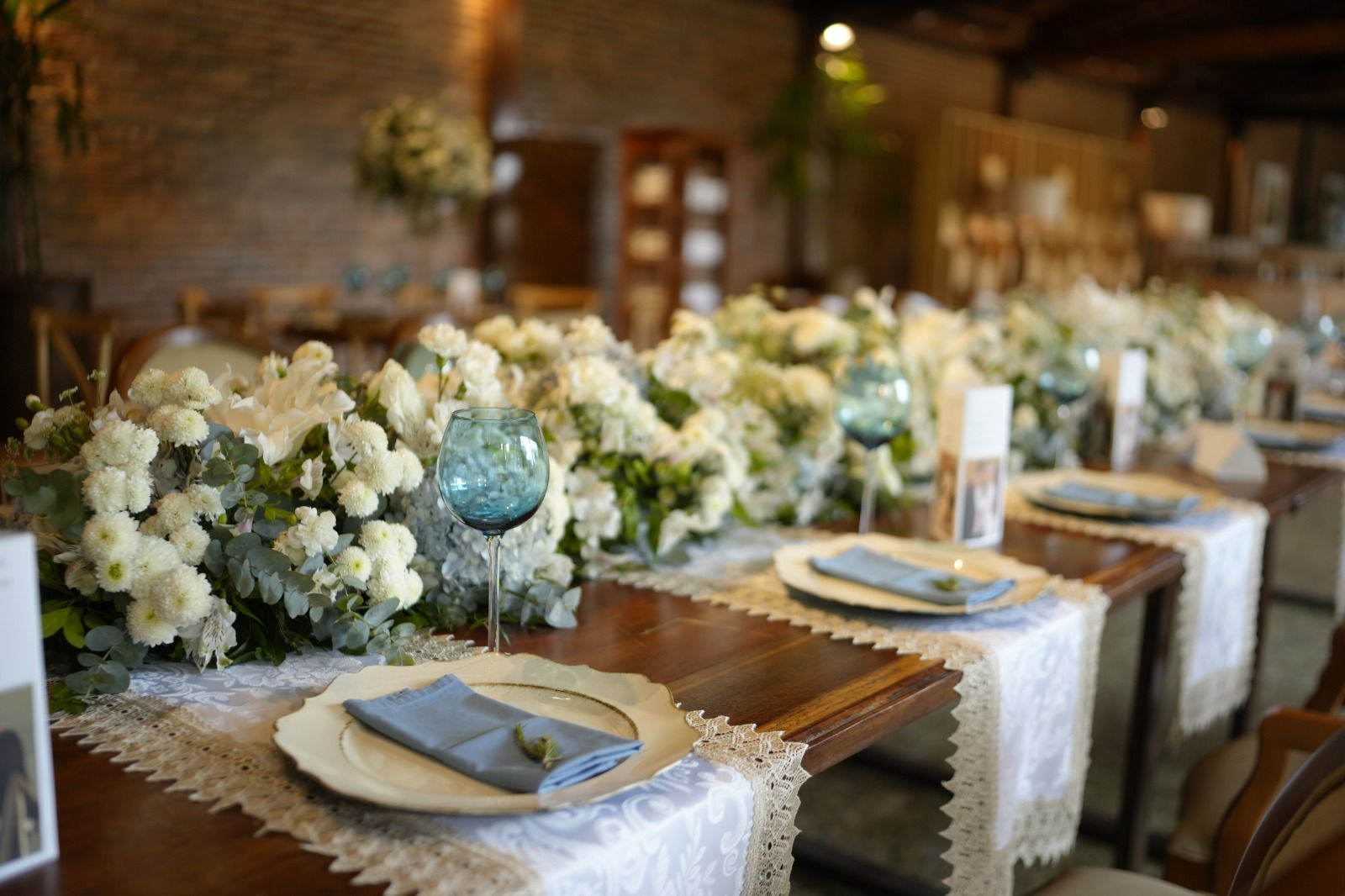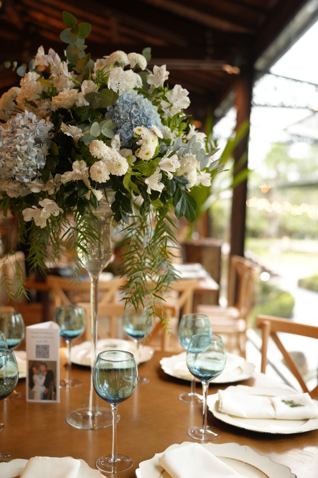 A atmosfera do casamento foi cuidadosamente pensada, com uma paleta de cores verde e branco, enriquecida por detalhes em azul claro. A decoração, que parecia ter saído de um conto de fadas, proporcionou aos convidados uma experiência de aconchego e beleza, que foi complementada pela natureza do Vale dos Sonhos.