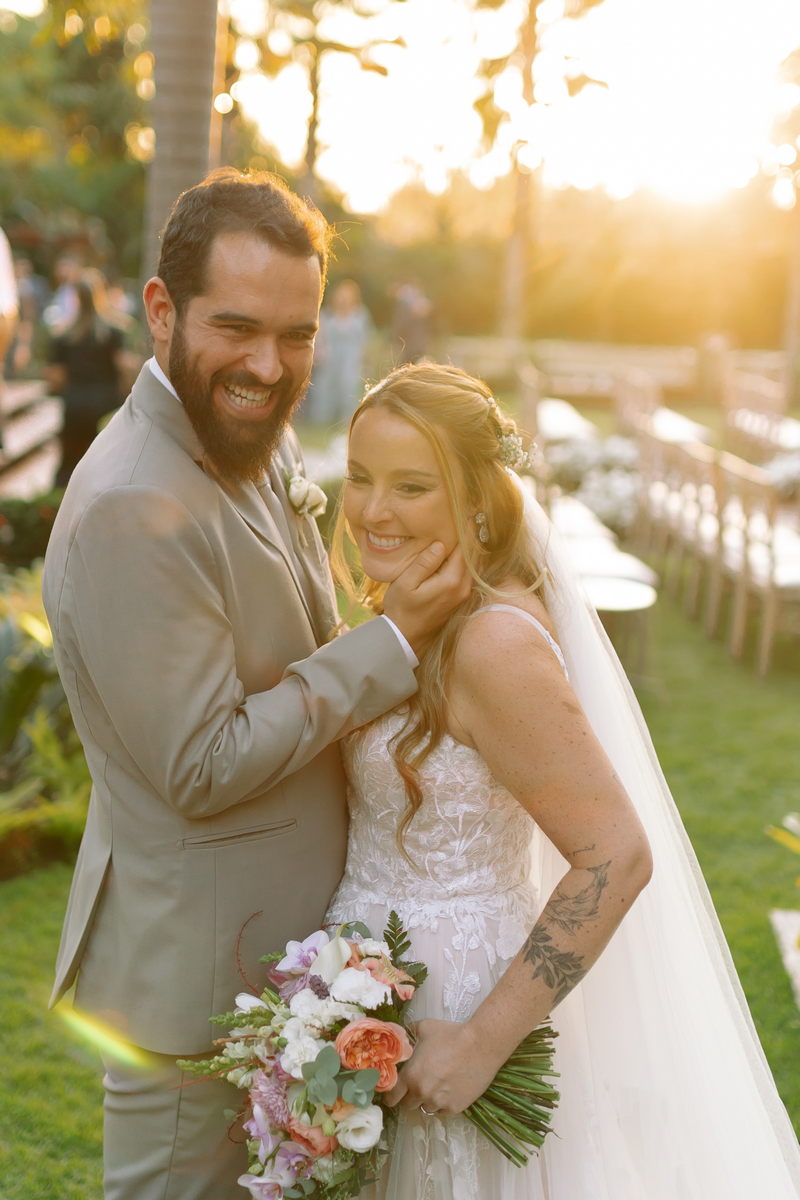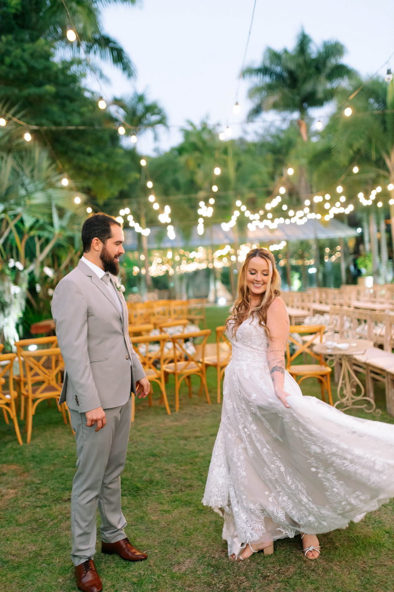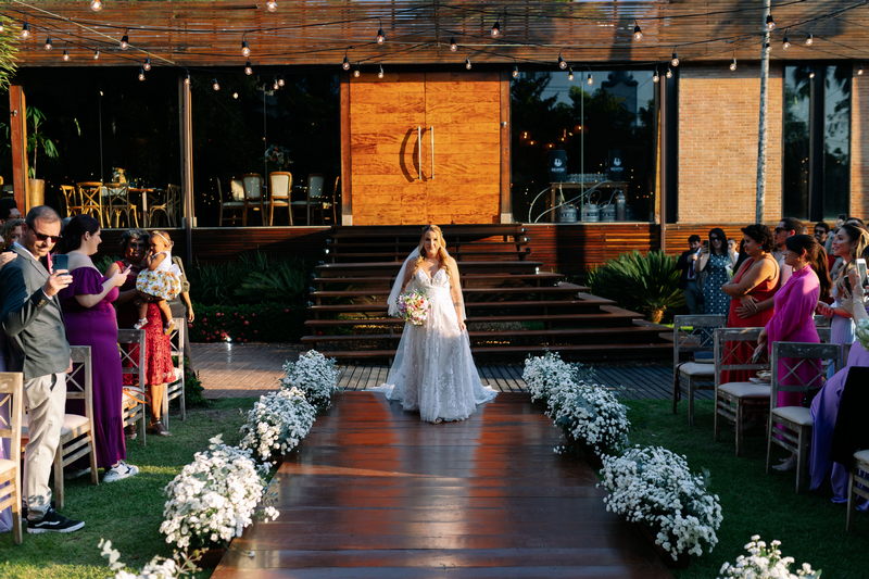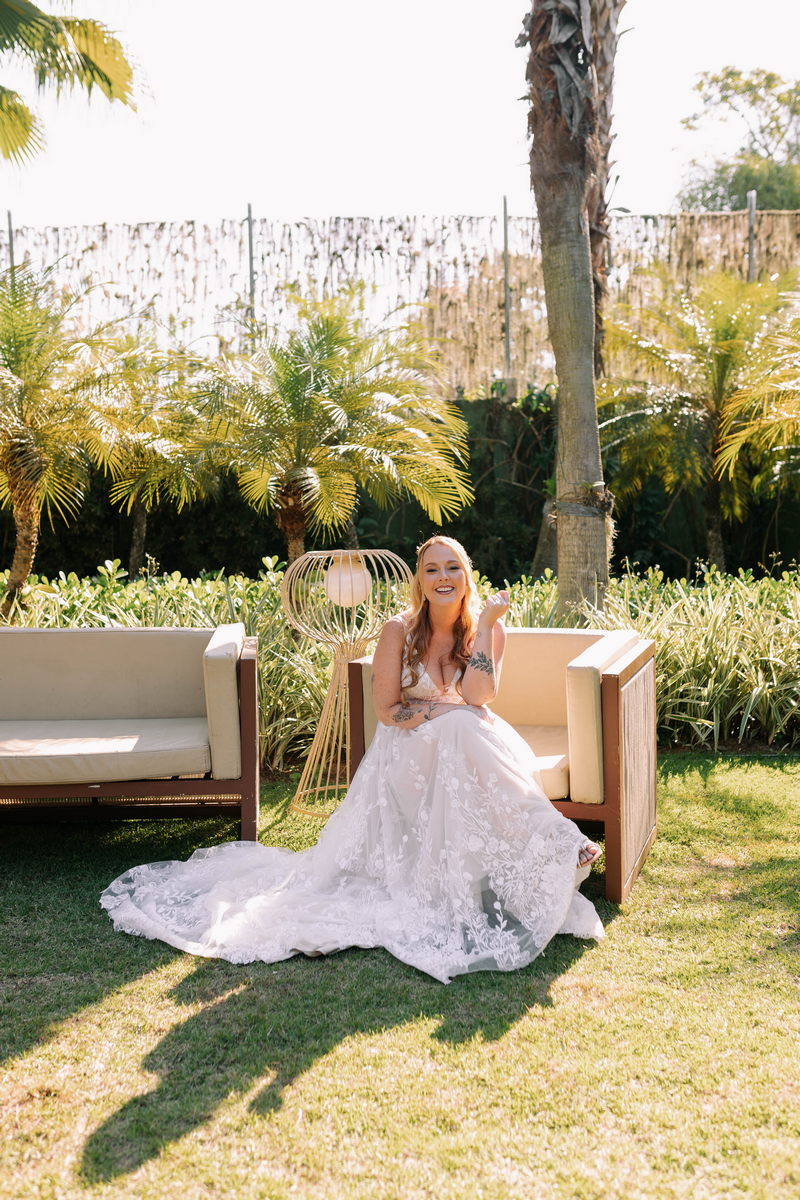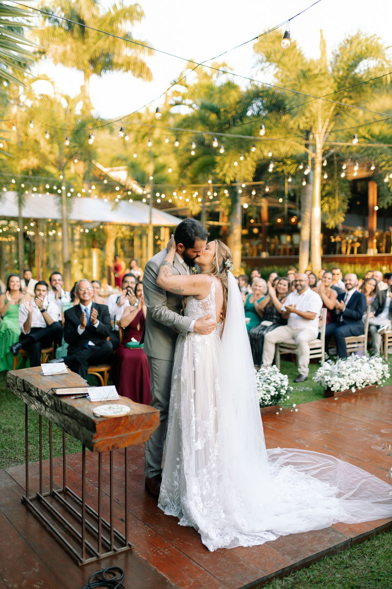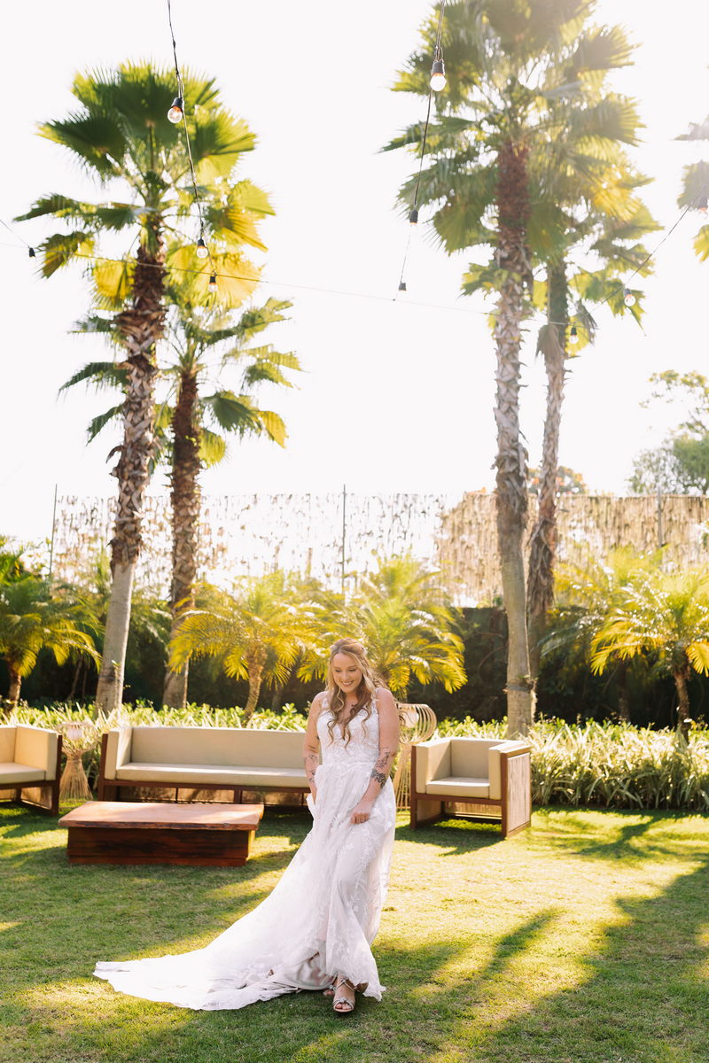 O destaque da cerimônia foi, sem dúvida, o magnífico vestido de noiva da Winnie, da marca La Modelista. Um modelo estilo princesa, cuidadosamente rendado, onde cada detalhe  parecia contar a história de sua jornada até aquele momento. O trabalho em transparência nas costas acrescentou um toque de modernidade e que trouxe ainda mais encanto. A maquiagem delicada e refinada da @sol_vianna ressaltou a expressão radiante da noiva, complementando perfeitamente o seu vestido e a atmosfera do casamento ao ar livre.
