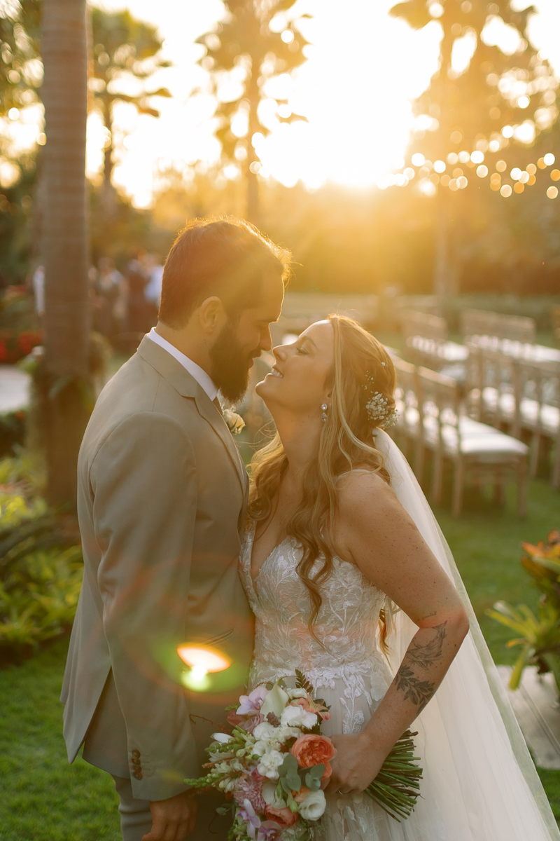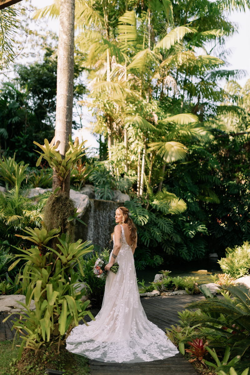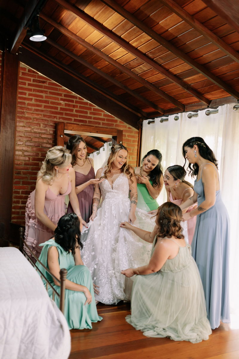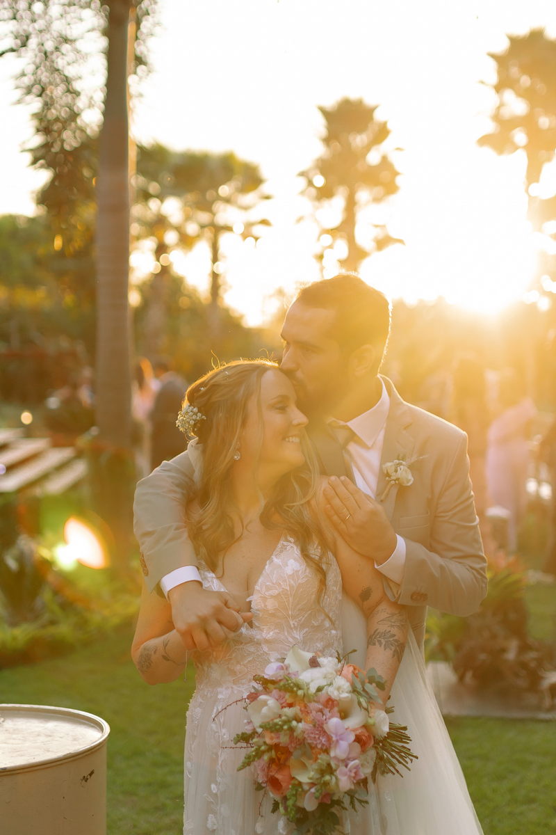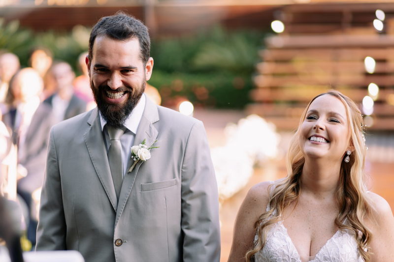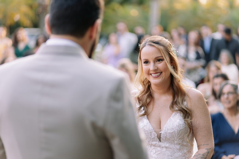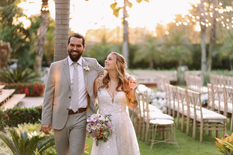 O destaque da cerimônia foi, sem dúvida, o magnífico vestido de noiva da Winnie, da marca La Modelista. Um modelo estilo princesa, cuidadosamente rendado, onde cada detalhe  parecia contar a história de sua jornada até aquele momento. O trabalho em transparência nas costas acrescentou um toque de modernidade e que trouxe ainda mais encanto. A maquiagem delicada e refinada da @sol_vianna ressaltou a expressão radiante da noiva, complementando perfeitamente o seu vestido e a atmosfera do casamento ao ar livre.