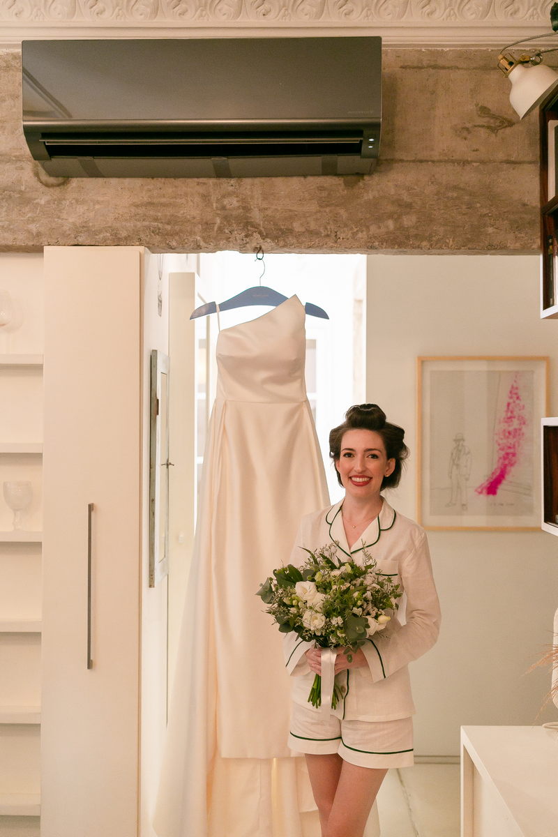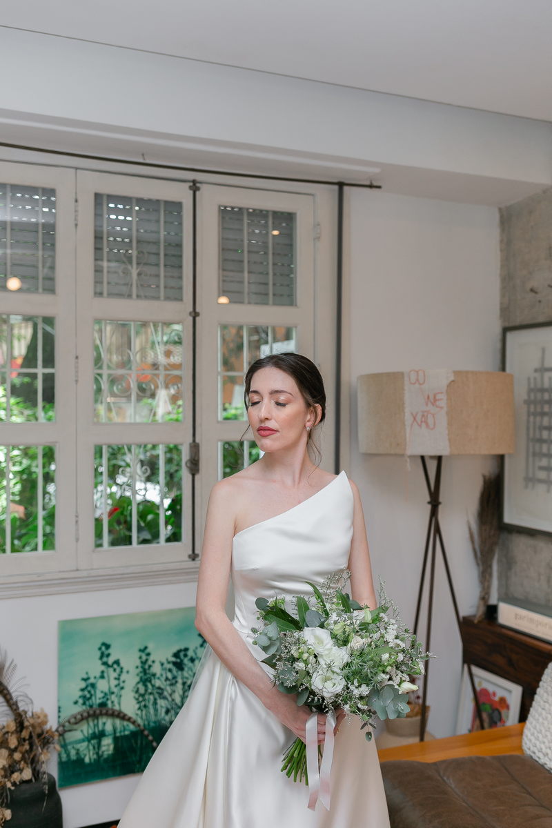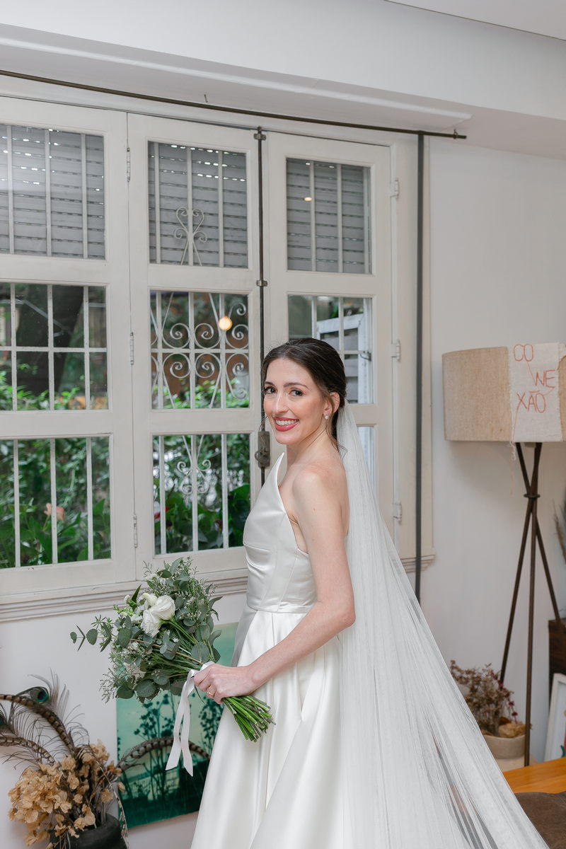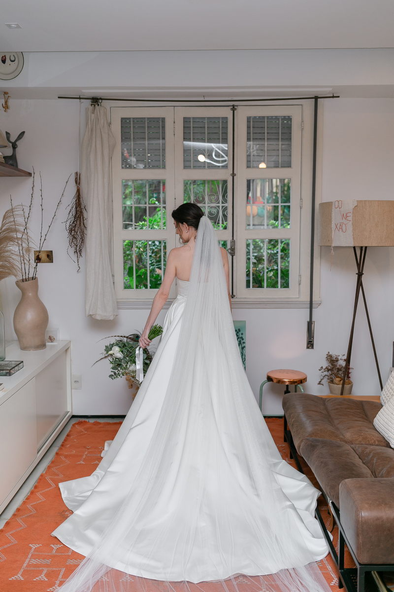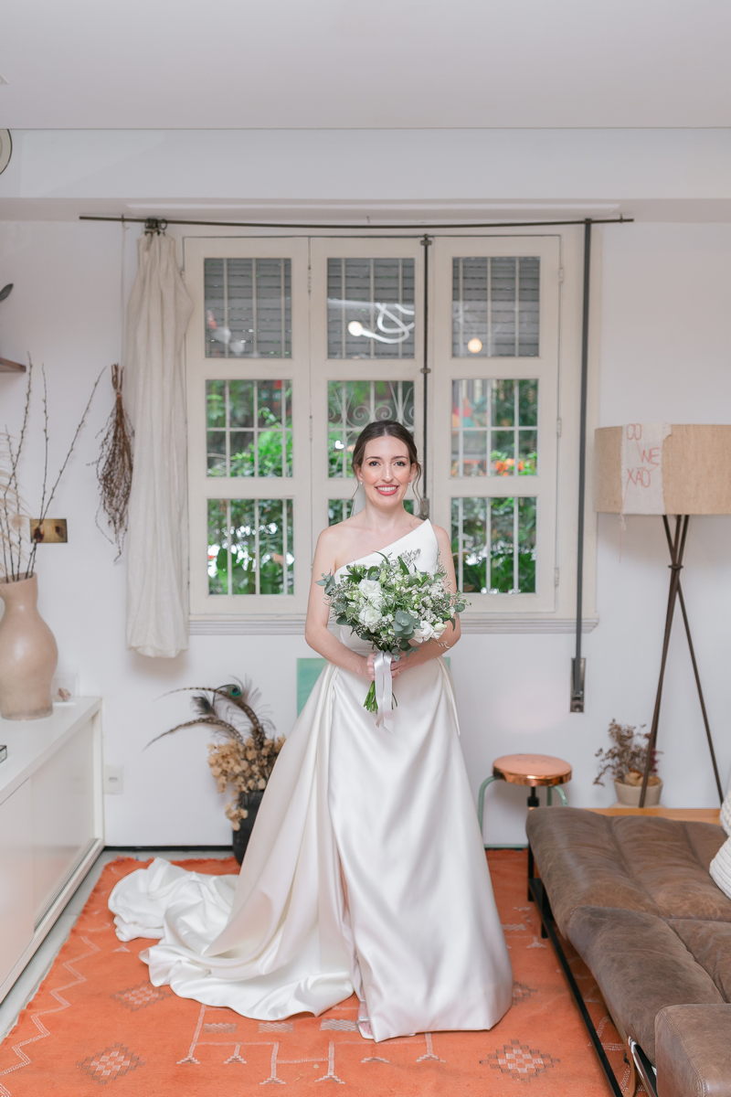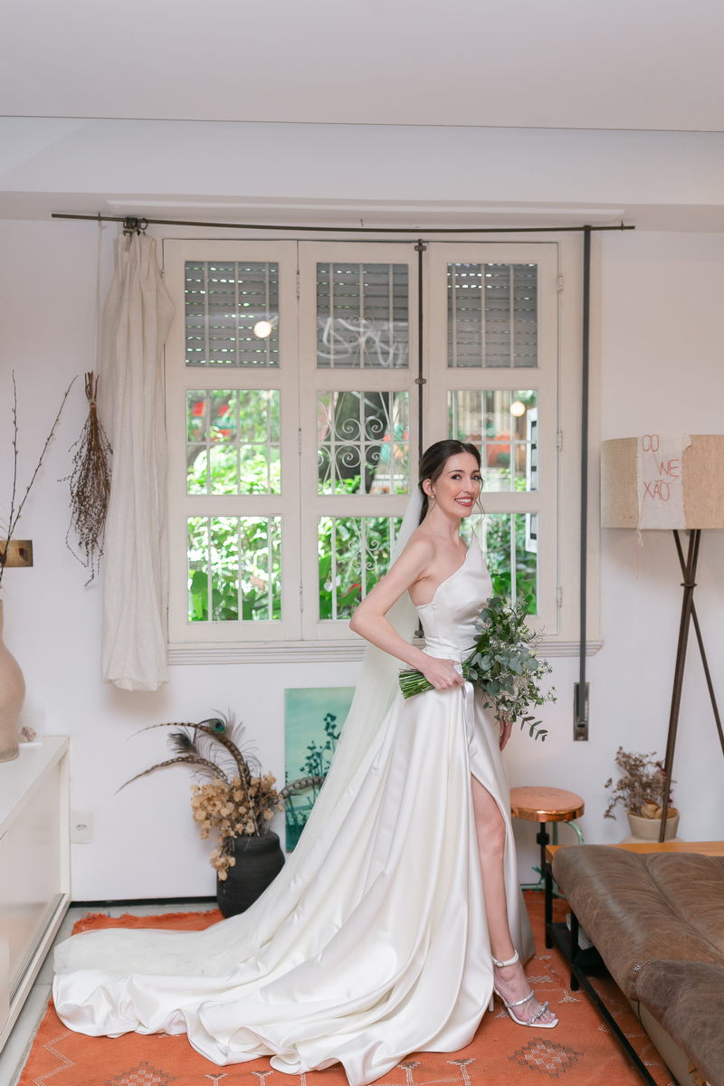 A Bel estava absolutamente deslumbrante em seu vestido de noiva minimalista. O design diferenciado de um ombro só, adicionou um toque de sofisticação e modernidade ao look. A saia do vestido apresentava uma fenda frontal elegante, que conferiu movimento e graça a cada passo da noiva. O vestido da renomada loja de noiva La Modelista, foi a escolha perfeita, destacando a beleza e seu estilo único.