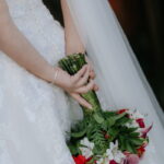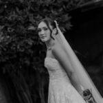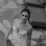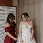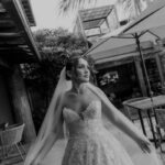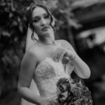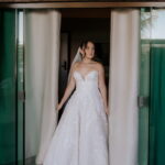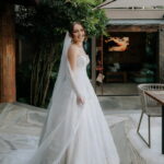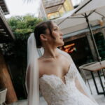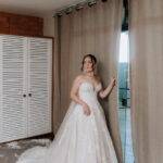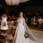 Lethycia estava absolutamente deslumbrante de noiva. Seu vestido de noiva La Modelista era um modelo evasê com caimento impecável. O decote tomara-que-caia em formato de coração, com painel de tule, trouxe modernidade e sensualidade ao visual. A renda floral aplicada em toda a peça trazia bordados delicados que se estendiam do corpete estruturado até a saia. A cauda, com acabamento em renda, abria-se majestosamente sobre o chão.