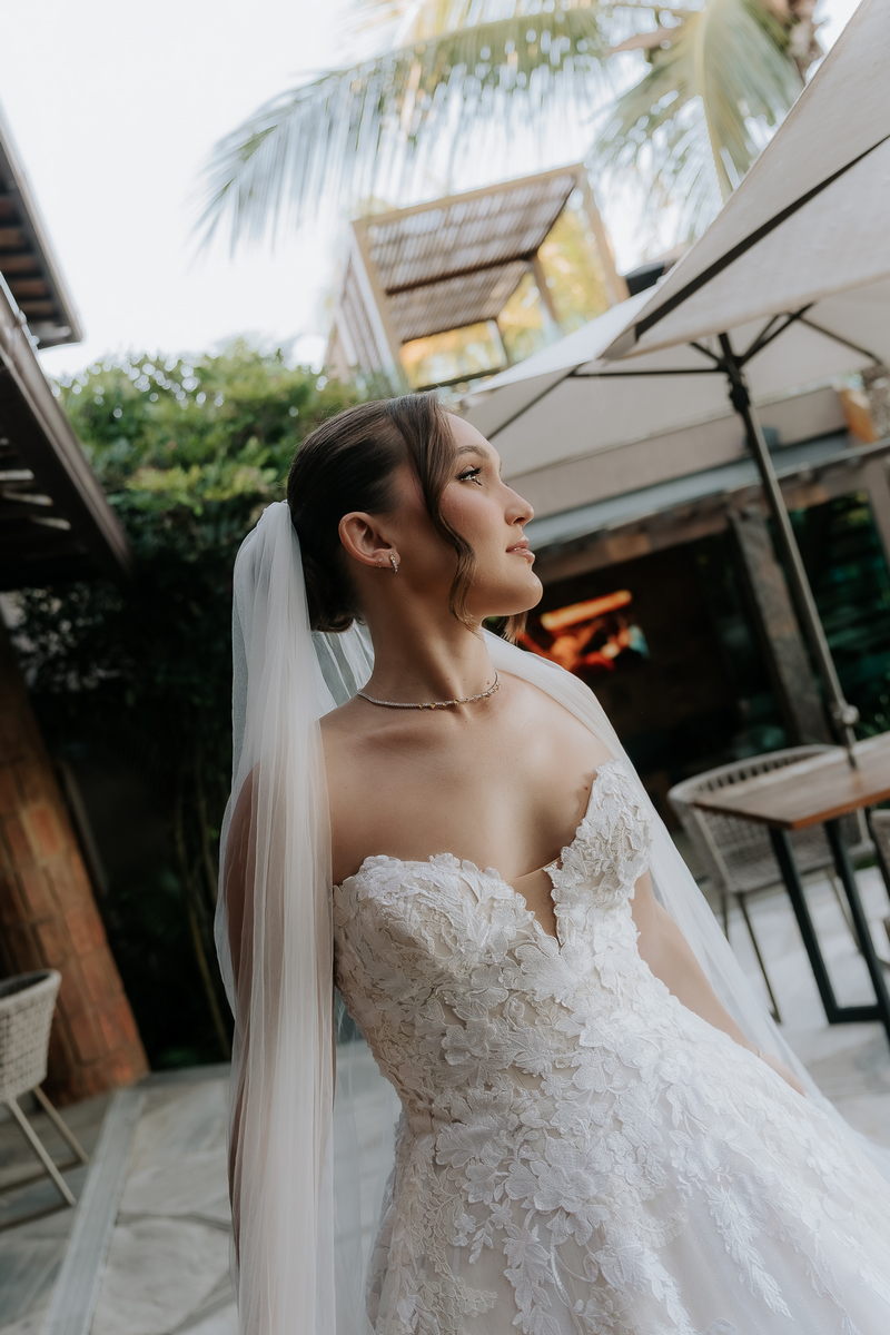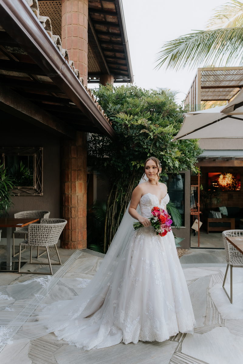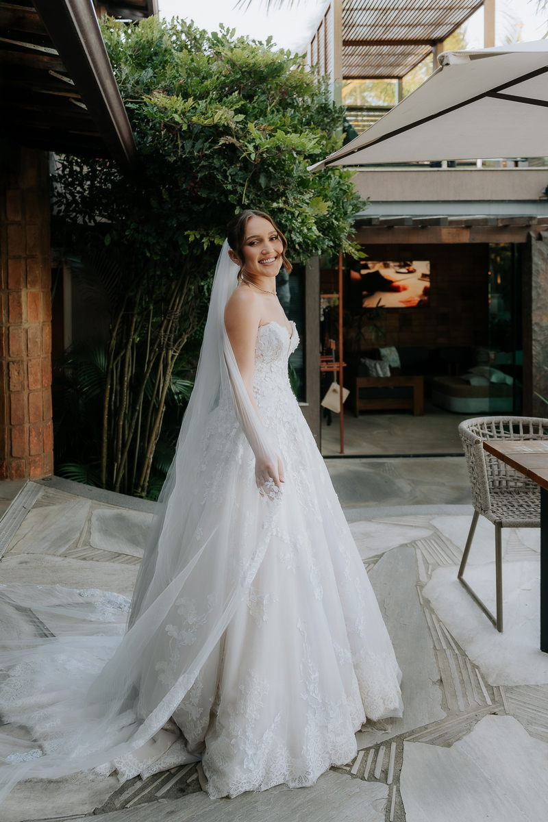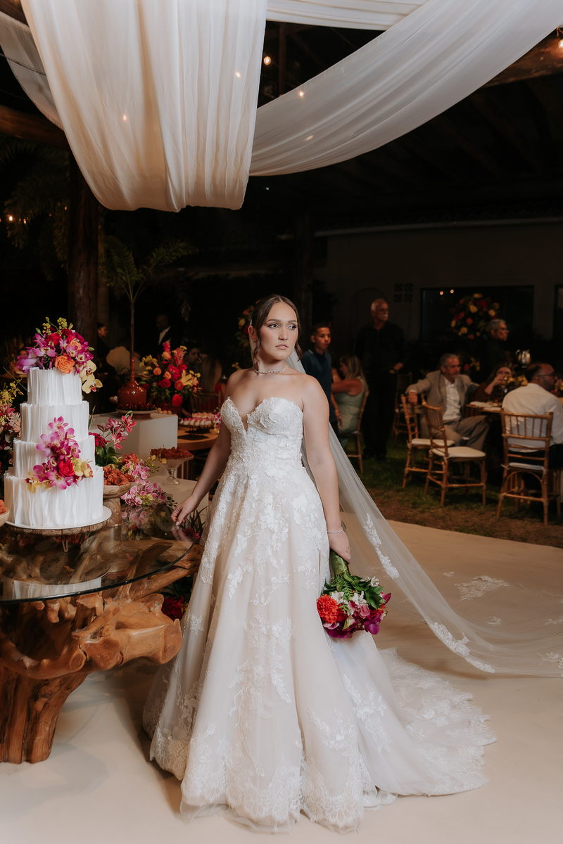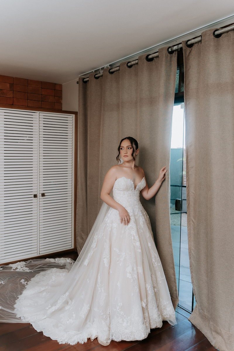 Lethycia estava absolutamente deslumbrante de noiva. Seu vestido de noiva La Modelista era um modelo evasê com caimento impecável. O decote tomara-que-caia em formato de coração, com painel de tule, trouxe modernidade e sensualidade ao visual. A renda floral aplicada em toda a peça trazia bordados delicados que se estendiam do corpete estruturado até a saia. A cauda, com acabamento em renda, abria-se majestosamente sobre o chão.