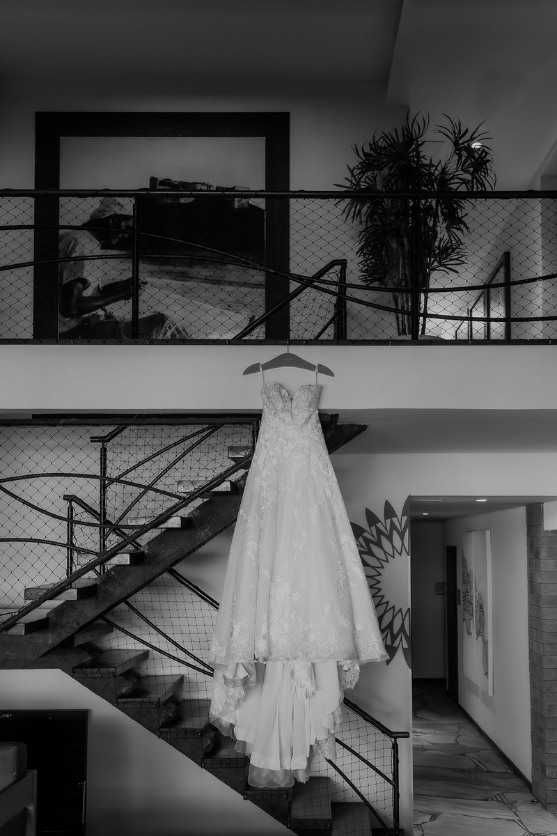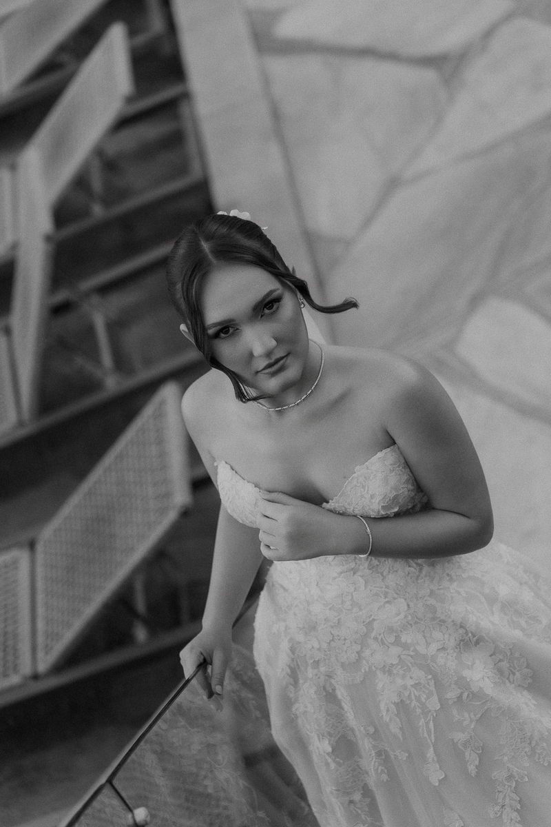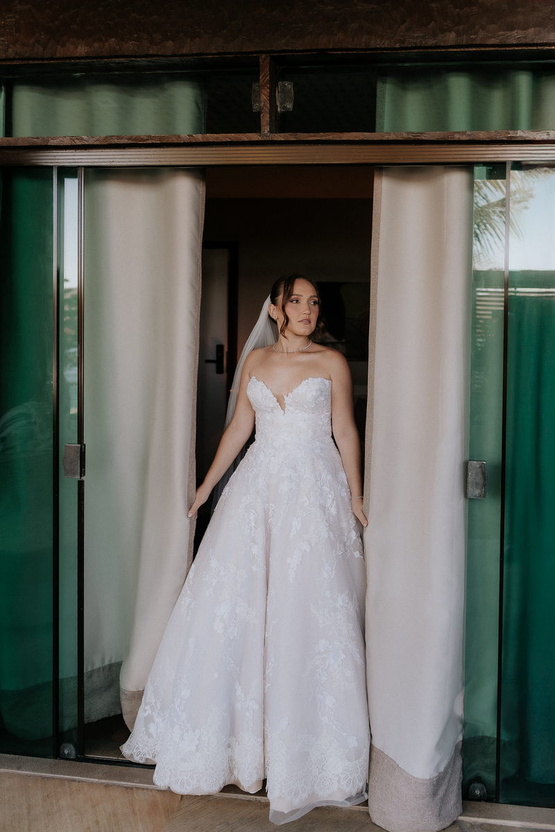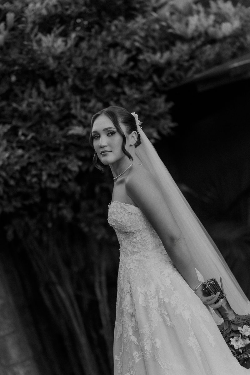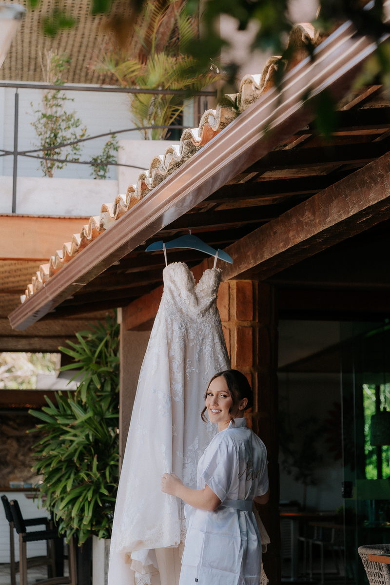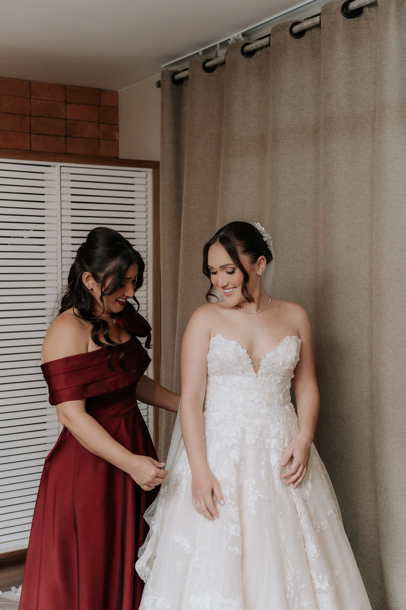 Lethycia estava absolutamente deslumbrante de noiva. Seu vestido de noiva La Modelista era um modelo evasê com caimento impecável. O decote tomara-que-caia em formato de coração, com painel de tule, trouxe modernidade e sensualidade ao visual. A renda floral aplicada em toda a peça trazia bordados delicados que se estendiam do corpete estruturado até a saia. A cauda, com acabamento em renda, abria-se majestosamente sobre o chão.