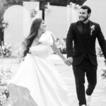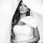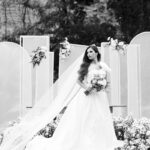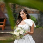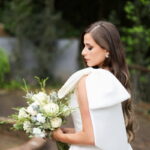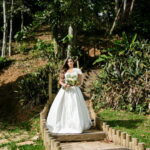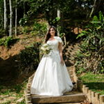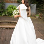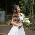 Logo no primeiro olhar, Eliana brilha com sua beleza e elegância. O seu vestido de noiva La Modelista tem uma leitura contemporânea do clássico: silhueta princesa com saia volumosa de caimento impecável e acabamento acetinado. No busto, o ponto alto do design: um detalhe em laço assimétrico no ombro. O decote acompanha essa proposta de assimetria elegante, equilibrando estrutura e suavidade, finalizando a peça com perfeição.