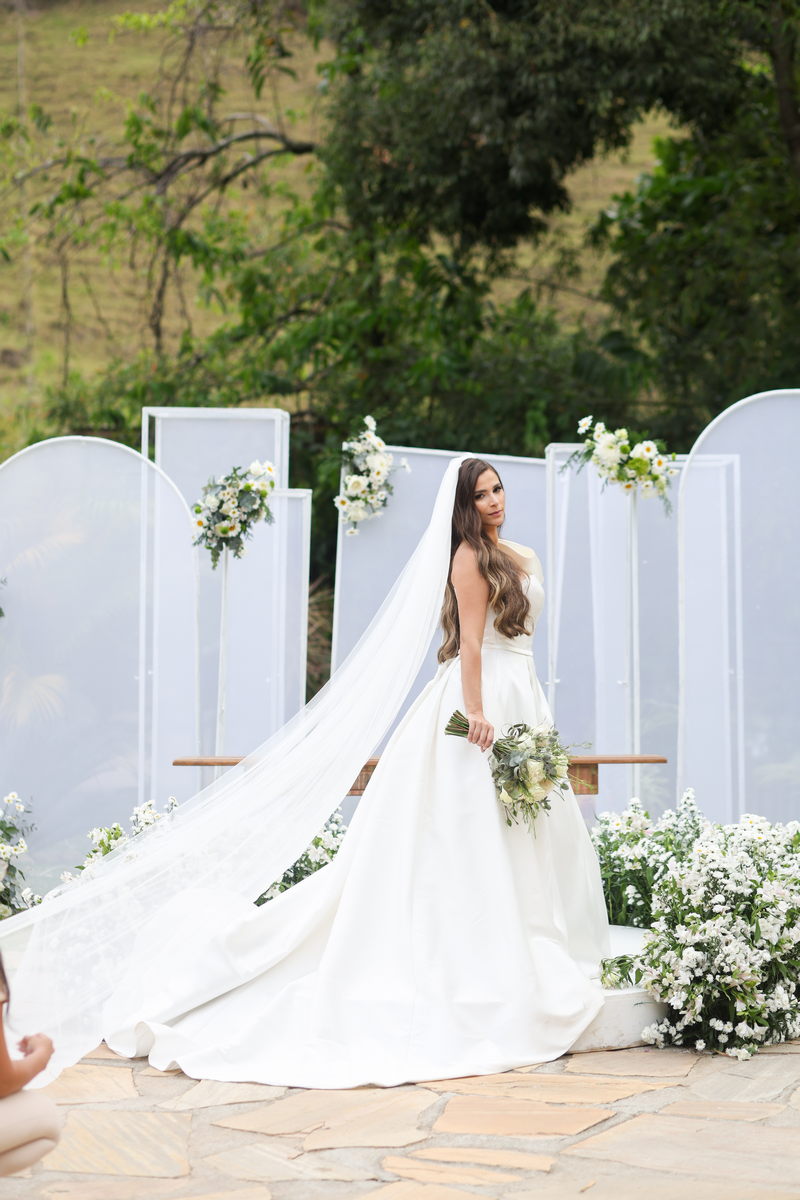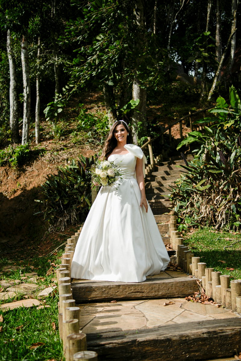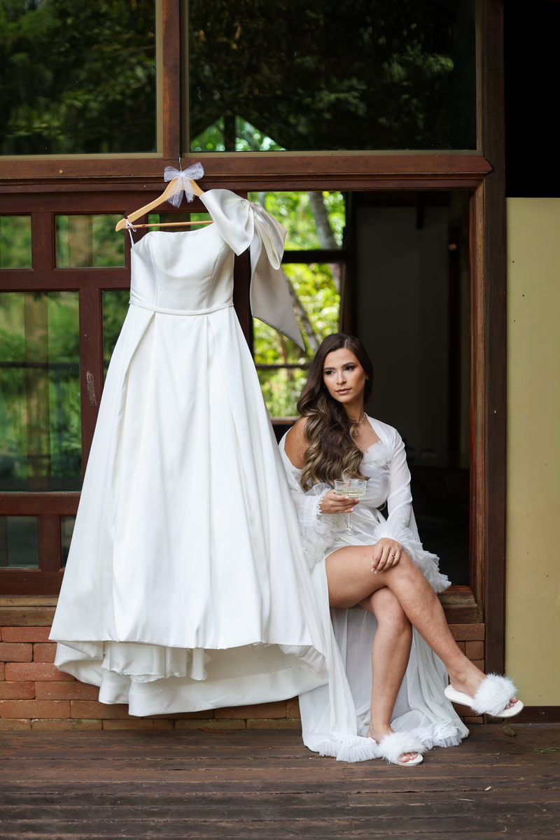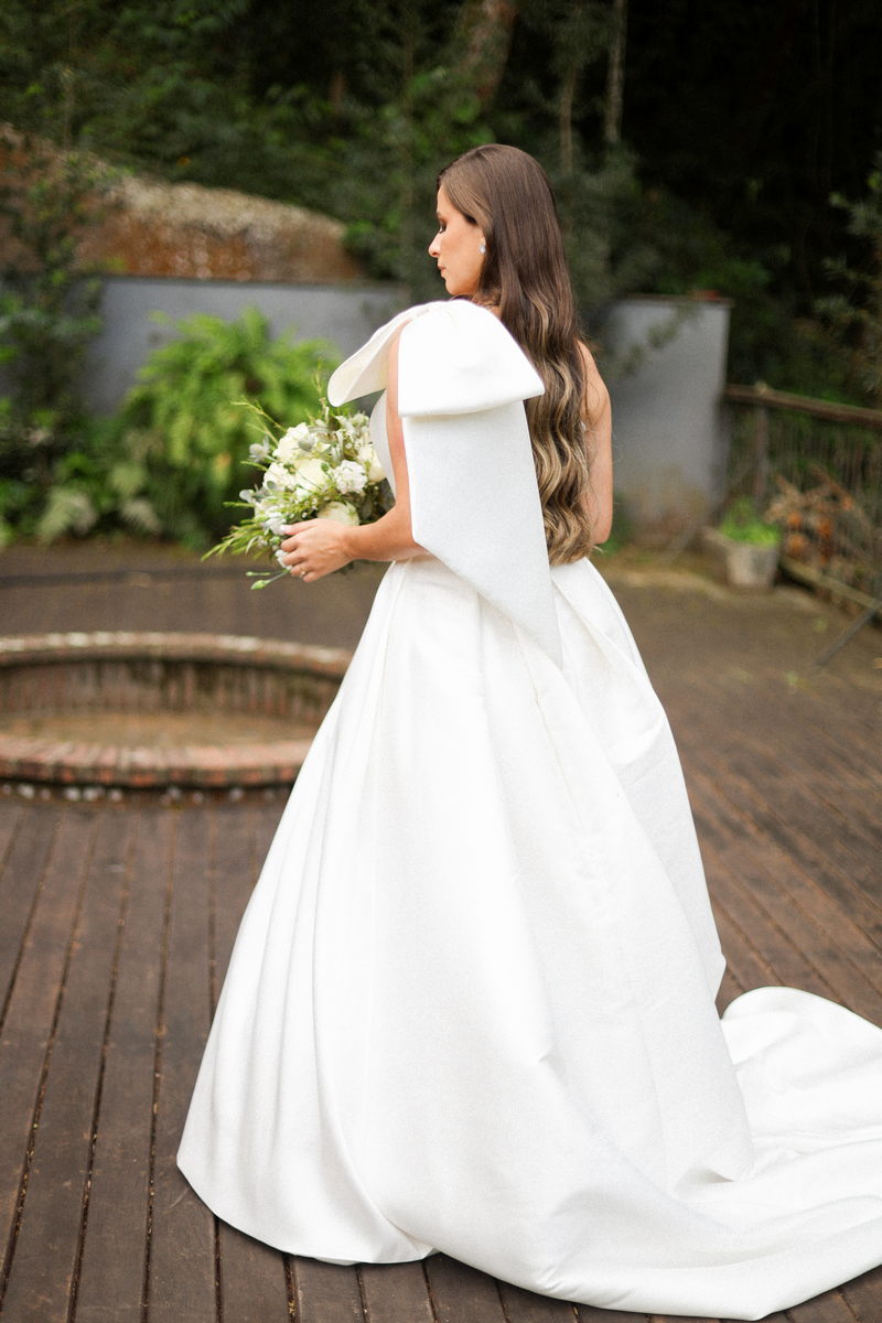 Logo no primeiro olhar, Eliana brilha com sua beleza e elegância. O seu vestido de noiva La Modelista tem uma leitura contemporânea do clássico: silhueta princesa com saia volumosa de caimento impecável e acabamento acetinado. No busto, o ponto alto do design: um detalhe em laço assimétrico no ombro. O decote acompanha essa proposta de assimetria elegante, equilibrando estrutura e suavidade, finalizando a peça com perfeição.