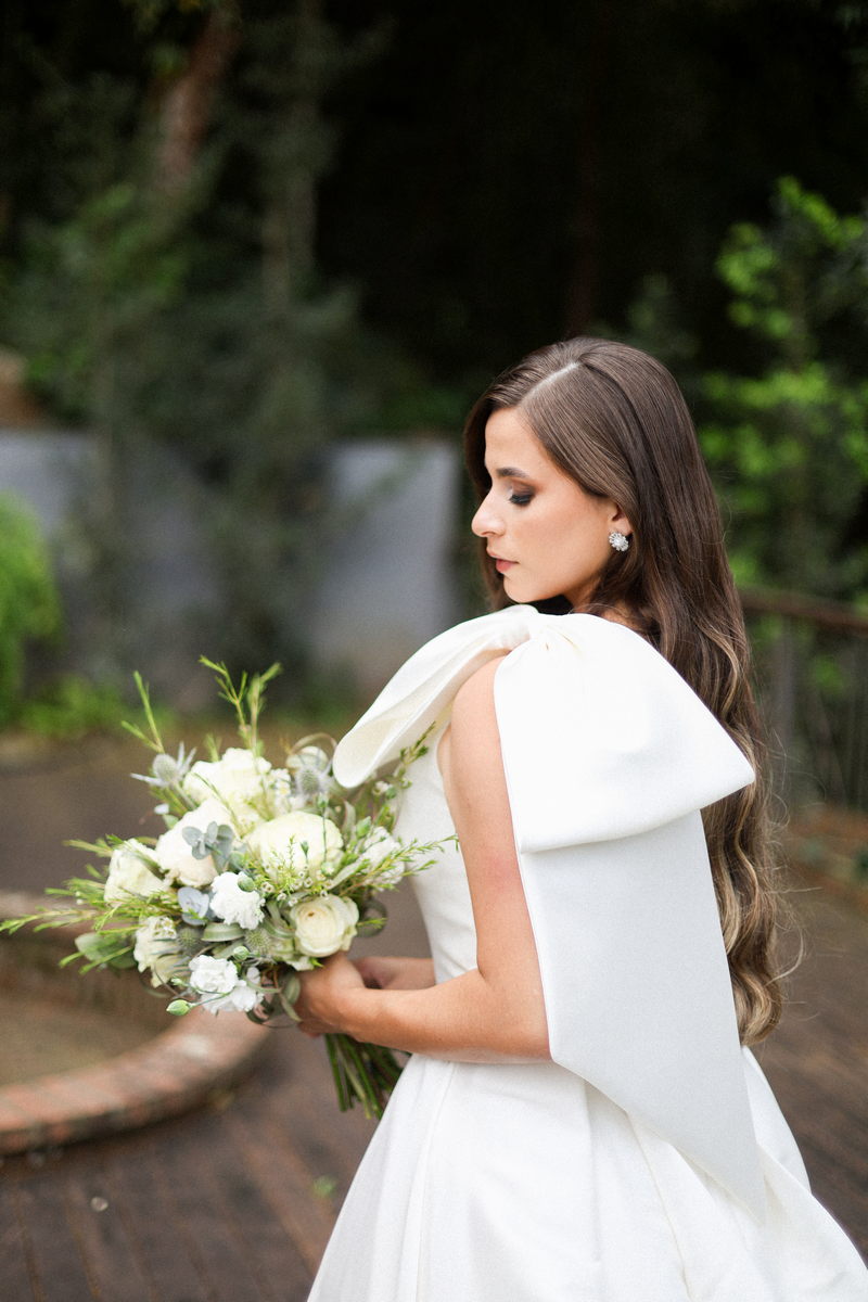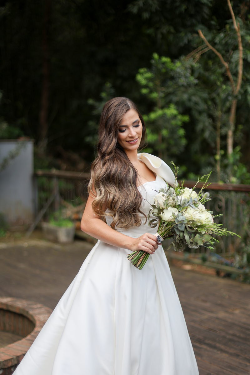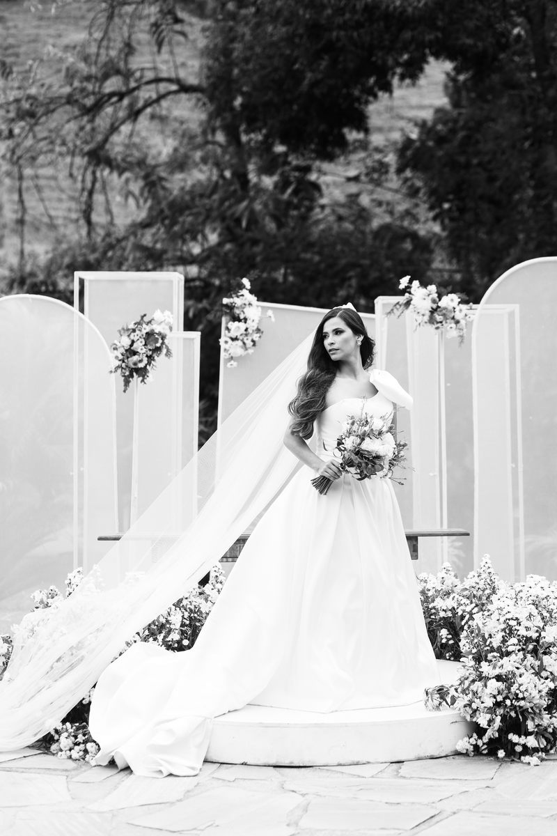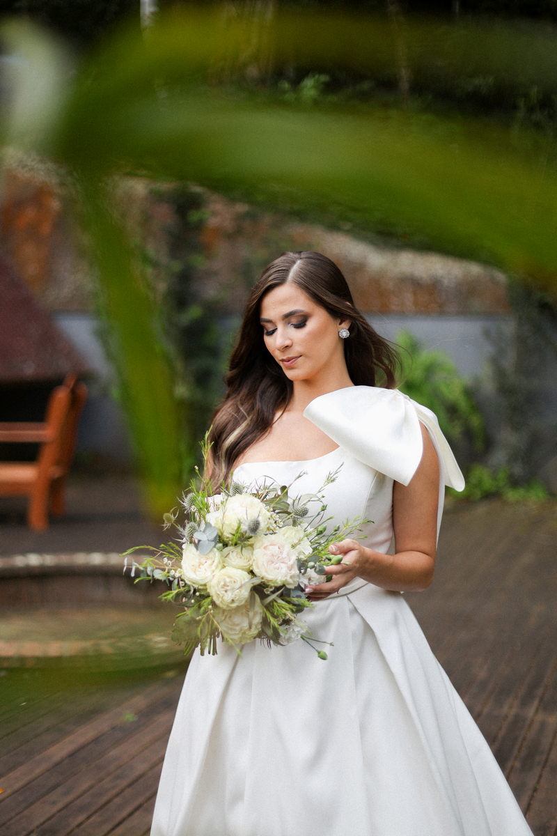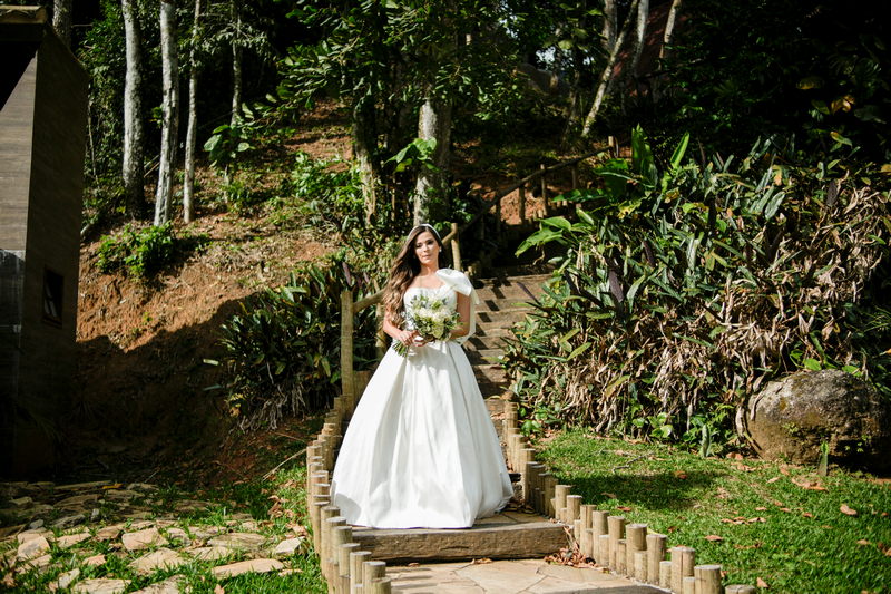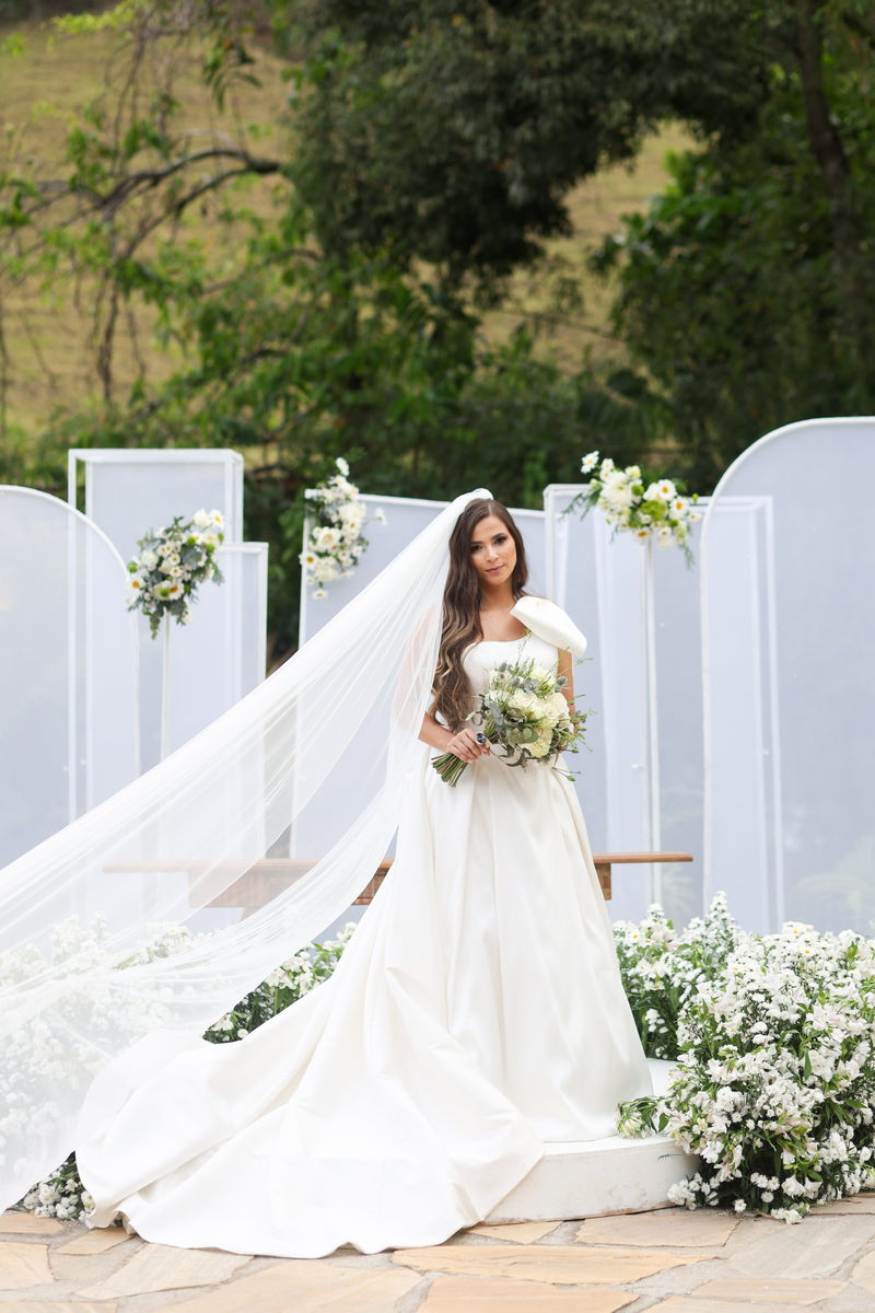 Logo no primeiro olhar, Eliana brilha com sua beleza e elegância. O seu vestido de noiva La Modelista tem uma leitura contemporânea do clássico: silhueta princesa com saia volumosa de caimento impecável e acabamento acetinado. No busto, o ponto alto do design: um detalhe em laço assimétrico no ombro. O decote acompanha essa proposta de assimetria elegante, equilibrando estrutura e suavidade, finalizando a peça com perfeição.
