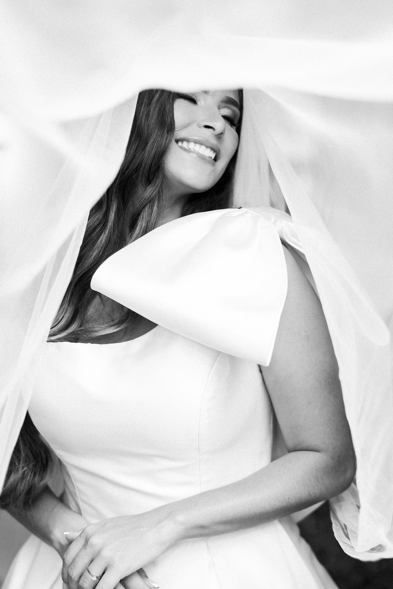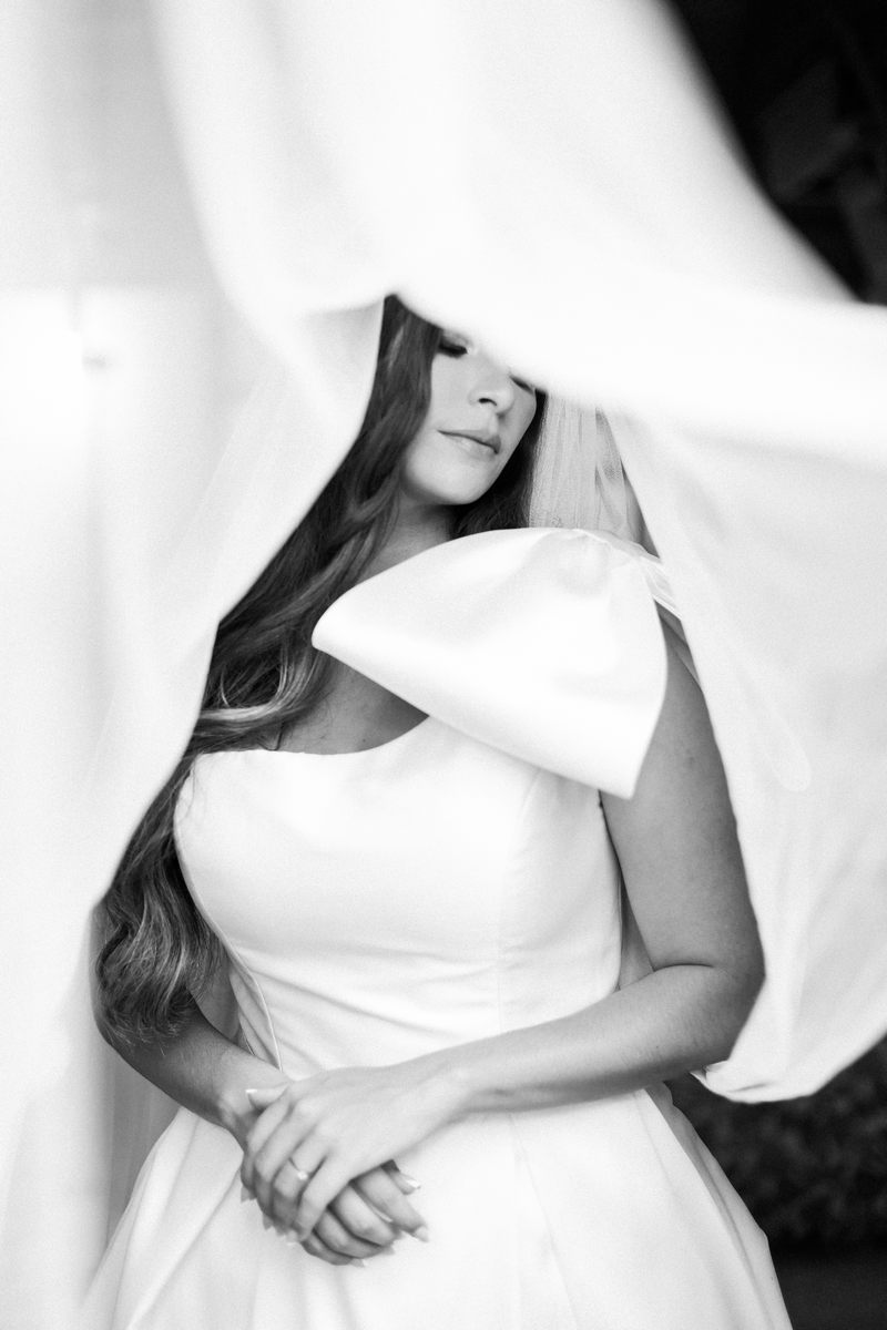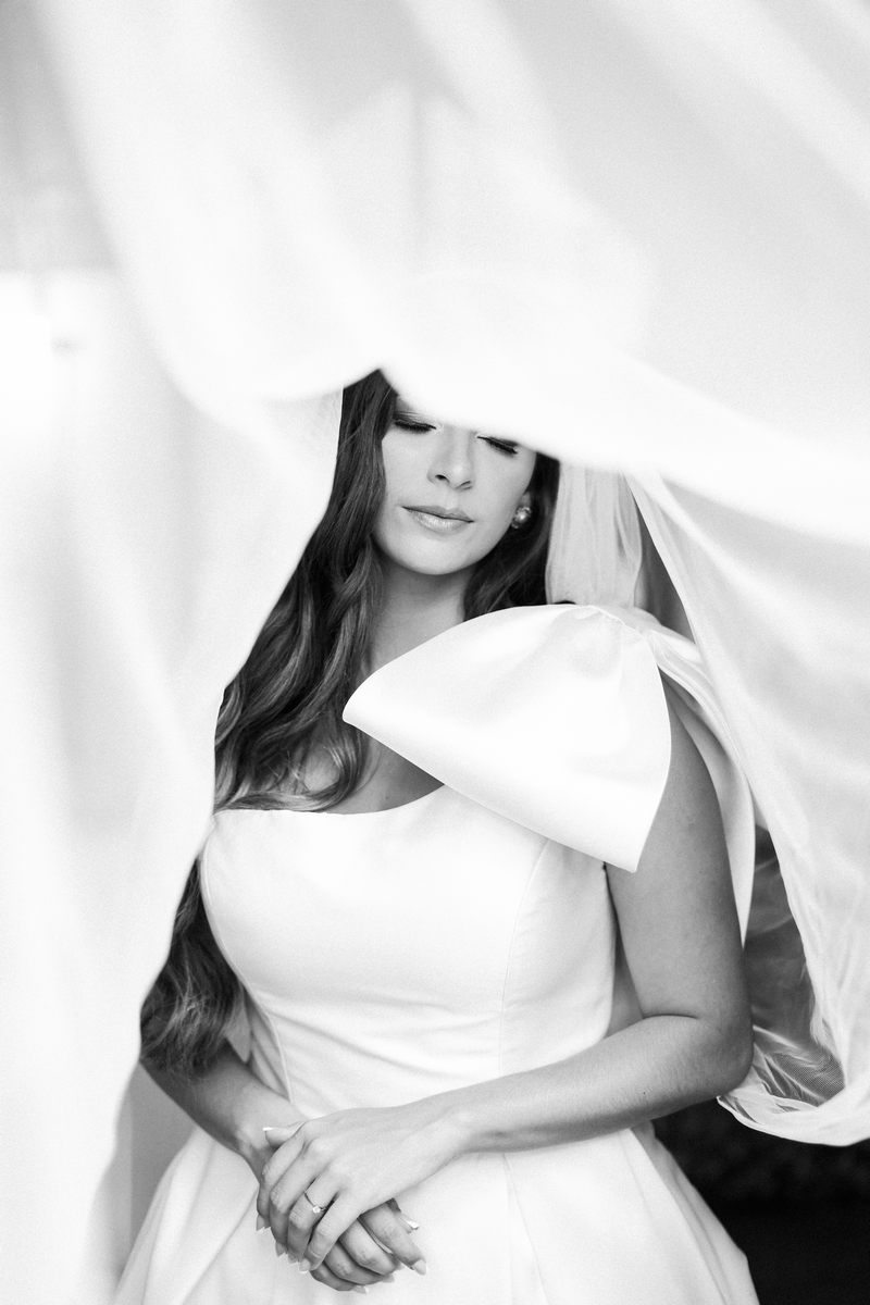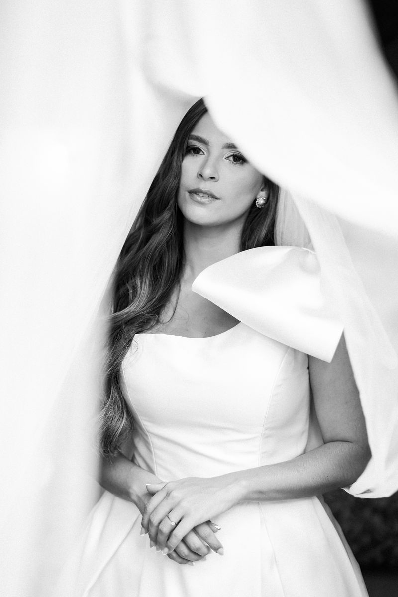 Logo no primeiro olhar, Eliana brilha com sua beleza e elegância. O seu vestido de noiva La Modelista tem uma leitura contemporânea do clássico: silhueta princesa com saia volumosa de caimento impecável e acabamento acetinado. No busto, o ponto alto do design: um detalhe em laço assimétrico no ombro. O decote acompanha essa proposta de assimetria elegante, equilibrando estrutura e suavidade, finalizando a peça com perfeição.