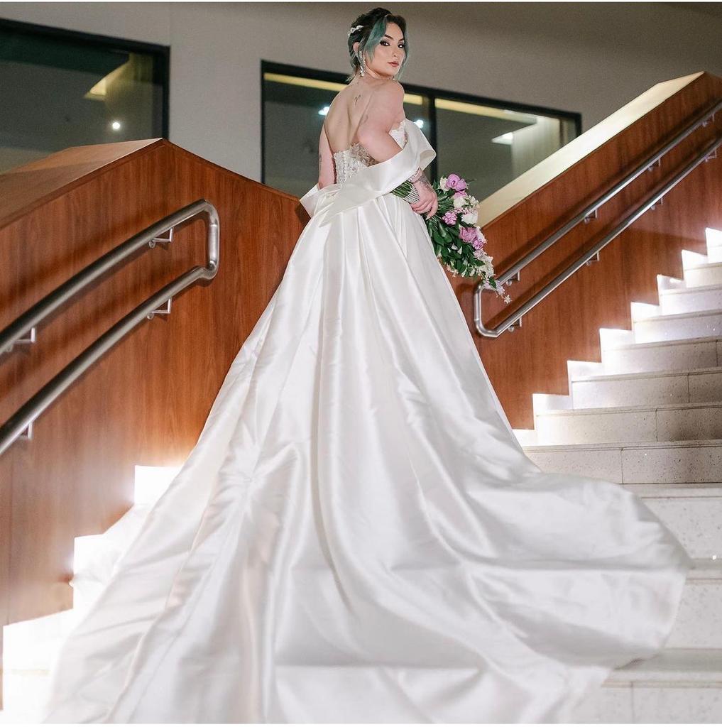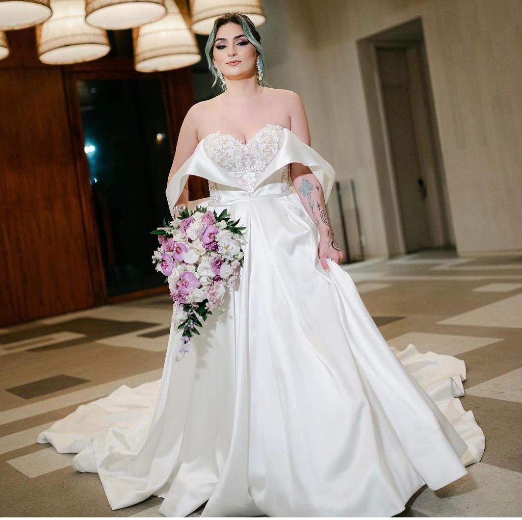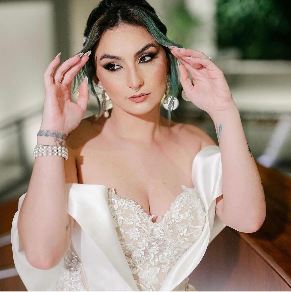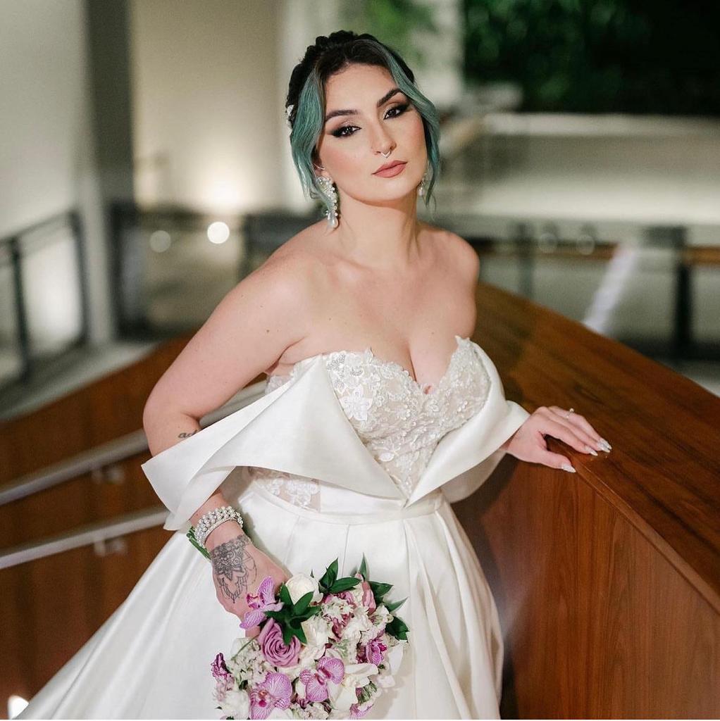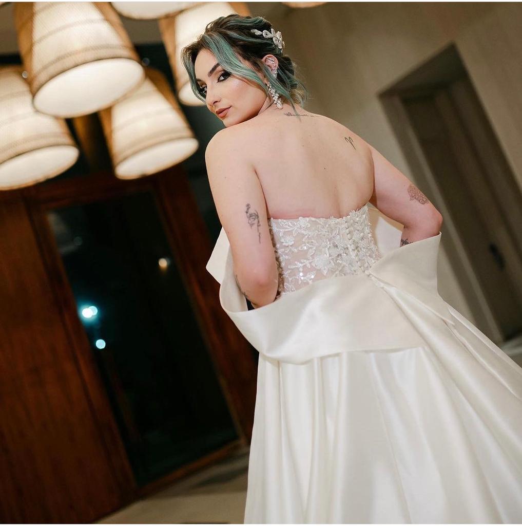 A protagonista da noite, a bela Letícia, estava uma visão de pura realeza em seu vestido de noiva da La Modelista. Um deslumbrante modelo estilo princesa, com um design tomara que caia singular. Seu belíssimo decote em formato de coração e os detalhes em renda no busto conferiram ao vestido um toque de elegância e romance, tornando-o verdadeiramente inesquecível. A beleza da noiva foi magistralmente realizada pela talentosa @thaisbenites, que complementou perfeitamente o visual da noiva, realçando sua beleza natural e garantindo que ela brilhasse ainda mais nesse dia especial.