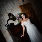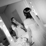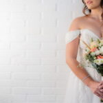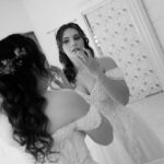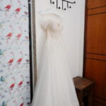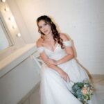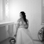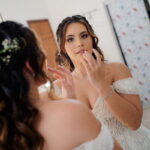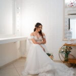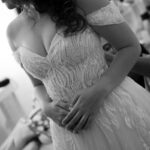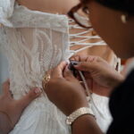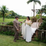 Julia estava radiante, cativando a todos com sua beleza e elegância. O vestido de noiva La Modelista, com uma modelagem ombro a ombro revelava delicadamente uma silhueta A-line que fluía com leveza, a peça era um convite à admiração. O busto com decote em formato de coração, era adornado com aplicações em renda delicadas, que seguiam até as mangas. O tecido principal era uma renda rica, com bordados florais e de folhas que se espalhavam por toda a peça, pontuados por aplicações de sequins e pérolas que conferiam um brilho discreto e sofisticado. A saia, composta por camadas e detalhes em renda, garantia um caimento fluido e gracioso, finalizando em uma cauda romântica que se movia harmoniosamente a cada passo da noiva.