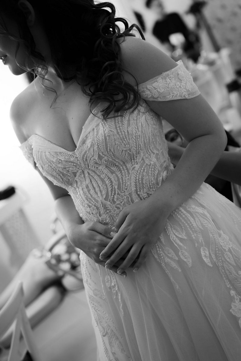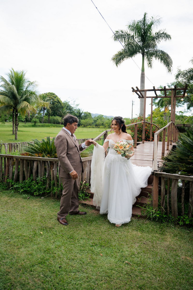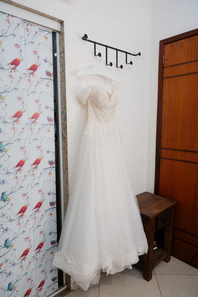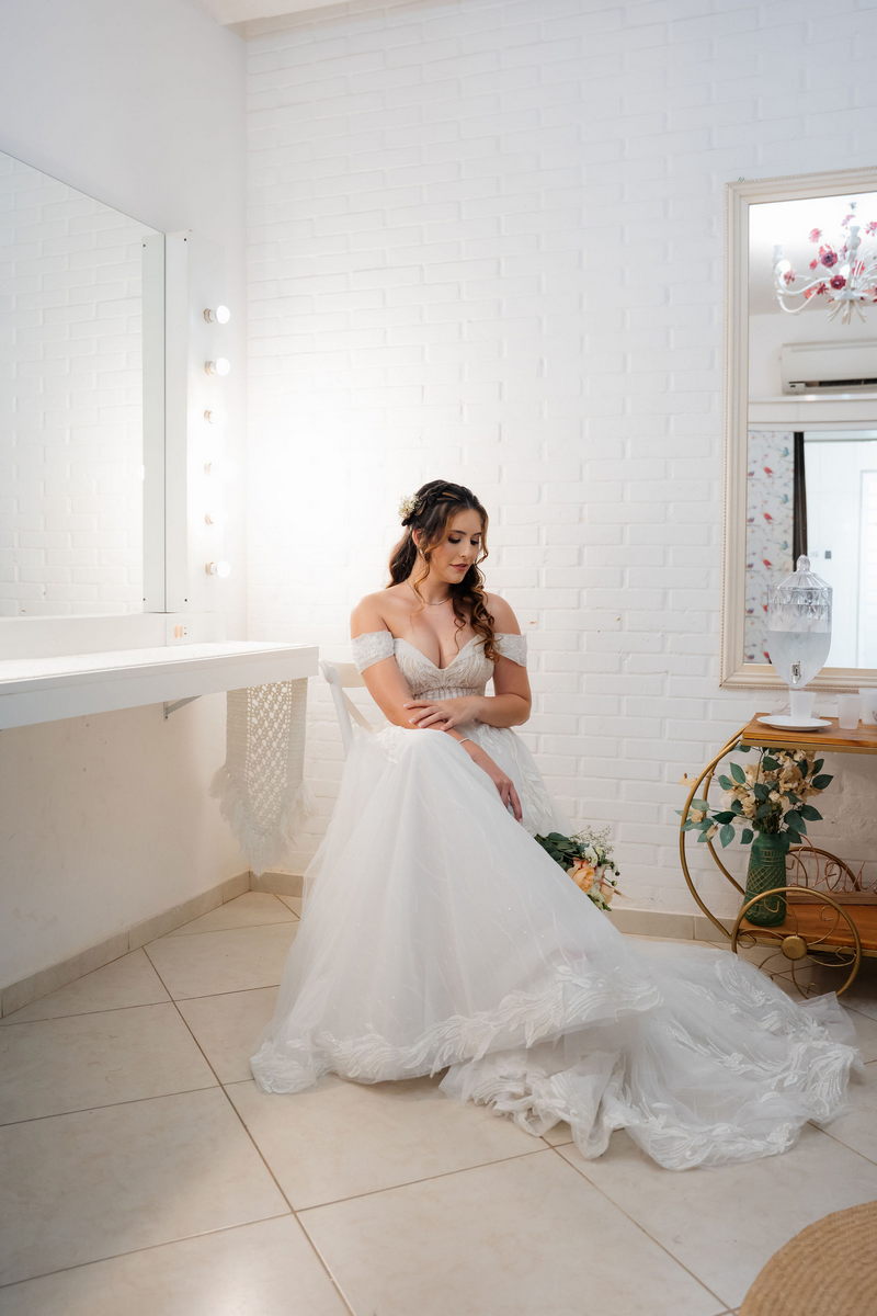 Julia estava radiante, cativando a todos com sua beleza e elegância. O vestido de noiva La Modelista, com uma modelagem ombro a ombro revelava delicadamente uma silhueta A-line que fluía com leveza, a peça era um convite à admiração. O busto com decote em formato de coração, era adornado com aplicações em renda delicadas, que seguiam até as mangas. O tecido principal era uma renda rica, com bordados florais e de folhas que se espalhavam por toda a peça, pontuados por aplicações de sequins e pérolas que conferiam um brilho discreto e sofisticado. A saia, composta por camadas e detalhes em renda, garantia um caimento fluido e gracioso, finalizando em uma cauda romântica que se movia harmoniosamente a cada passo da noiva.