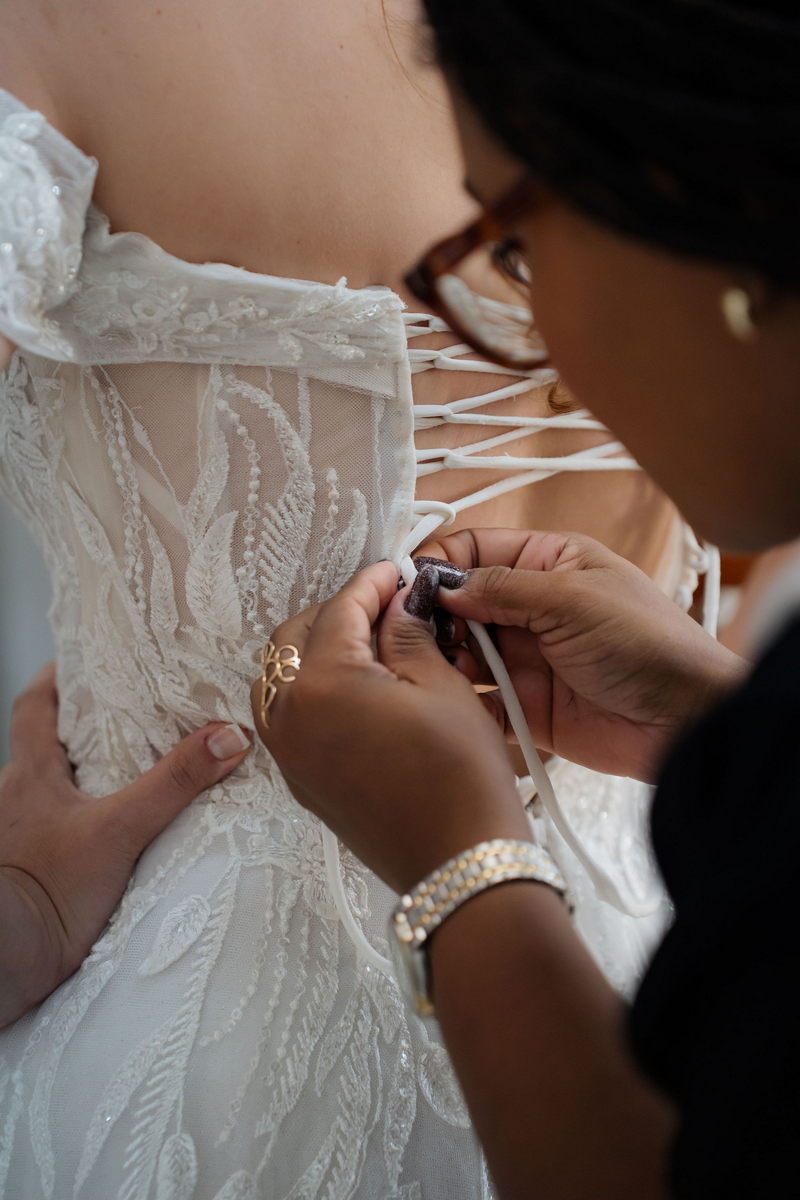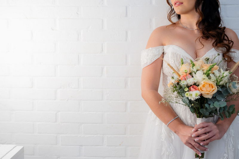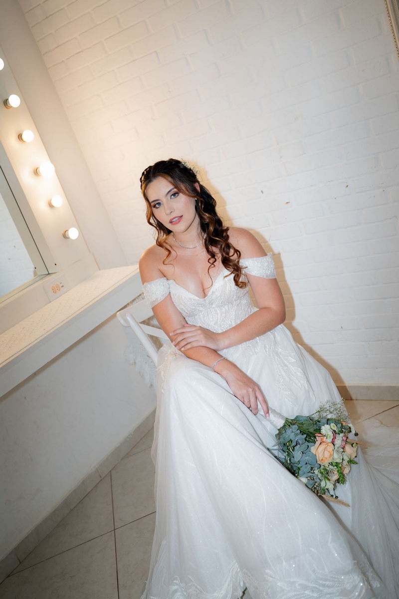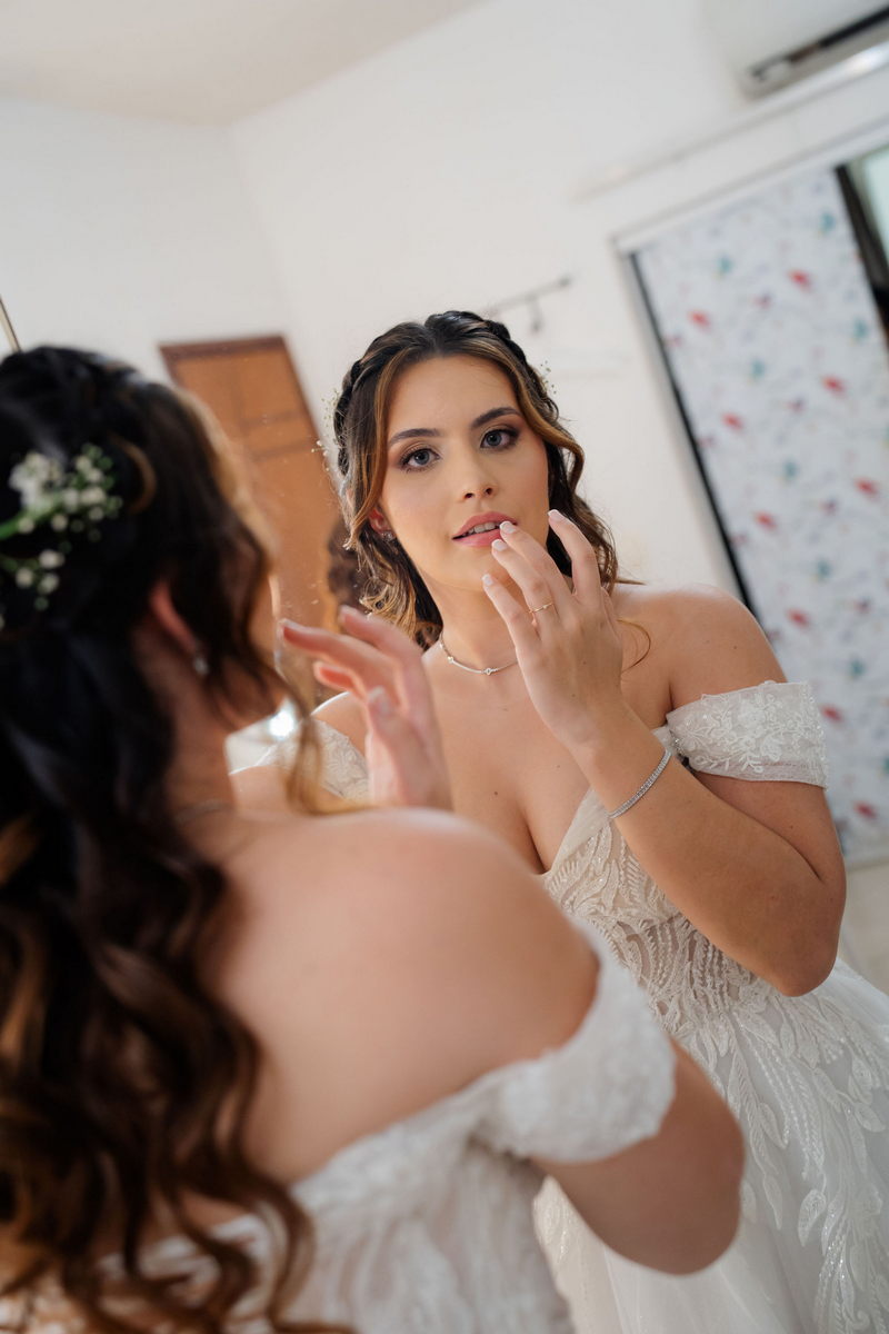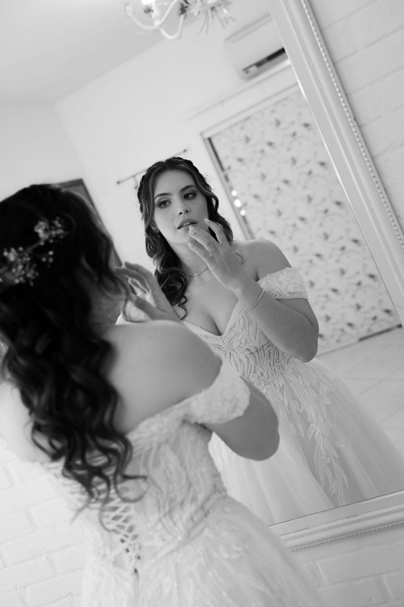 Julia estava radiante, cativando a todos com sua beleza e elegância. O vestido de noiva La Modelista, com uma modelagem ombro a ombro revelava delicadamente uma silhueta A-line que fluía com leveza, a peça era um convite à admiração. O busto com decote em formato de coração, era adornado com aplicações em renda delicadas, que seguiam até as mangas. O tecido principal era uma renda rica, com bordados florais e de folhas que se espalhavam por toda a peça, pontuados por aplicações de sequins e pérolas que conferiam um brilho discreto e sofisticado. A saia, composta por camadas e detalhes em renda, garantia um caimento fluido e gracioso, finalizando em uma cauda romântica que se movia harmoniosamente a cada passo da noiva.