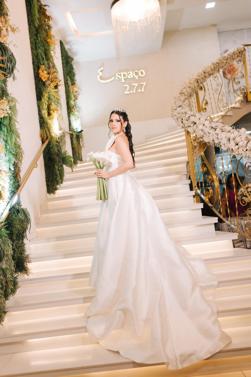O grande destaque da noite foi, sem dúvida, a noiva Evelyn com seu deslumbrante vestido de noiva La Modelista. A peça, de uma beleza encantadora, apresentava linhas clássicas com toques modernos que refletiam perfeitamente sua personalidade única. O modelo tomara que caia, com um elegante detalhe assimétrico em um dos lados, valorizou sua silhueta de forma extraordinária, enquanto a saia volumosa estilo princesa criava um movimento etéreo a cada passo da noiva. Os detalhes meticulosos, como os delicados botões que adornavam toda a extensão da cauda, revelavam o primor da confecção e a excelência que a La Modelista traz para cada criação.